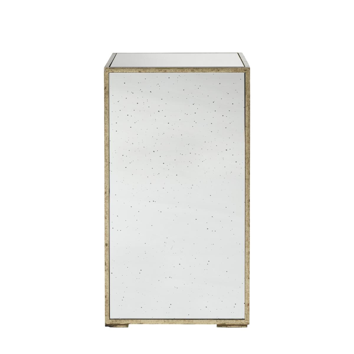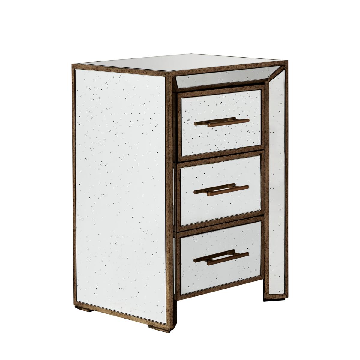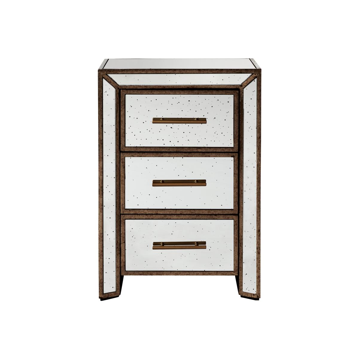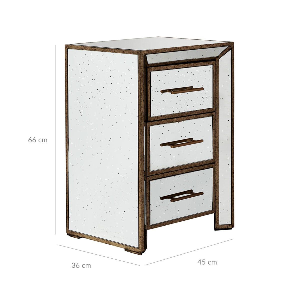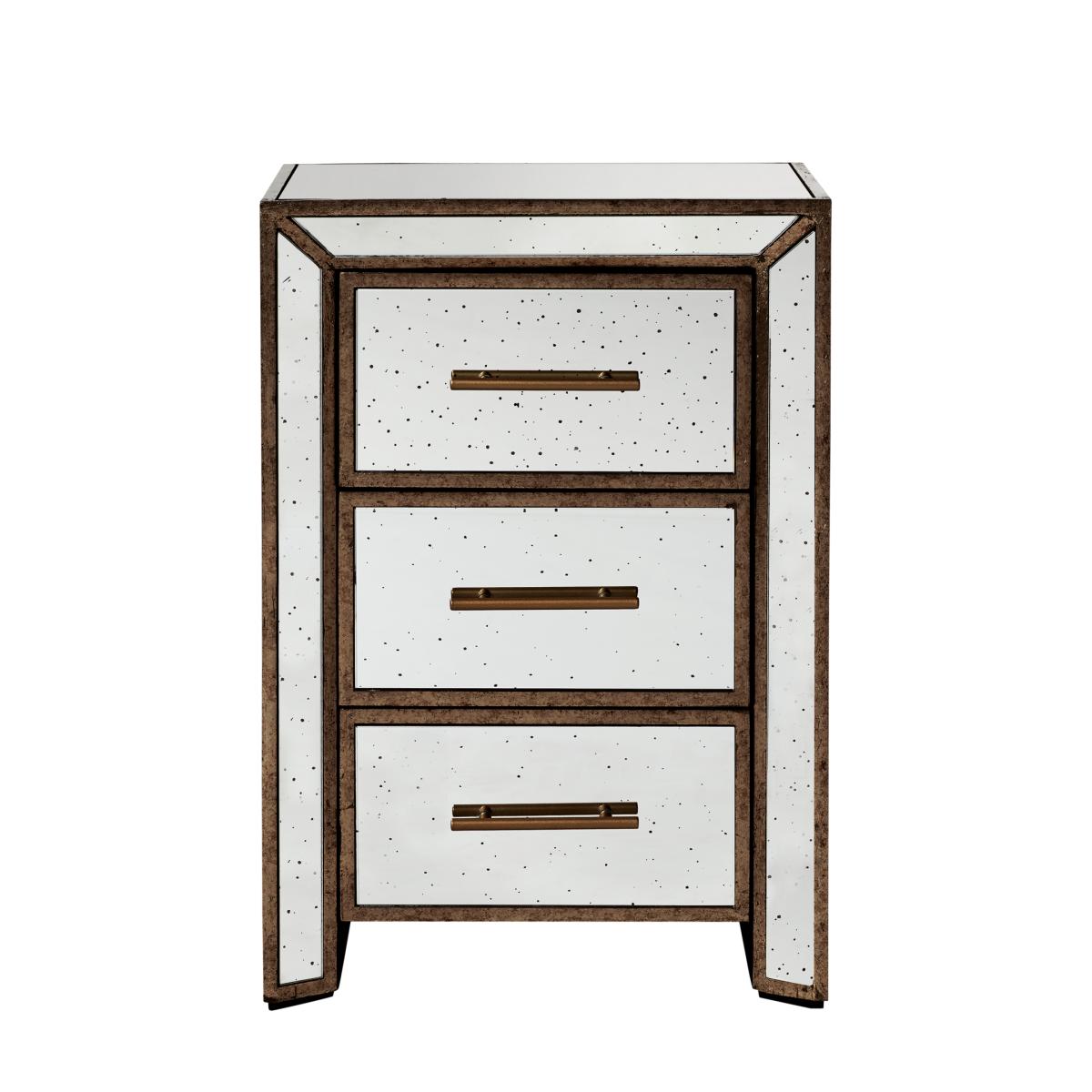 Both beautiful and practical, our Versailles Chest of Drawers is made from antiqued mirror glass panels set within frames distressed with an antique bronze colour, creating just the right amount of understated glamour. Versailles Side Table With Drawers - Antiqued Mirror