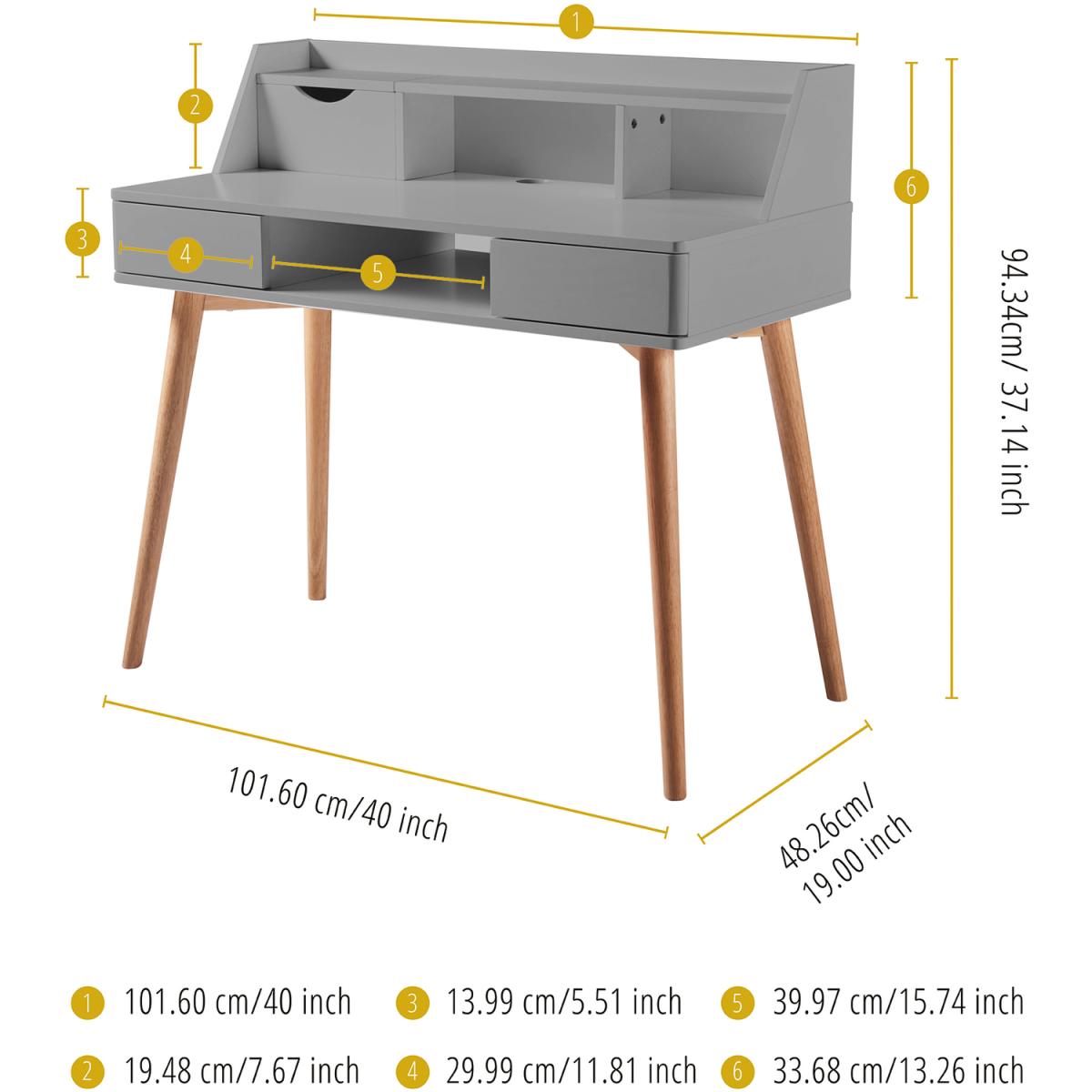 The Creativo Desk offers sleek style and high functionality. The simple lines of the grey desktop complement the angled, natural-finish wooden legs for a unique and beautiful design that revamps iconic, postmodern shapes, and combines them with minimalism. Get into creative mode when you sit at the Creativo Desk that features two cubbies, and 3 drawers for maximum organization, functionality and style. This writing desk is easily assembled and comes with all assembly hardware.