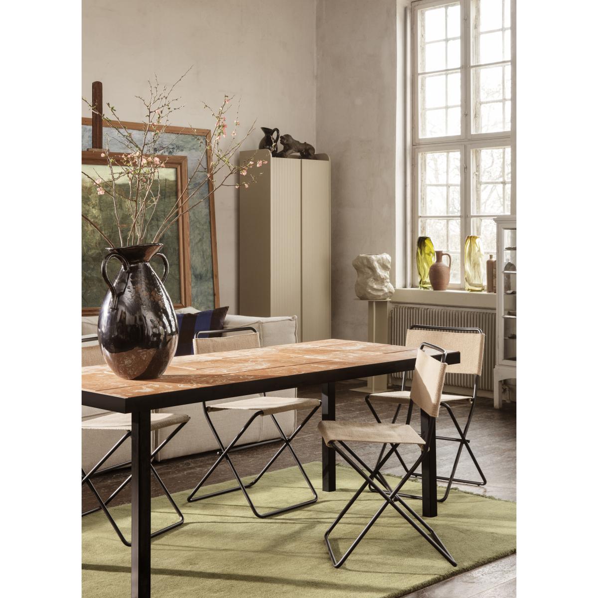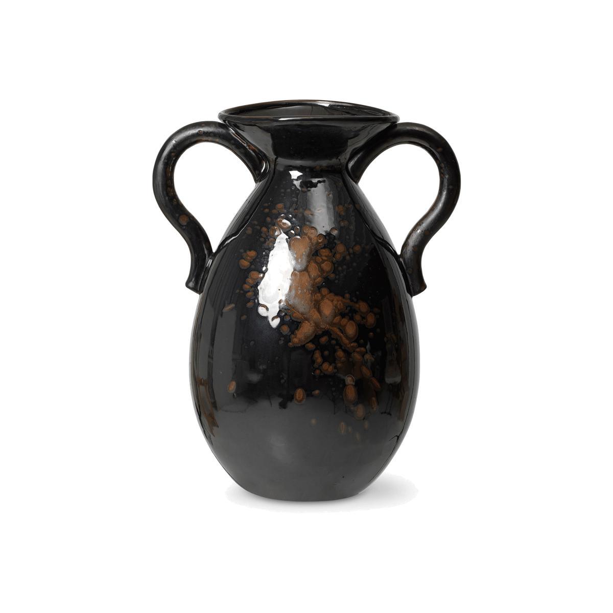 A neo-rustic feel for this stoneware vase decorated with two oversized handles. The Verso vase takes inspiration from the classic shapes of traditional pottery. The stoneware is highlighted by a reactive glossy glaze applied by hand, making each piece unique and revealing an exquisite artisanal flavour. The reactive glaze creates an irregular colouration: the dark brown stoneware is covered in lighter moiré patterns. This raw material is perfect for composing decoration with an authentic, natural feel. The Verso vase has the charm of old objects found at a flea market. Like objects that have lived a life and have a story to tell, it brings a romantic, warm note to your interior.