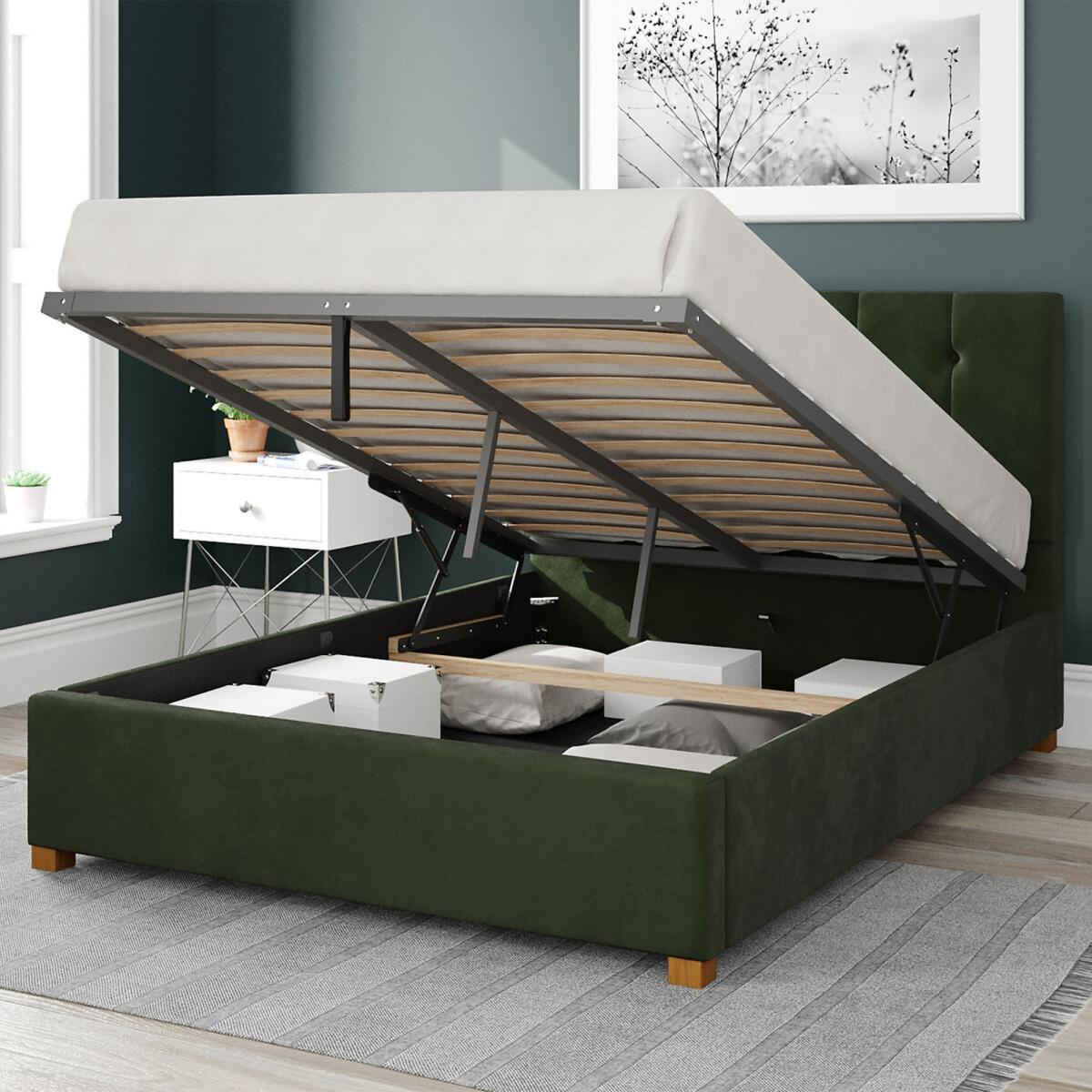 Please note: this product cannot be delivered to all Offshore Islands, Northern Island or Republic of Ireland. This product will be dispatched by one of our trusted suppliers. You’ll be contacted by their selected courier about your delivery. Please note this item will be delivered to your doorstep. Quality upholstered ottoman storage bed, hand crafted in the UK.Each headboard is constructed with deep foam padding perfect for sitting up in bed and reading. We believe quality has no short cuts, meaning all our designs are hand upholstered by our skilled craftsmen. Our UK ottoman design features chunky upholstered panels, which means it is built to last. Quality sprung slats improve comfort and mattress lifespan. The easy lift ottoman mechanism is supported with quality gas pistons, enabling the storage to be accessed with minimal effort. Once the ottoman is elevated it will hold position, allowing hands free access to storage. Our ottomans offer the perfect storage solutions for rooms with no or limited space with a spacious storage area of approximately 28cm. The fabric base attaches to the underside of the bed, protecting your stored items. Each ottoman is finished with hardwood feet which have been hand turned and varnished. Self Assembly Required. Swatch service: We offer a FREE swatch service. Please email samples@aspire-furniture.co.uk and include the below information:Please include 'La Redoute' in the title of your email. Name and address:Product: Hepburn Ottoman Bed. Fabric: Velvet. Colour: (in order to receive the correct colour please use the table below to identify correct reference)Your swatches will be delivered within 10 working days (subject to availability) Colour Description Colour to Request Forest Green Forest Green Berry Berry Slate Distressed Velvet - Slate Silver Coloured Silver Platinum Silver Coloured Distressed Velvet - Platinum Teal Teal Blush Pink Blush Steel Steel Ochre Ochre Ebony Black Ebony Navy Navy Light Grey Light Silver Emerald Emerald Duck Egg Blue Duck Egg Product Dimensions: Single: 112cmx100cmx209cm. Small Double: 112cmx130cmx209cm. Double: 112cmx147cmx209cmKing:112cmx160cmx219cm Super King: 112cmx190cmx219cm. Please remember to measure your available space before ordering. Packaged Dimensions: Single:Parcel 1 Packaged Dimensions 140cmx 113cmx 12cm Weight: 12kg Parcel 2 Packaged Dimensions 212cmx 32cmx 19cm Weight: 13kg Parcel 3 Packaged Dimensions 240cmx 180cmx 12cm Weight: 18kg. Small Double:Parcel 1 Packaged Dimensions 140cmx 113cmx 12cm Weight: 19kg Parcel 2 Packaged Dimensions 212cmx 32cmx 19cm Weight: 17kg Parcel 3 Packaged Dimensions 240cmx 180cmx 12cm Weight: 22kgDouble: Parcel 1 Packaged Dimensions 171cmx 113cmx 12cm Weight: 22kg Parcel 2 Packaged Dimensions 212cmx 32cmx 19 cm Weight: 18kg Parcel 3 Packaged Dimensions 240cmx 180cmx 12cm Weight: 23kgKing:. Parcel 1 Packaged Dimensions 171cmx 113cmx 12cm Weight: 27kg Parcel 2 Packaged Dimensions 212cmx 32cmx 19cm Weight: 22kg Parcel 3 Packaged Dimensions 240cmx 180cmx 12cm Weight: 25kg Super King:Parcel 1 Packaged Dimensions 201cmx 113cmx 12cm Weight: 30kg Parcel 2 Packaged Dimensions 212cmx 32cmx 19cm Weight: 25kg Parcel 3 Packaged Dimensions 240cmx 180cmx 12cm Weight: 27kg. Upholstered Fabric Composition: Velvet fabric