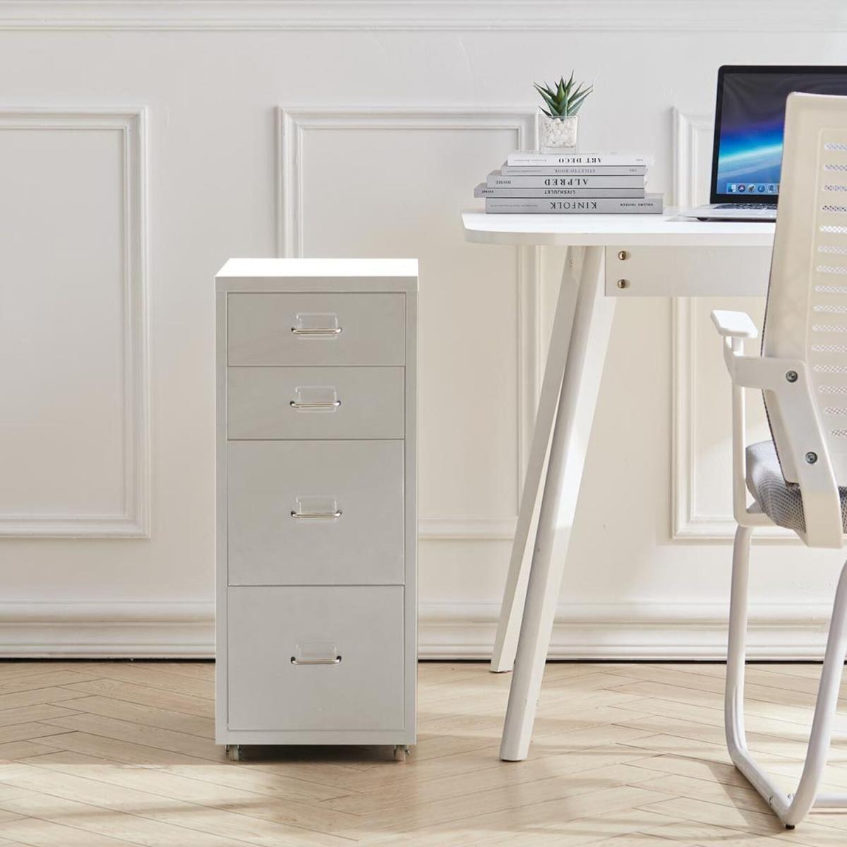 I love this four-drawer filing cabinet for its sleek, modern look that adds a touch of sophistication to home office spaces. Its silver-white finish is versatile, making it easy to pair with both contemporary and minimalist interiors, as well as more traditional setups when styled correctly. It works particularly well in organised, clutter-free environments-think sleek desks and tidy shelving. For practical styling tips, try pairing it with matching metallic accents or neutral-toned accessories for a cohesive look, and keep the top free for a small plant or decorative item to soften the utilitarian vibe. It's a great choice if you want functionality without sacrificing style.