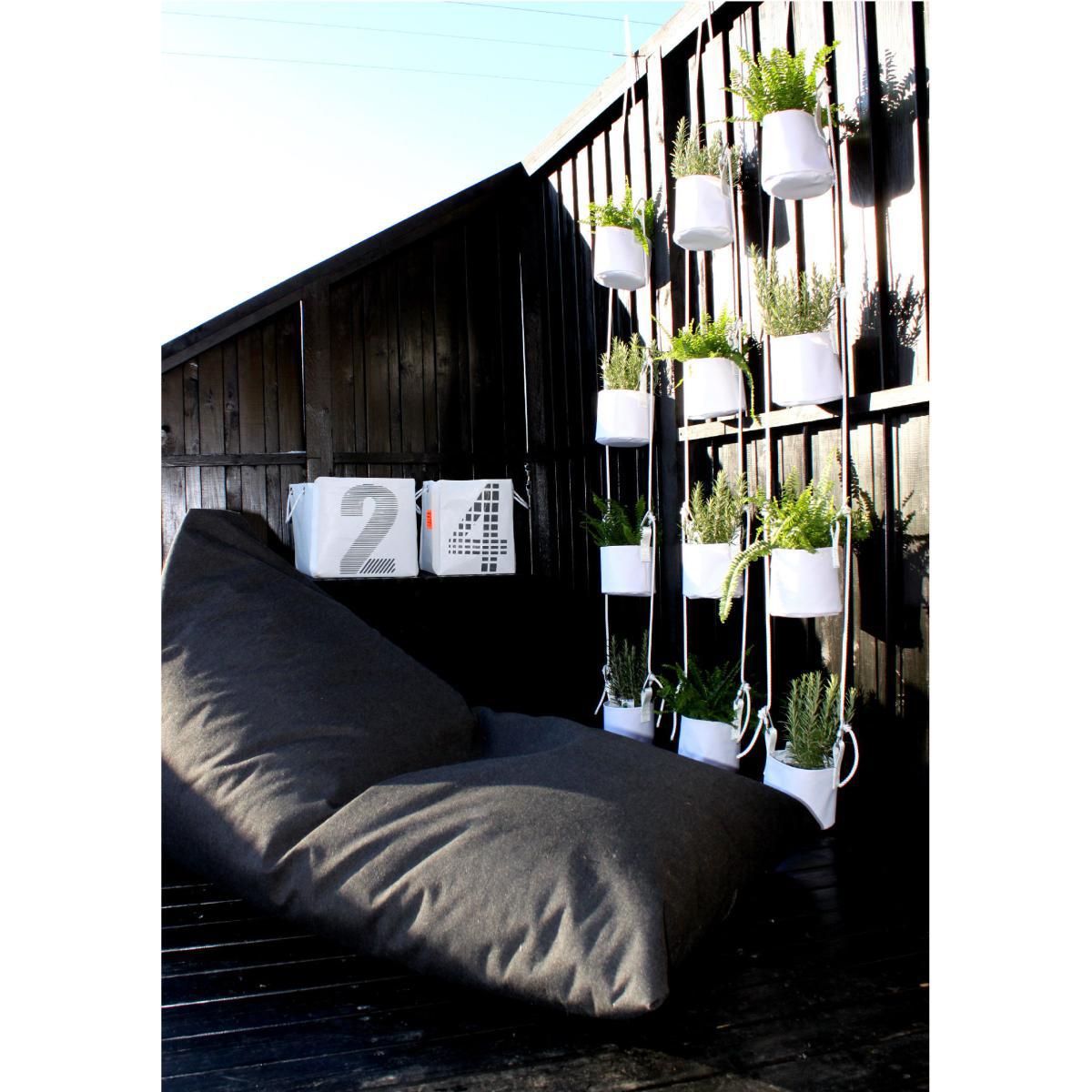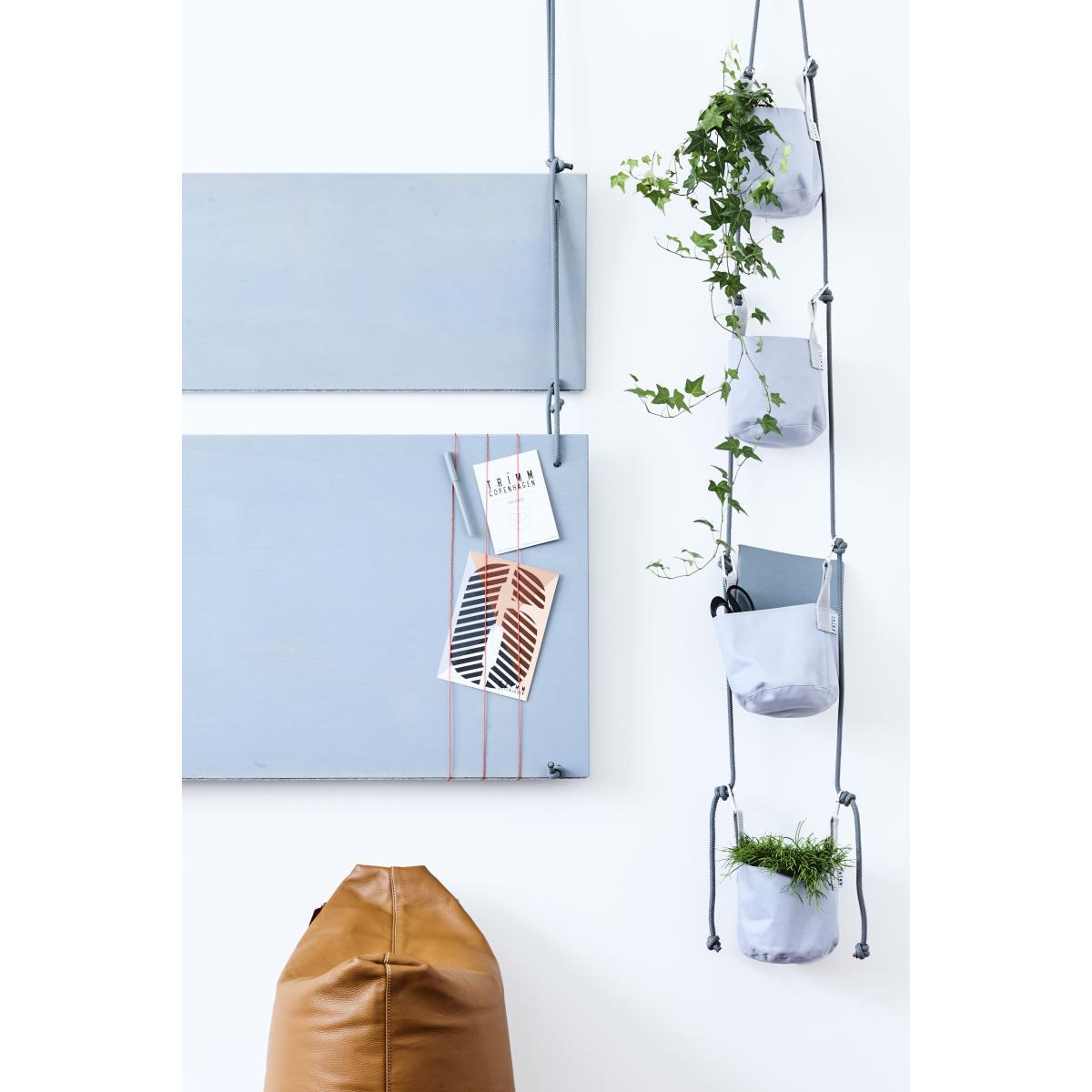 A beautiful and decorative flowers suspension, which in its simplicity gives life to your wall inside as well as out. Flowerpots are made of coated polyester and is waterproof. They are attached with aluminum carabiners in thick ropes. Material: 4 x pots + rope + 8 x carabiners. Dimensions: Pot dim: Ø 15 x H 14 x L200 cm.