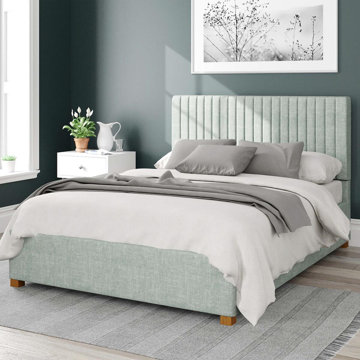 Please note: this product cannot be delivered to all Offshore Islands, Northern Island or Republic of Ireland. This product will be dispatched by one of our trusted suppliers. You’ll be contacted by their selected courier about your delivery. Please note this item will be delivered to your doorstep. Quality upholstered ottoman storage bed, hand crafted in the UK.Each headboard is constructed with deep foam padding perfect for sitting up in bed and reading. We believe quality has no short cuts, meaning all our designs are hand upholstered by our skilled craftsmen. Our UK ottoman design features chunky upholstered panels, which means it is built to last. Quality sprung slats improve comfort and mattress lifespan. The easy lift ottoman mechanism is supported with quality gas pistons, enabling the storage to be accessed with minimal effort. Once the ottoman is elevated it will hold position, allowing hands free access to storage. Our ottomans offer the perfect storage solutions for rooms with no or limited space with a spacious storage area of approximately 28cm. The fabric base attaches to the underside of the bed, protecting your stored items. Each ottoman is finished with hardwood feet which have been hand turned and varnished. Self Assembly Required. Swatch service: We offer a FREE swatch service. Please email samples@aspire-furniture.co.uk and include the below information:Please include 'La Redoute' in the title of your email. Name and address:Product: Grant Ottoman Bed. Fabric: Pure Pastel Cotton. Colour: (in order to receive the correct colour please use the table below to identify correct reference)Your swatches will be delivered within 10 working days (subject to availability) Colour Description Colour to Request Pale green Eau De Nil Storm Storm Tea Rose Tea Rose Product Dimensions: Single: 112cmx100cmx209cm. Small Double:112cmx130cmx209cmDouble:112cmx147cmx209cmKing:112cmx160cmx219cm Super King:112cmx190cmx219cm. Please remember to measure your available space before ordering. Single:Parcel 1 Packaged Dimensions 140cmx 113cmx 12cm Weight: 12kg Parcel 2 Packaged Dimensions 212cmx 32cmx 19cm Weight: 13kg Parcel 3 Packaged Dimensions 240cmx 180cmx 12cm Weight: 18kg. Small Double:Parcel 1 Packaged Dimensions 140cmx 113cmx 12cm Weight: 19kg Parcel 2 Packaged Dimensions 212cmx 32cmx 19cm Weight: 17kg Parcel 3 Packaged Dimensions 240cmx 180cmx 12cm Weight: 22kgDouble: Parcel 1 Packaged Dimensions 171cmx 113cmx 12cm Weight: 22kg Parcel 2 Packaged Dimensions 212cmx 32cmx 19 cm Weight: 18kg Parcel 3 Packaged Dimensions 240cmx 180cmx 12cm Weight: 23kgKing:. Parcel 1 Packaged Dimensions 171cmx 113cmx 12cm Weight: 27kg Parcel 2 Packaged Dimensions 212cmx 32cmx 19cm Weight: 22kg Parcel 3 Packaged Dimensions 240cmx 180cmx 12cm Weight: 25kg Super King:Parcel 1 Packaged Dimensions 201cmx 113cmx 12cm Weight: 30kg Parcel 2 Packaged Dimensions 212cmx 32cmx 19cm Weight: 25kg Parcel 3 Packaged Dimensions 240cmx 180cmx 12cm Weight: 27kg. Upholstered Fabric Composition: Cotton