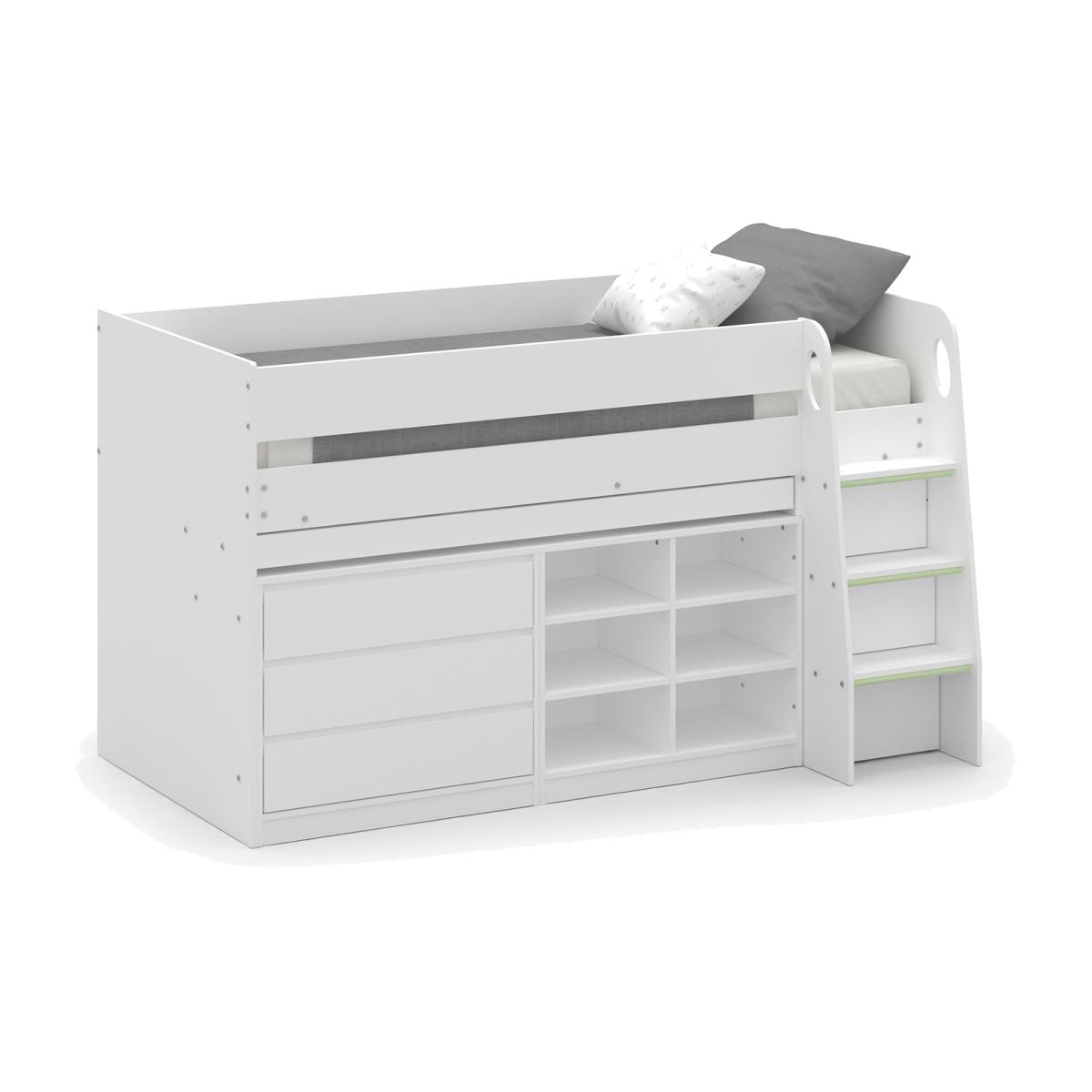 The Vespa Midsleeper is the perfect space saver for kids and teenagers bedrooms. Finished in all white, the midsleeper features cupboards, multiple shelves and a pull out desk. The robust ladder contains beautiful handles, with glow in the dark strips added for safety.