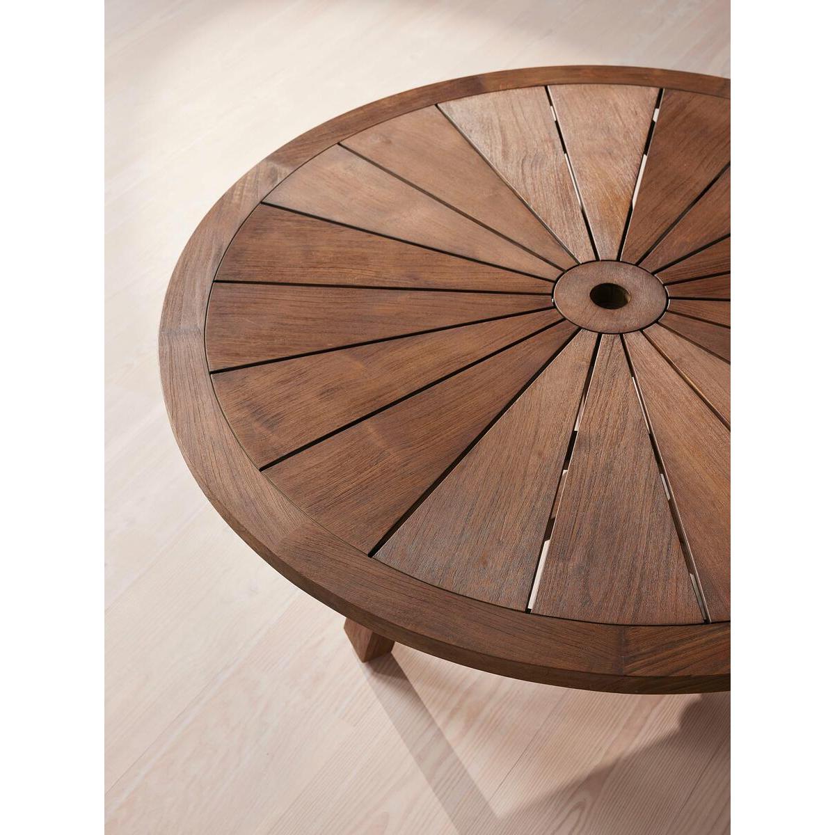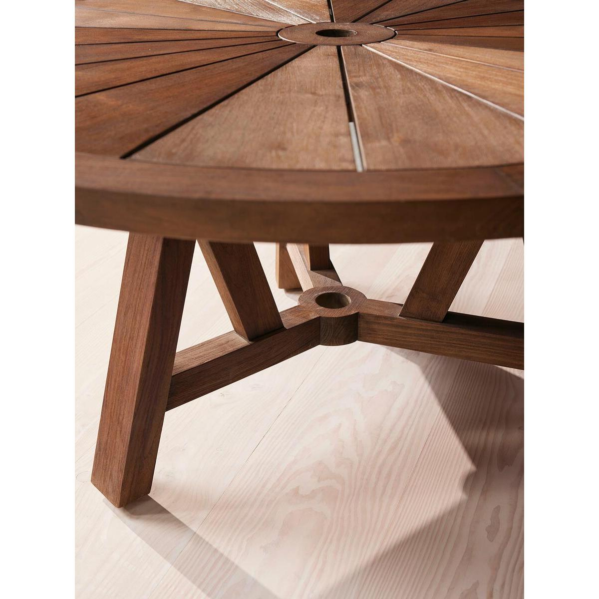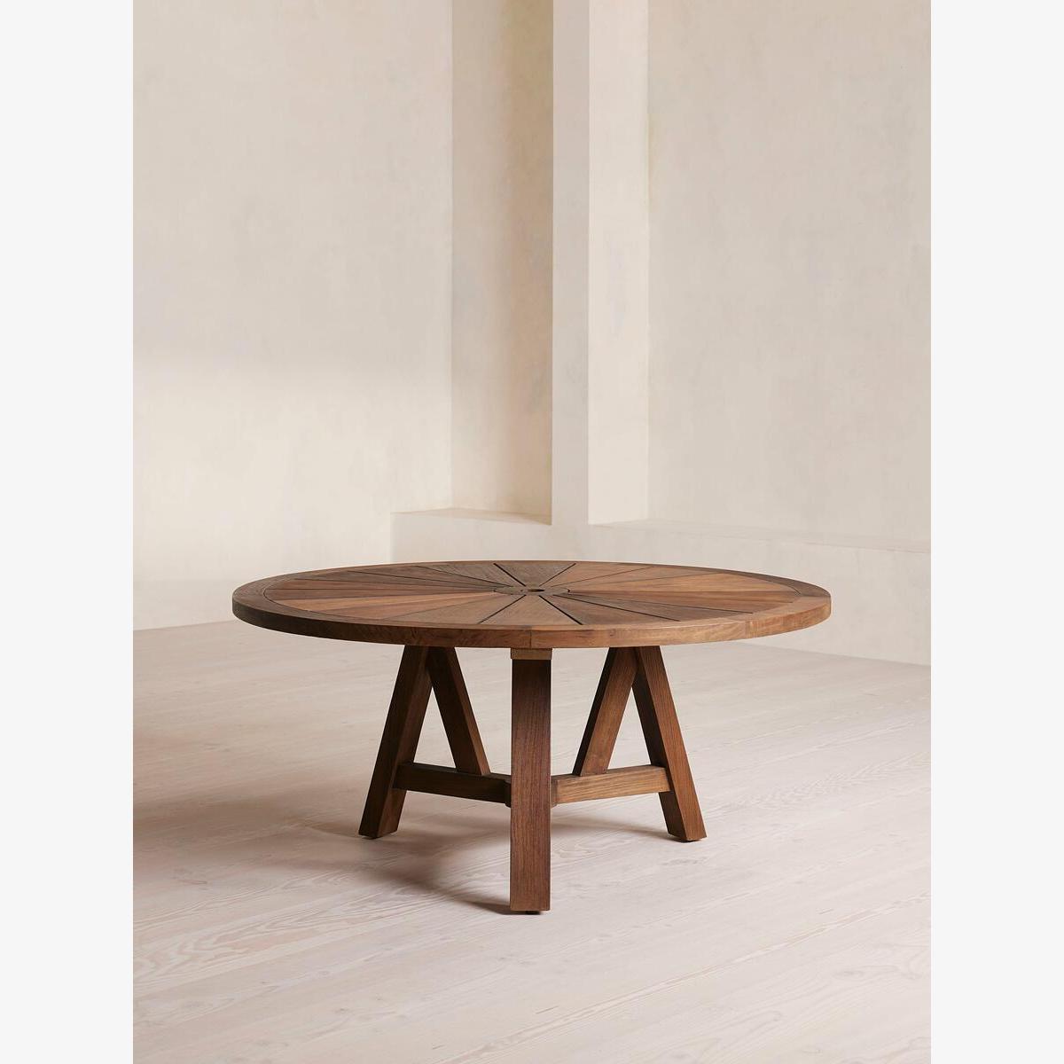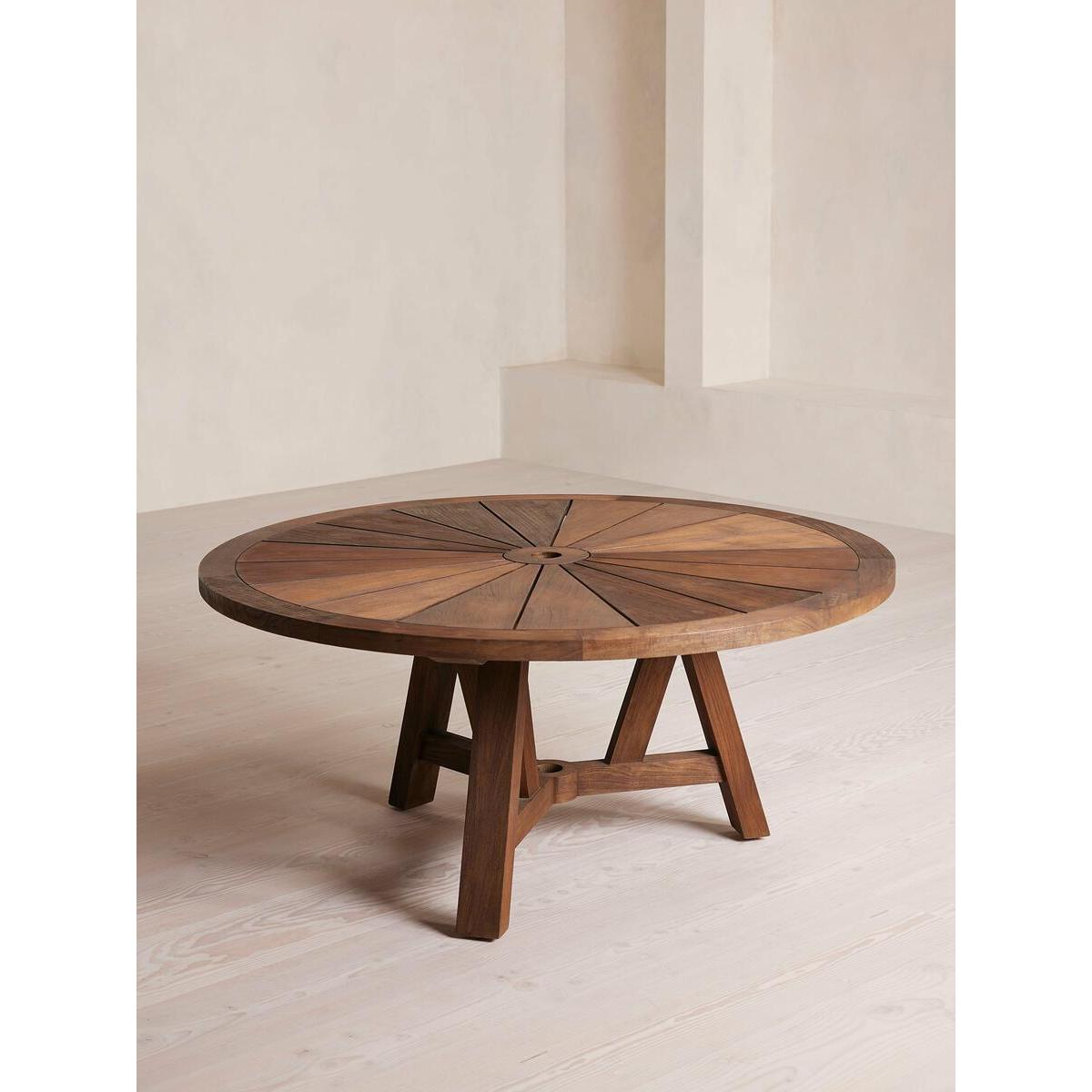 Our Vestini outdoor dining table can seat up to eight people, making it ideal for larger gatherings in the garden. Inspired by Soho House Rome, the round design in dark stain teak has a wire brush finish to add interest and texture, as well as a classic starburst top fitted with a parasol hole. The trestle base allows for easy manoeuvring, as well as more leg room when dining outdoors. Outdoor dining table Solid teak in dark stain Wire brush finish Round starburst top Parasol hole Trestle base Inspired by Soho House Rome