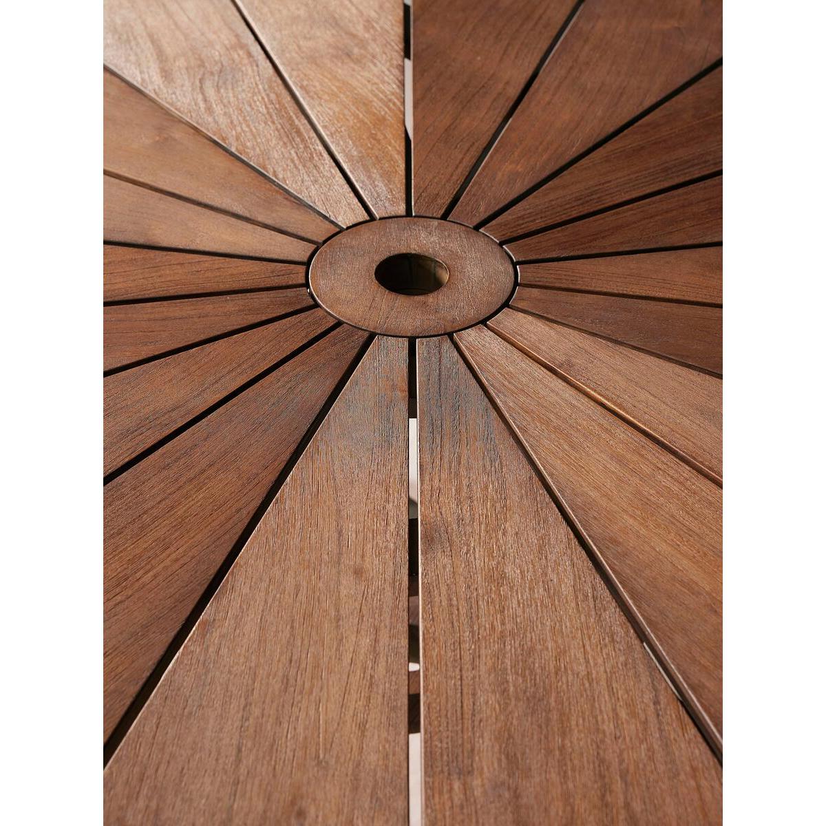 I really like this table because of its robust yet refined look, thanks to the wirebrushed stained teak finish. It’s a great piece for both modern and rustic interiors, where it can add warmth and texture. The round shape makes it versatile for smaller spaces or intimate dining set-ups, and it works beautifully with a mix of chair styles, from upholstered to minimalist wooden designs. Practical styling tips include pairing it with layered textiles like woven placemats or a simple runner, and adding greenery or statement lighting above to soften the look. Its sturdy construction makes it ideal for everyday use, while its natural finish keeps it feeling approachable and timeless.