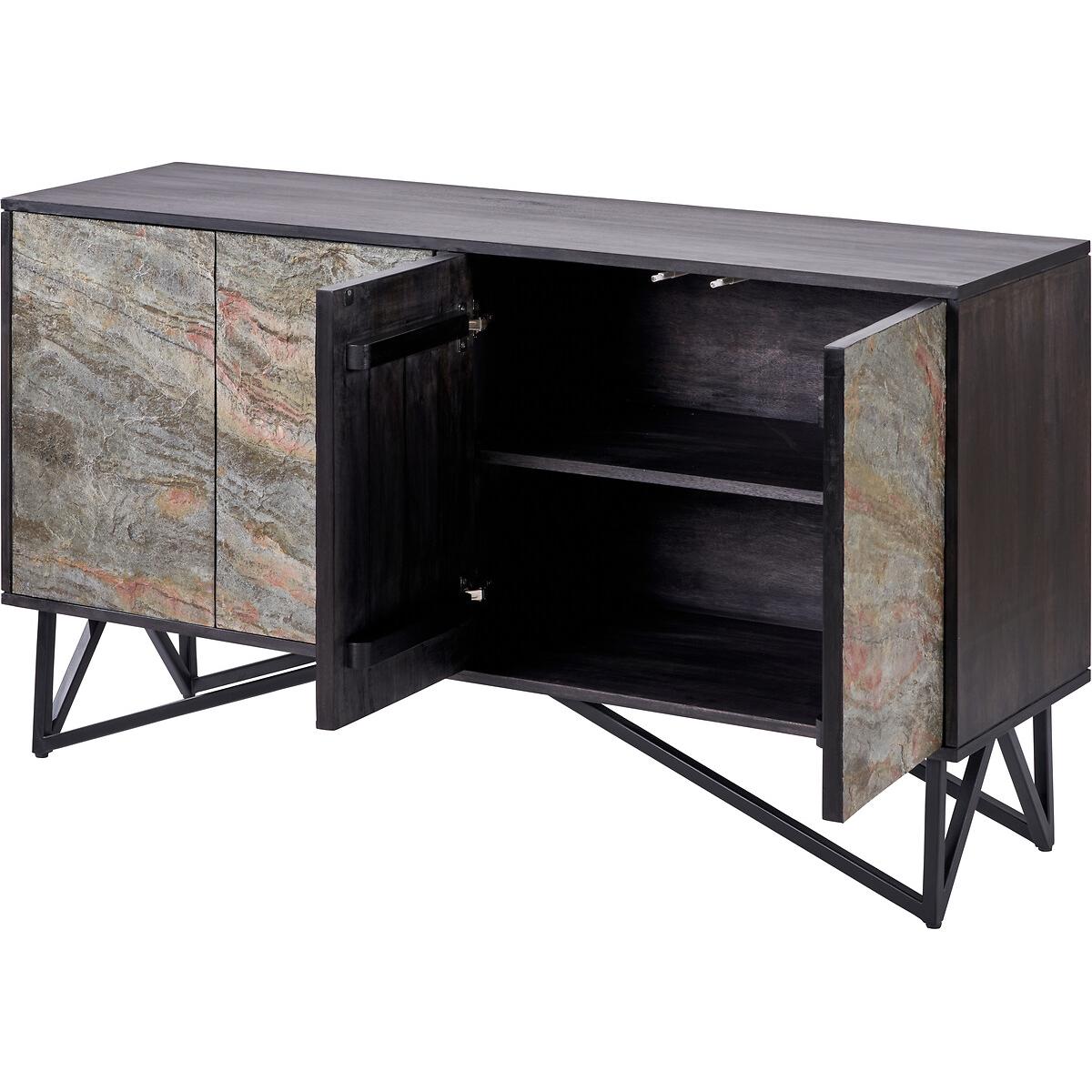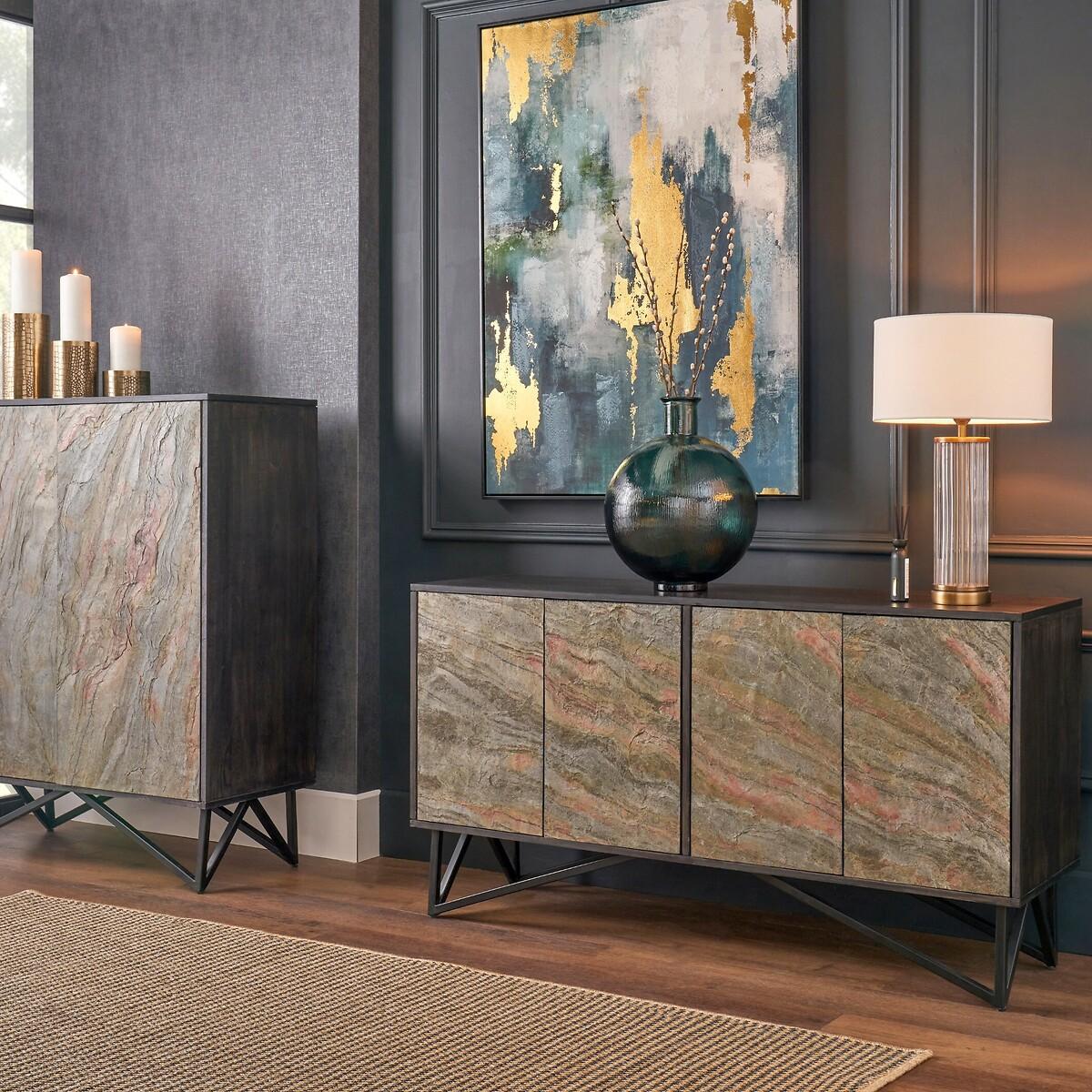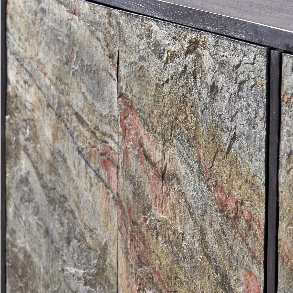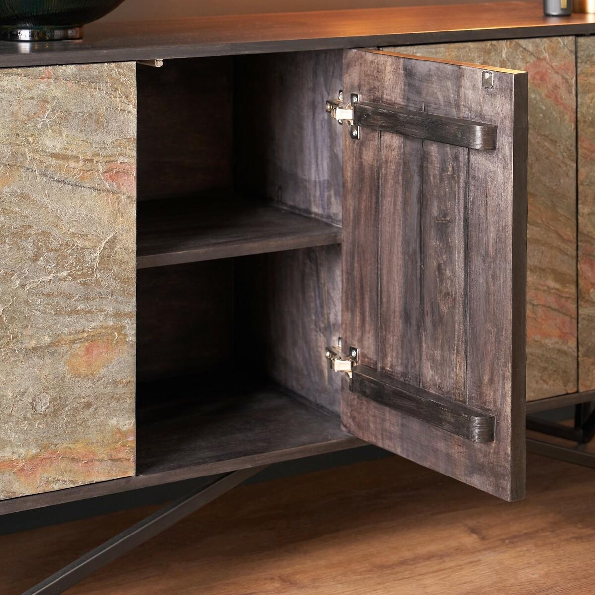 Make a bold statement with the Vesto 4-Door Sideboard, an extraordinary blend of natural texture and modern design. Expertly crafted in India, this distinctive piece combines sleek black-finished mango wood with unusual stone veneer door fronts. The stone veneer, showcasing earthy tones of green, grey, and brown, creates a striking contrast and adds an industrial edge rarely seen in sideboard design. Resting on angled metal legs, the Vesto Sideboard offers both style and practicality, with generous shelved storage hidden behind its four doors and a smooth top for displaying ornaments or décor. Ideal for dining rooms, open-plan living spaces, or design-led offices, this sideboard doubles as a sculptural focal point while keeping your essentials neatly concealed. Product Details• Made from mango wood• Stone veneer cupboards• 4 doors• Fixed interior shelves• Wall fixings included• Partial assembly required (legs/feet only)• 1 year manufacturers warranty. Product Composition - mango wood 88%, Steel 10%, Veneer 2%Product Dimensions - 140 cm x40 cm x76 cm , Weight - 42.5 KG• Clearance to floor: 21 cm Package Dimensions - 148 cm x 84 cm x 48 cm, Weight 54 kg. This product will be dispatched by one of our trusted suppliers. You’ll be contacted by their selected courier about your delivery.