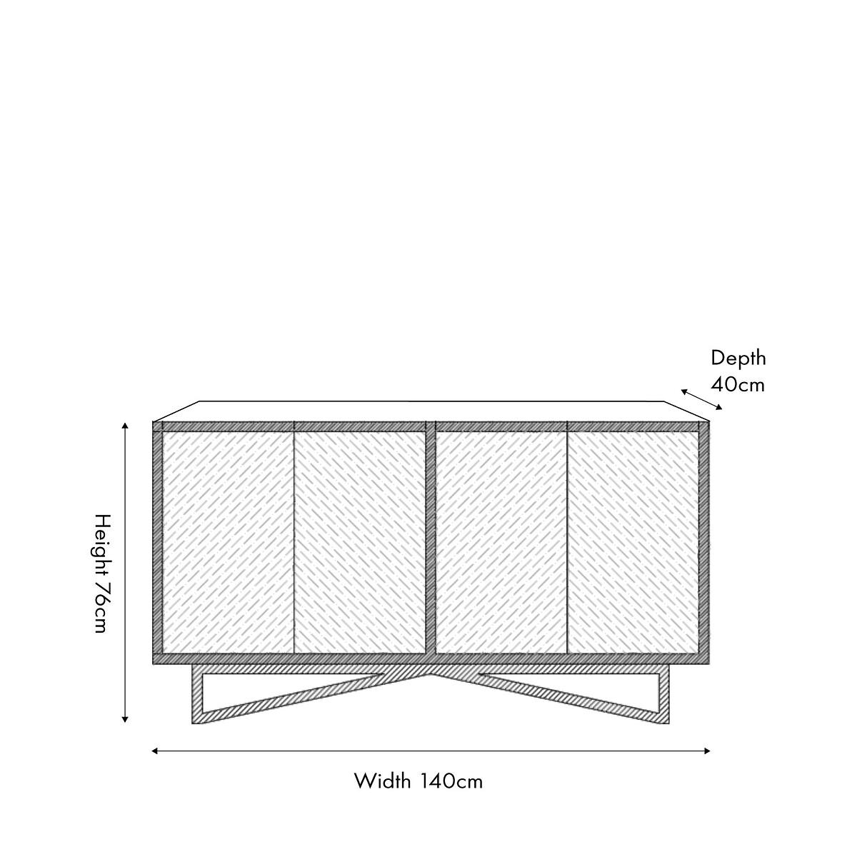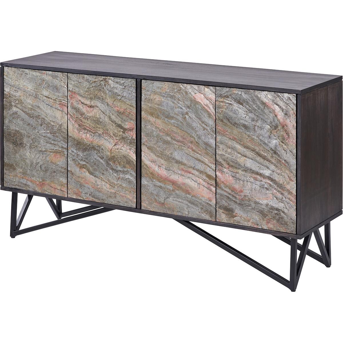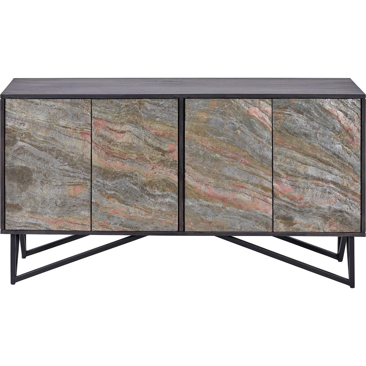 Make a bold statement with the Vesto 4-Door Sideboard, an extraordinary blend of natural texture and modern design. Expertly crafted in India, this distinctive piece combines sleek black-finished mango wood with unusual stone veneer door fronts. The stone veneer, showcasing earthy tones of green, grey, and brown, creates a striking contrast and adds an industrial edge rarely seen in sideboard design. Resting on angled metal legs, the Vesto Sideboard offers both style and practicality, with generous shelved storage hidden behind its four doors and a smooth top for displaying ornaments or décor. Ideal for dining rooms, open-plan living spaces, or design-led offices, this sideboard doubles as a sculptural focal point while keeping your essentials neatly concealed. Product Details• Made from mango wood• Stone veneer cupboards• 4 doors• Fixed interior shelves• Wall fixings included• Partial assembly required (legs/feet only)• 1 year manufacturers warranty. Product Composition - mango wood 88%, Steel 10%, Veneer 2%Product Dimensions - 140 cm x40 cm x76 cm , Weight - 42.5 KG• Clearance to floor: 21 cm Package Dimensions - 148 cm x 84 cm x 48 cm, Weight 54 kg. This product will be dispatched by one of our trusted suppliers. You’ll be contacted by their selected courier about your delivery.