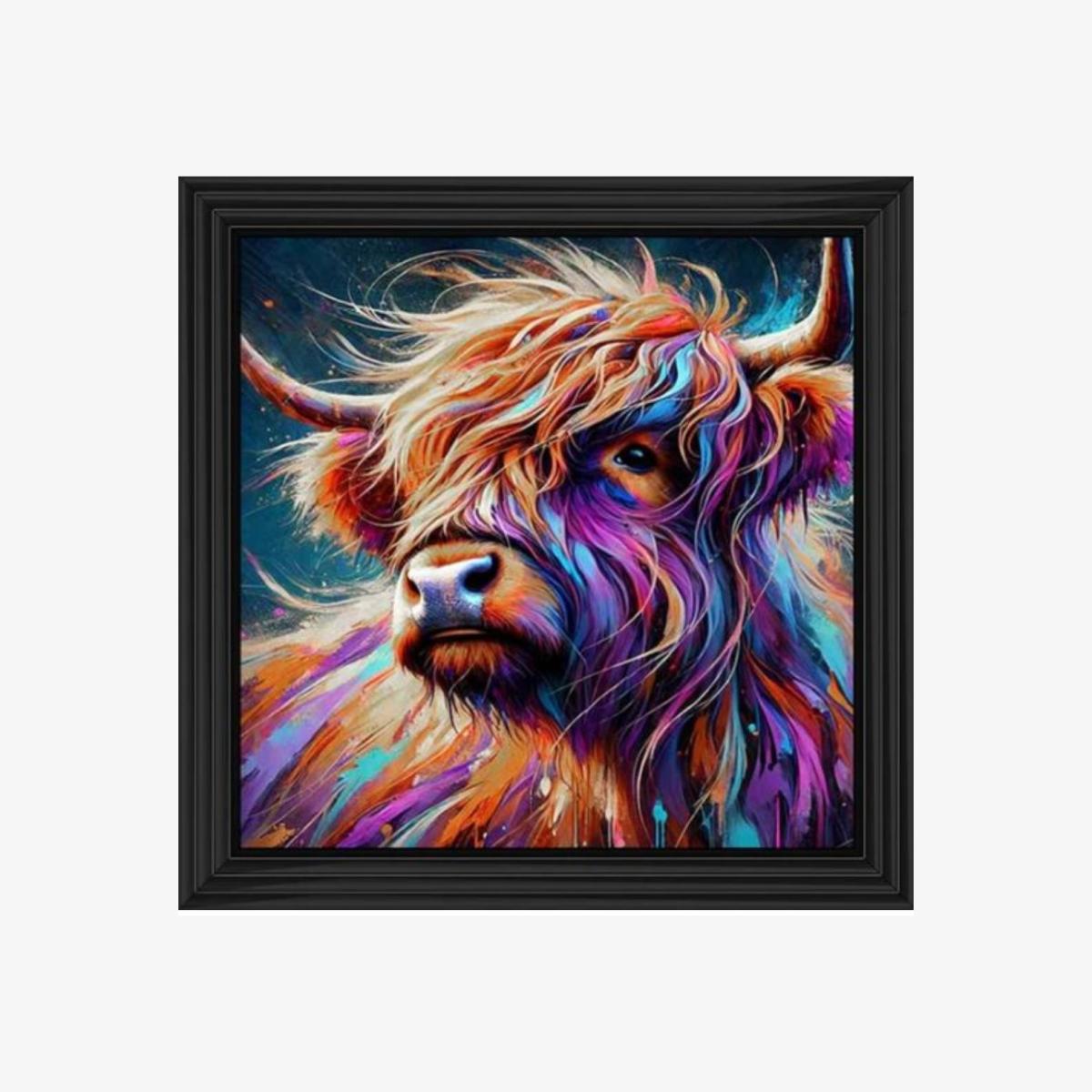 Vibrant Highland Cow wall art, featuring colourful watercolour streaks of pink, purple and blue, paired with a black frame.