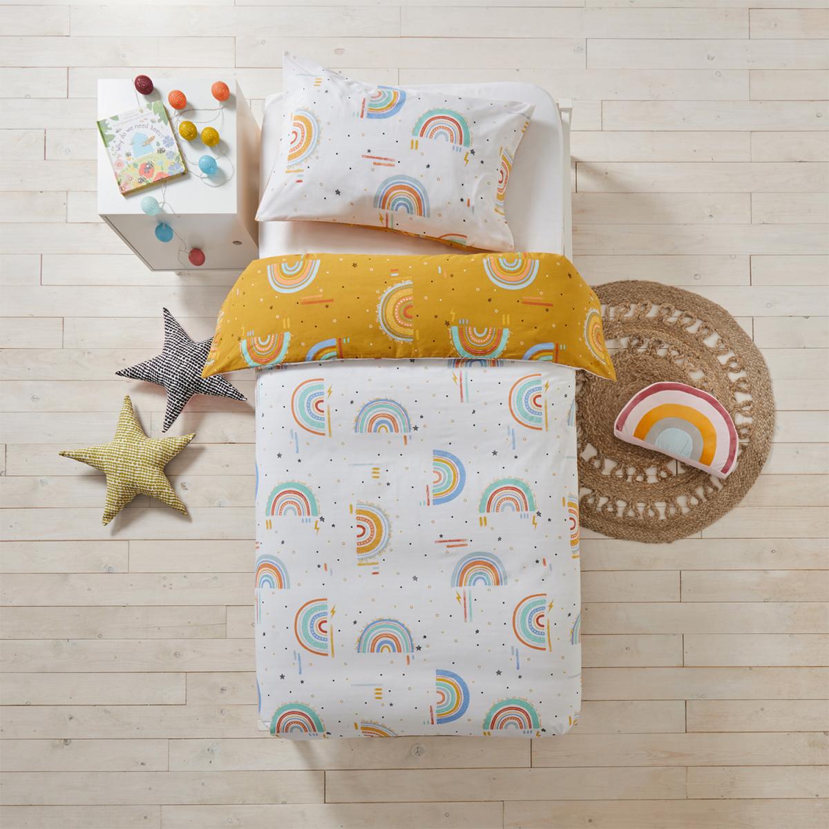 I love this bright rainbow duvet set for bringing a cheerful, playful vibe to any child's room. Its vibrant colours and fun print make it ideal for modern interiors that embrace colour and energy. It works well paired with neutral or pastel walls to let the bedding pop, or with other colourful accessories for a lively, coordinated look. For practical styling, consider layering with plain or textured cushions and soft accessories in complementary hues-think mustard, white, or pastel blues. Because of its cheerful design, it's perfect in playful, artistic spaces or more minimalist rooms looking for a splash of colour to add warmth and personality.