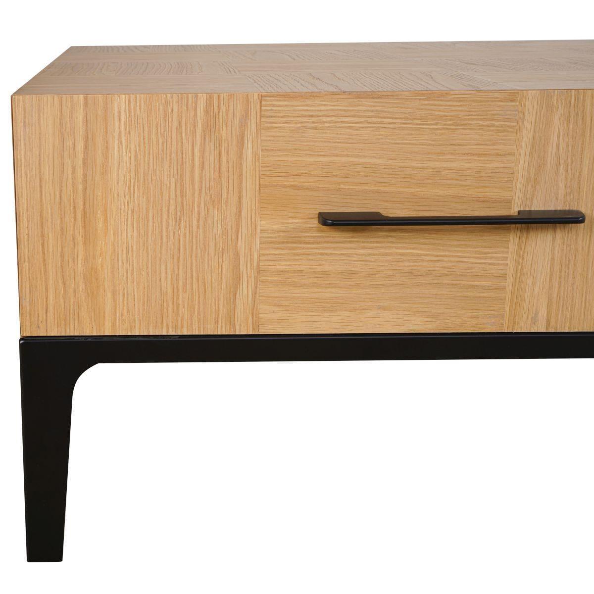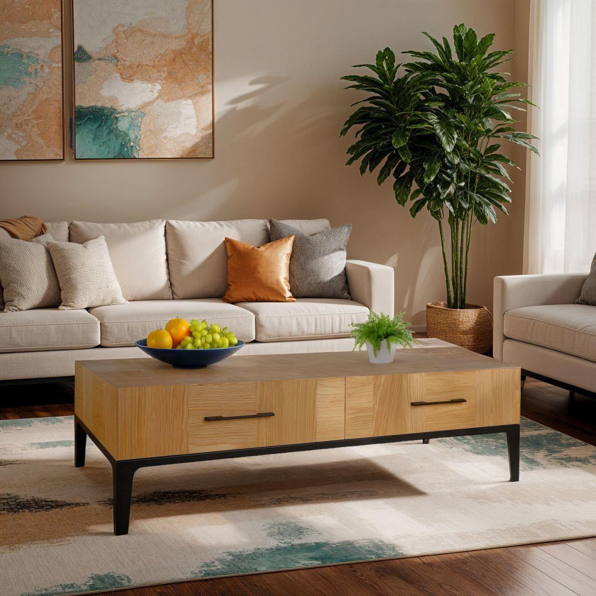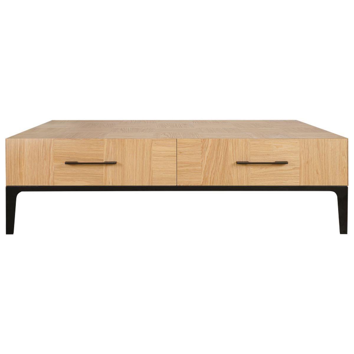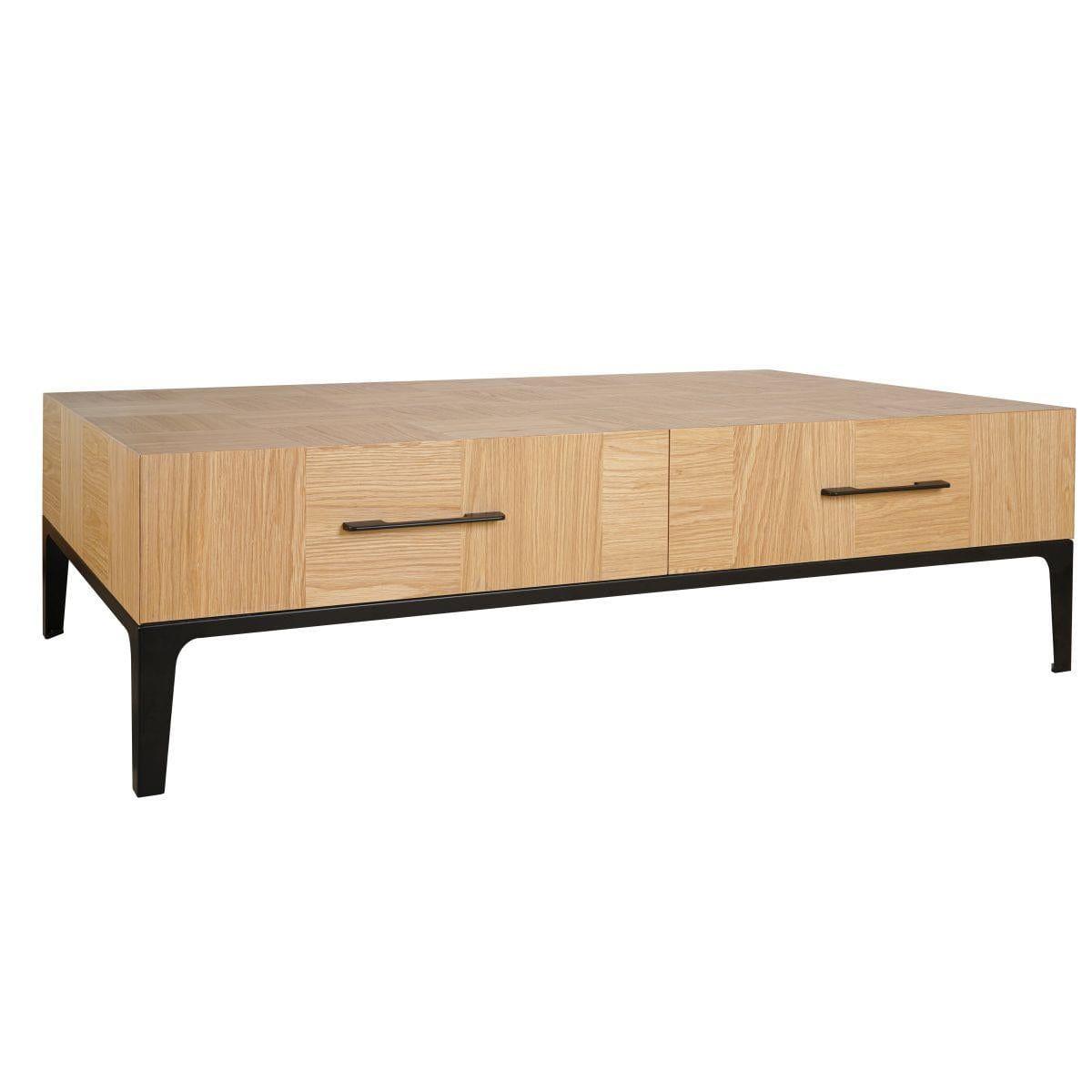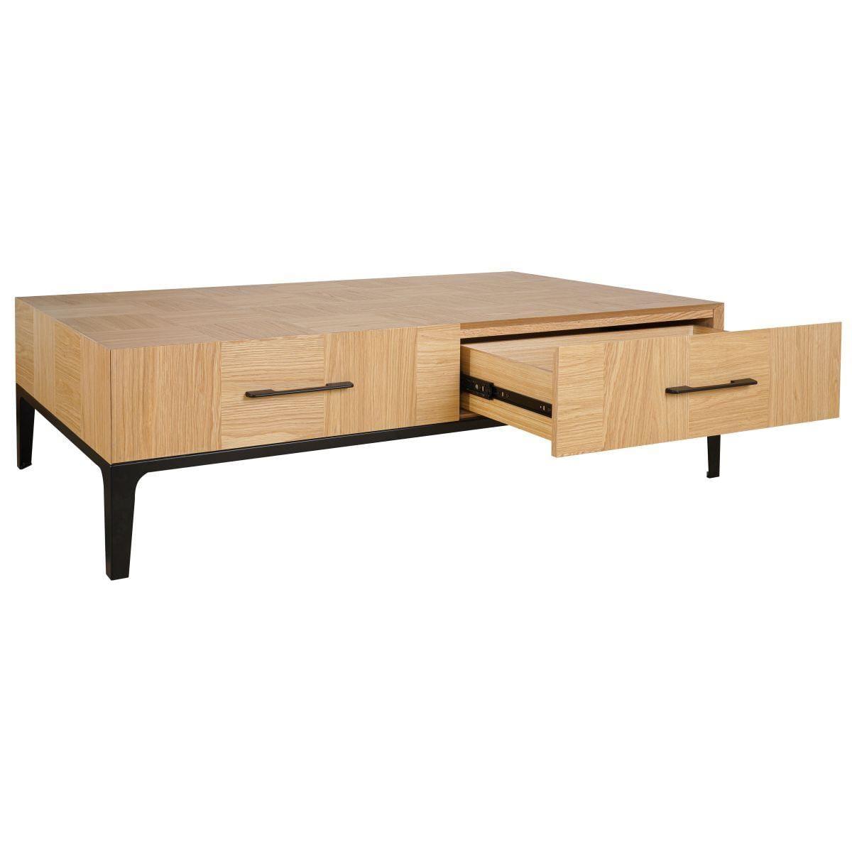 Elevate your living space with this large coffee table from the Vic Collection. A wooden coffee table with a modern industrial vibe, it measures 140cm x 80cm and features 2 spacious drawers for storage. Perfect for those seeking unique, modern coffee tables with a sleek aesthetic. Crafted for contemporary interiors, this coffee table pairs a geometric oak veneer top with a natural finish and sleek metal legs. The industrial-inspired design combines form and function, offering both style and practical storage with its 2 large drawers. The oak veneer is meticulously arranged in a striking geometric pattern, highlighting its natural grain. This finish not only ensures durability but also adds a touch of elegance to this wooden coffee table, making it a standout in any living space. At 140cm x 80cm, this large coffee table provides ample surface space for entertaining or everyday use. Its built-in storage ensures a clutter-free area, making it one of the best modern coffee tables for both functionality and style. Matching pieces available. W140cm D80cm H40cm Features 2 Drawers Large Wooden Coffee Table