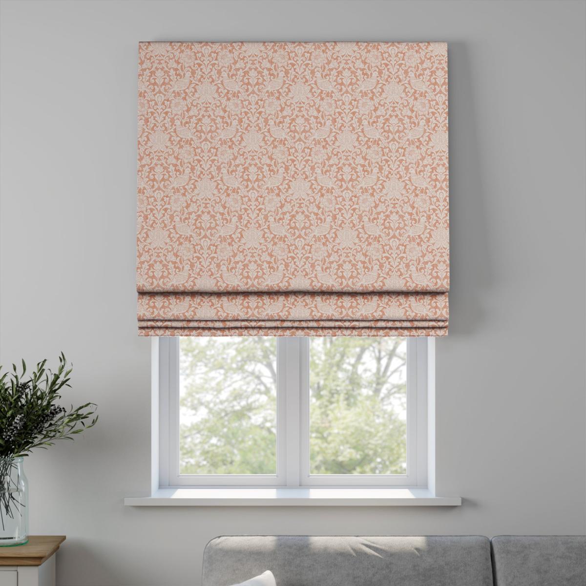 * Durable polyester composition * Timeless demask pattern * Choose from 3 linings * Select your fitting type * Pick a side for the operating chain * Coordinating Made to Measure and Made to Order items available to purchase separately With its traditional damask pattern enriched by intricate bird and floral details, the Vichy Roman Blind exudes heritage charm. Expertly woven in durable polyester, this statement piece blends opulence with lasting quality. Tailor it to your space with a choice of linings and fitting options.