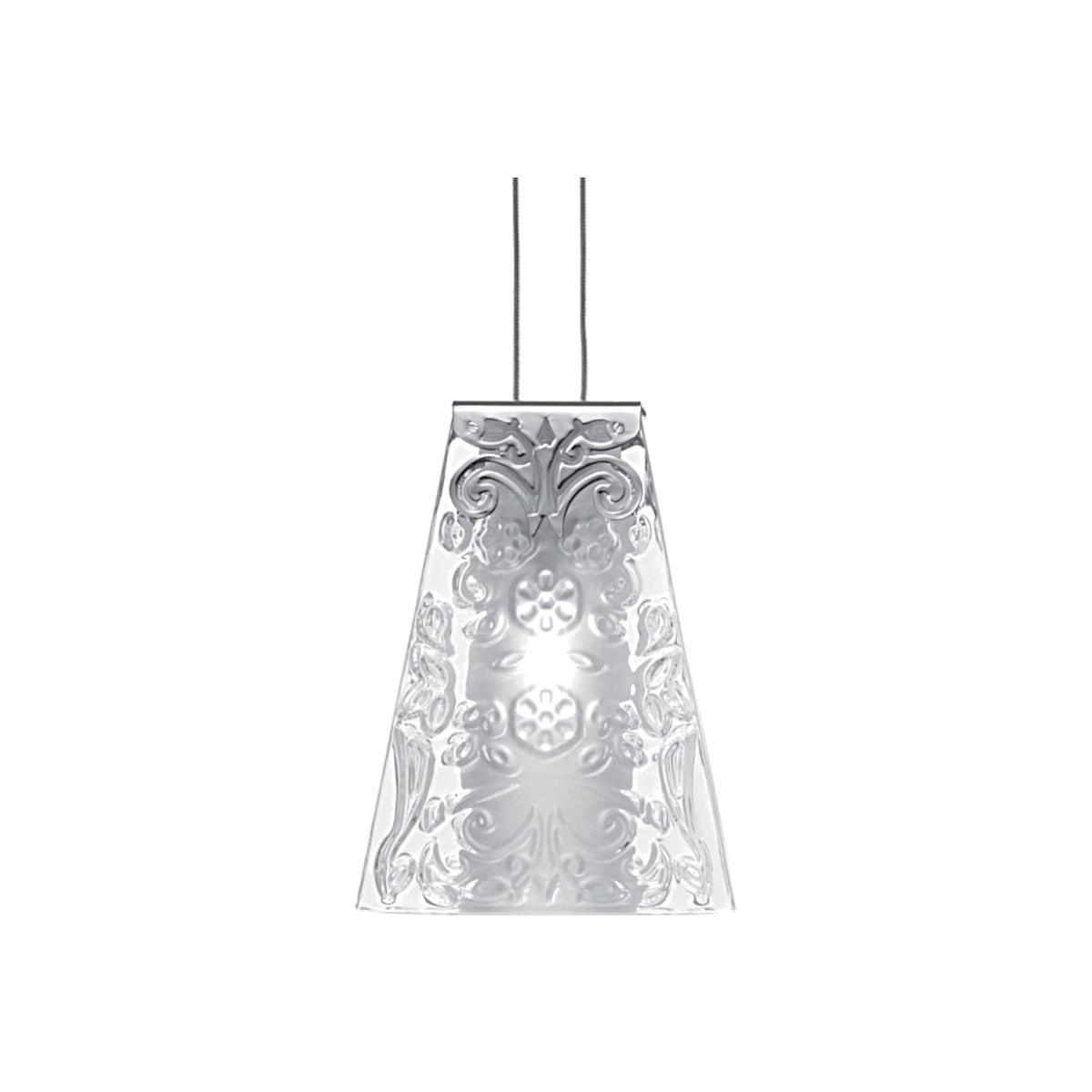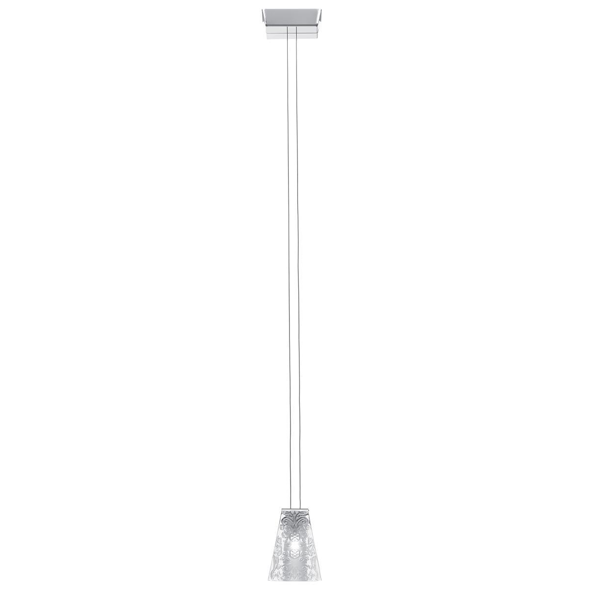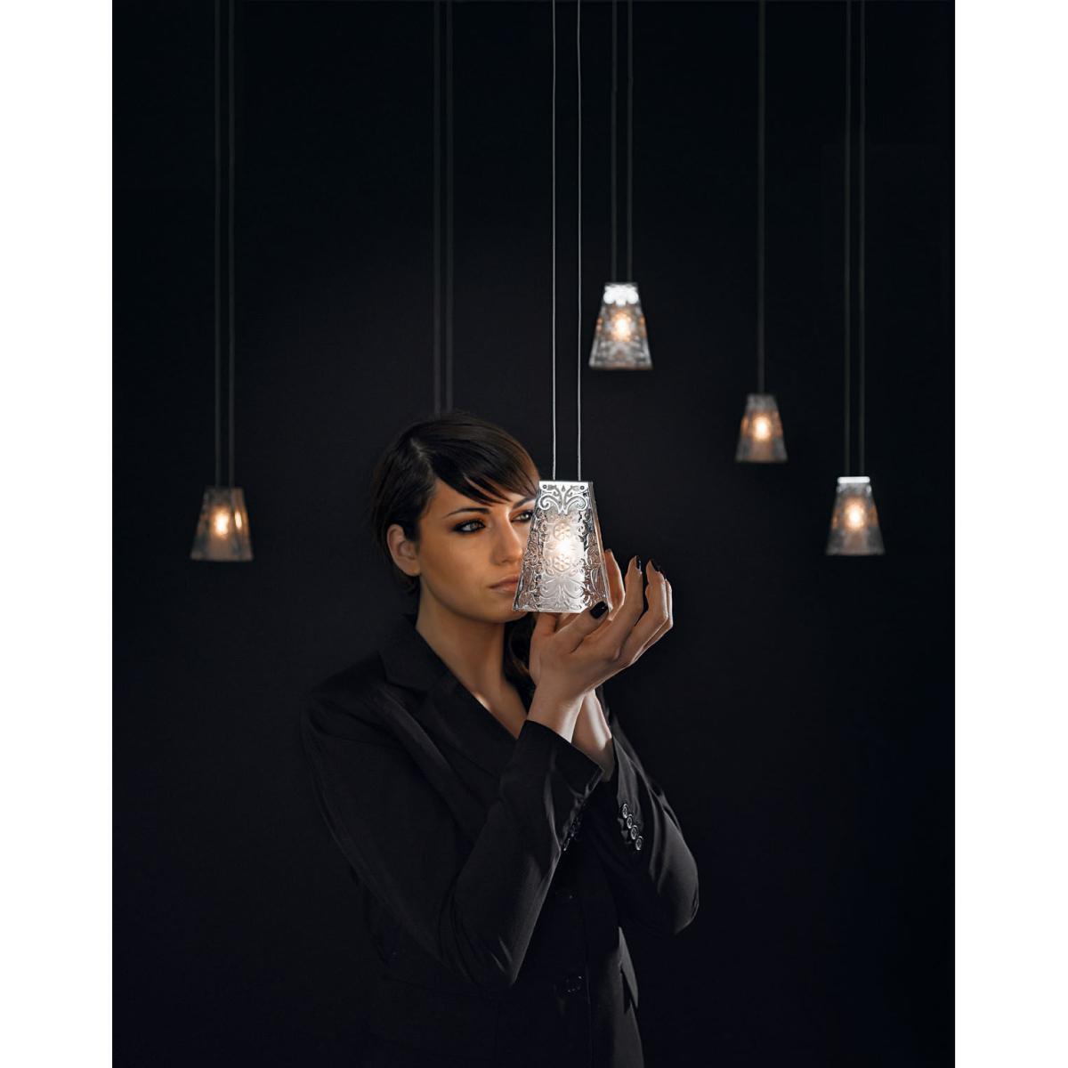 Pendant, table and wall lighting fixtures for indoor installation. Trapezoidal, 24% lead crystal decorated diffusers and polished chromium-plated metal structures. Electrification on mains voltage for halogen bulb. The peculiar glass shape allows to create free composition installing it upside down.