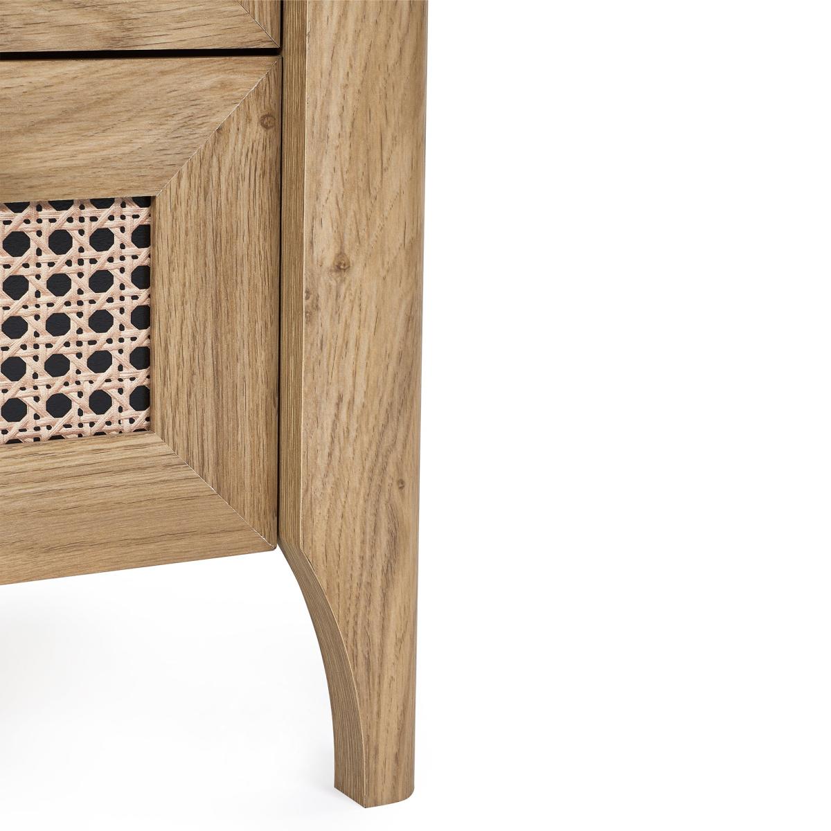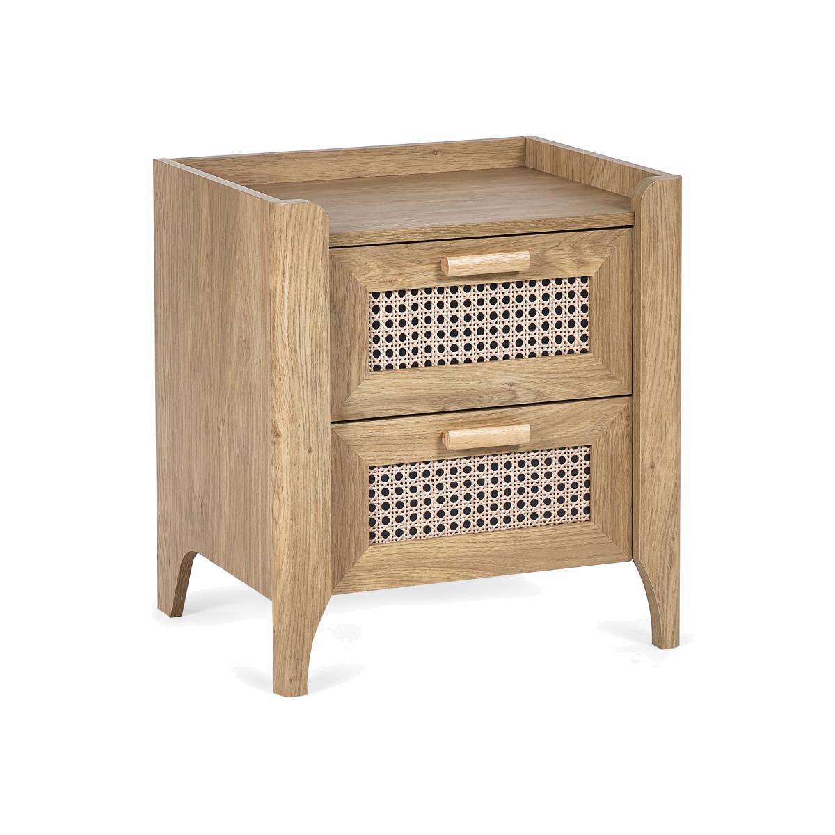 * Rattan design* Curved edges* Oak Frame With its sleek design and bohemian touch, this bedside table offers practical storage with two drawers. The exquisitely curved edges and rattan-effect sticker front add a unique charm, while the natural oak effect finish enhances the overall aesthetic. This piece provides ample storage space for your essentials and fits beautifully into any bedroom decor, creating a warm and inviting atmosphere in your home.