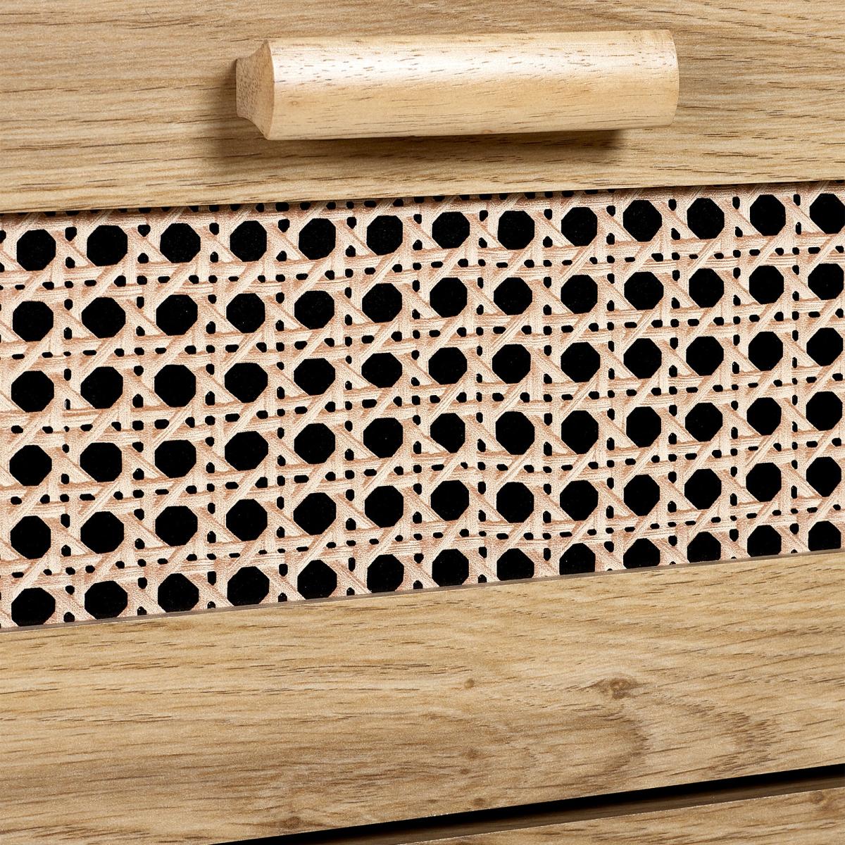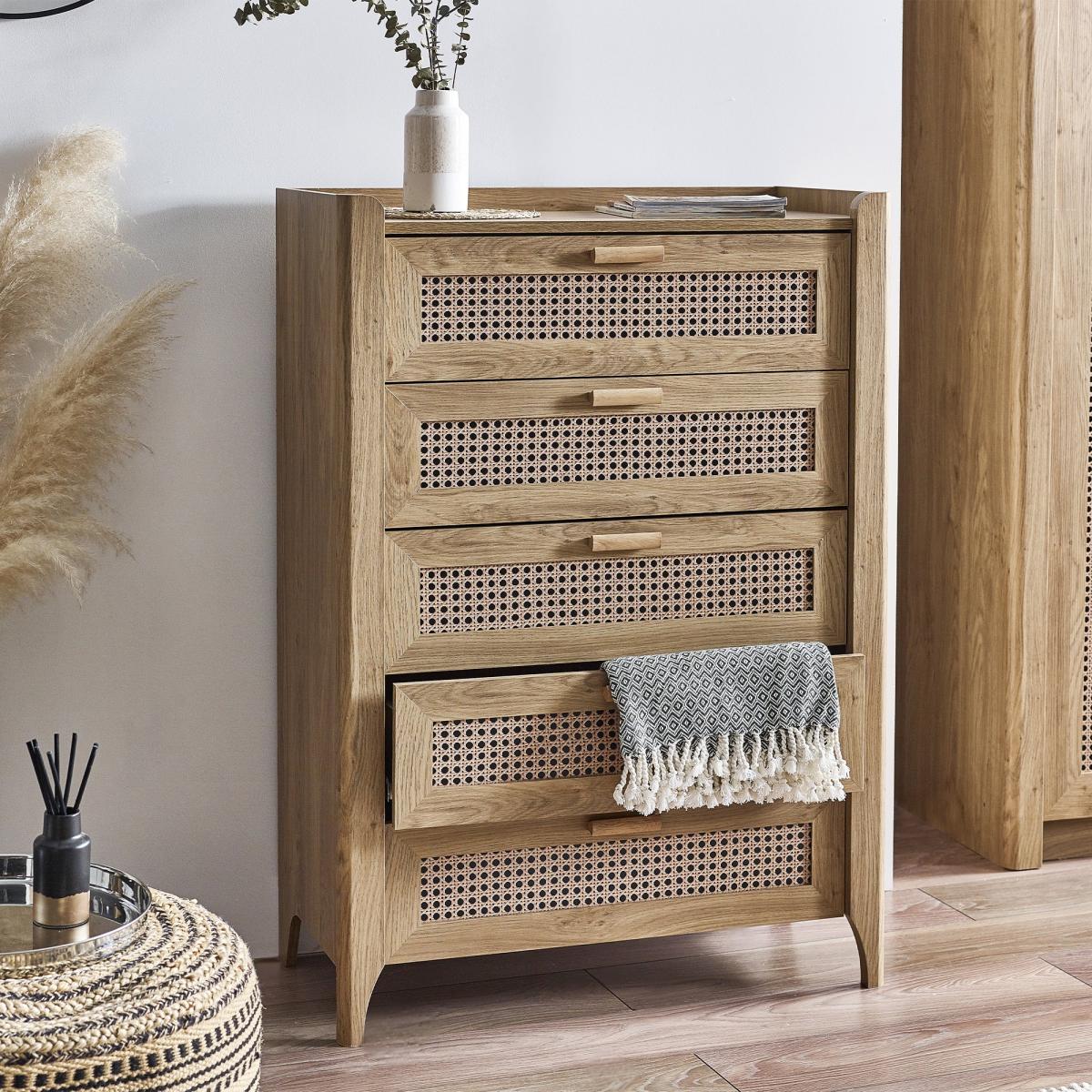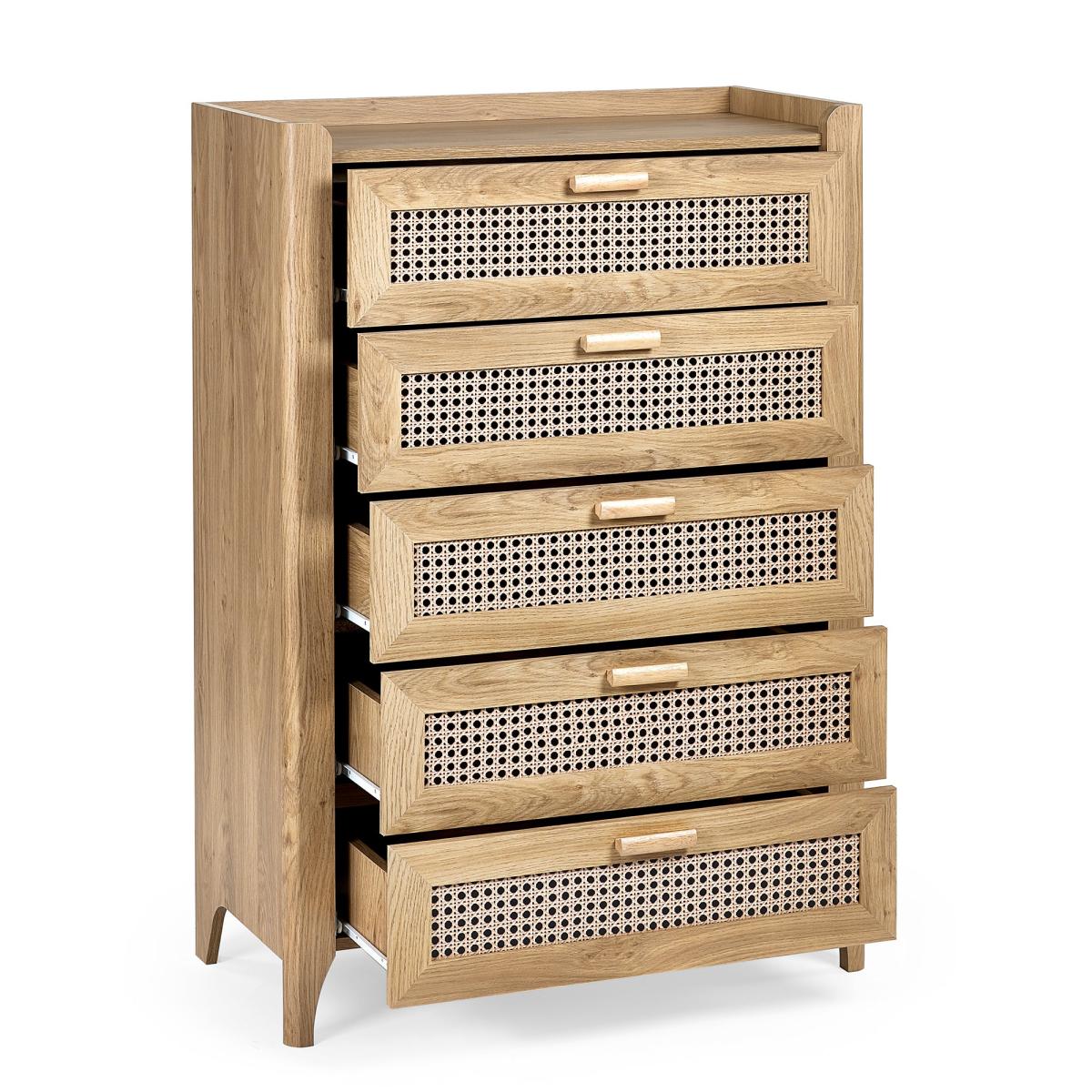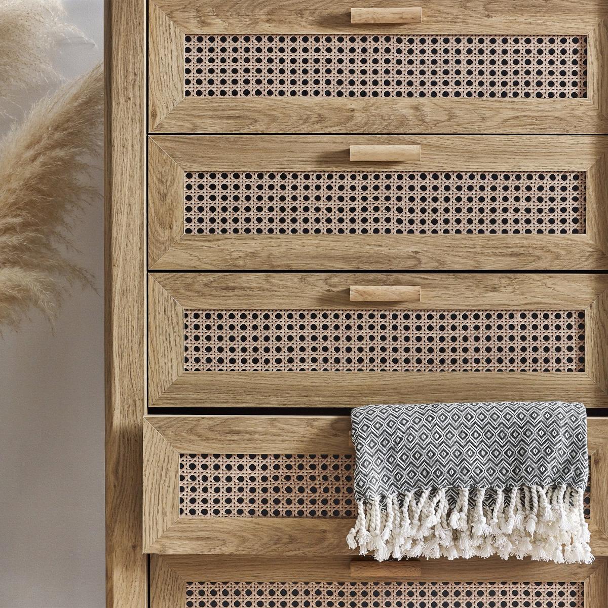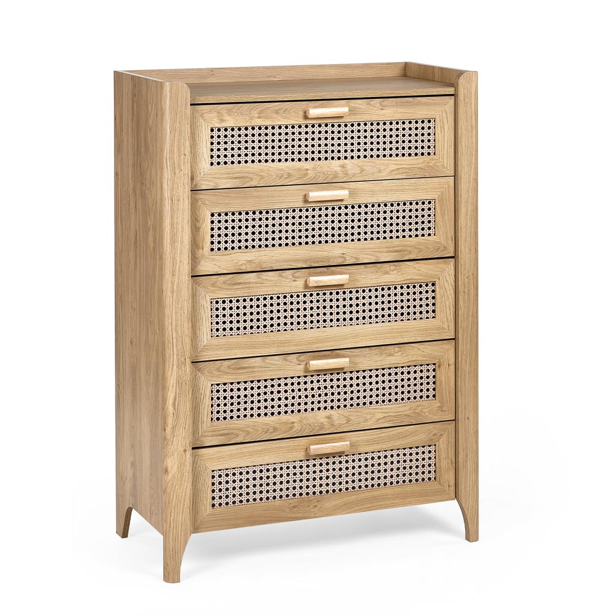 * Rattan design* Curved edges* Oak Frame This chest combines sleek design with a bohemian feel, featuring five spacious drawers for ample storage. The exquisitely curved edges and rattan-effect sticker front add a unique charm, while the natural oak effect finish enhances the overall aesthetic. This piece provides practical storage solutions for your clothing and accessories.