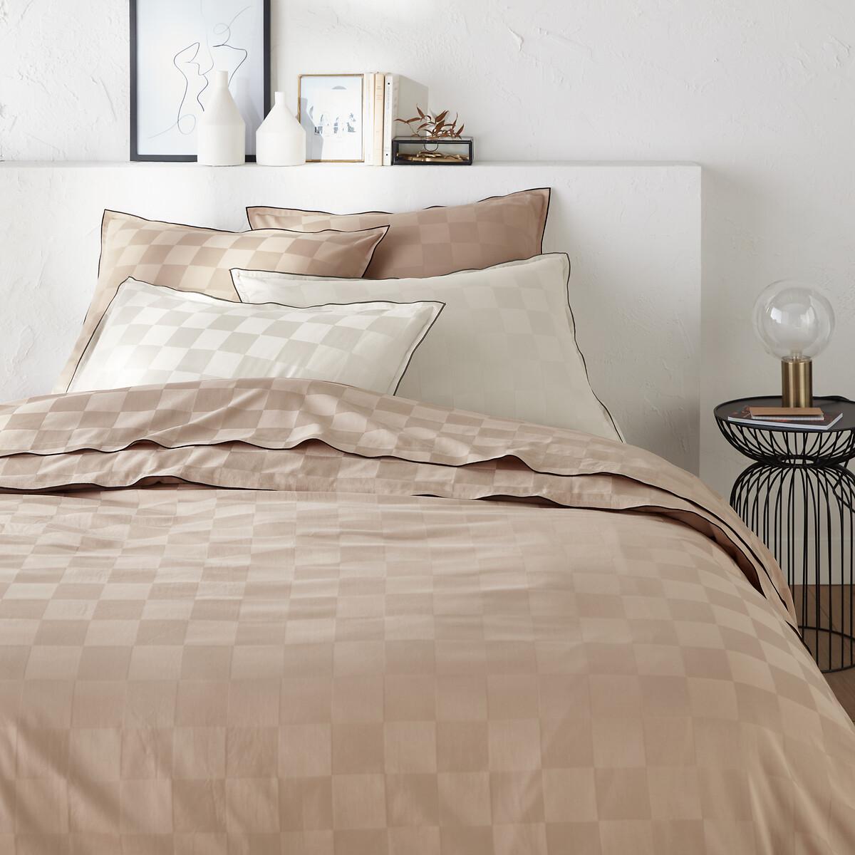This washed cotton satin bed linen comes in a palette of neutral colours. It has a tone-on-tone checkered pattern, elegant and fashionable. Cotton with an ultra-tight weave, washed cotton satin has a silky feel. It is washed for a more matte look than classic satin. Product Details • 100% cotton • Washed cotton satin • 300 Thread Count: The higher the thread count, the higher the quality of the weave • Tonal checkered pattern • Flap height 30cm for thick mattresses • 4 elasticated corners Care Advice • Machine washable at 60°C • By washing your laundry at 40°C instead of 60°C, you limit energy consumption. Dimensions • 90 x 190cm: Single • 140 x 190cm: King • 160 x 200cm: King • 180 x 200cm: King • OEKO-TEX® Standard 100. Standard 100 certification by OEKO-TEX® tests textile products for harmful substances via an independent, international label.