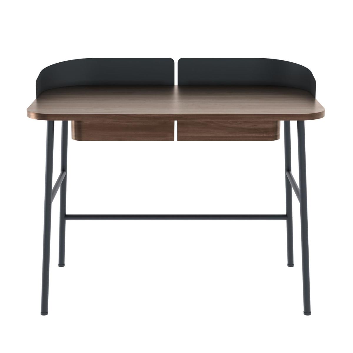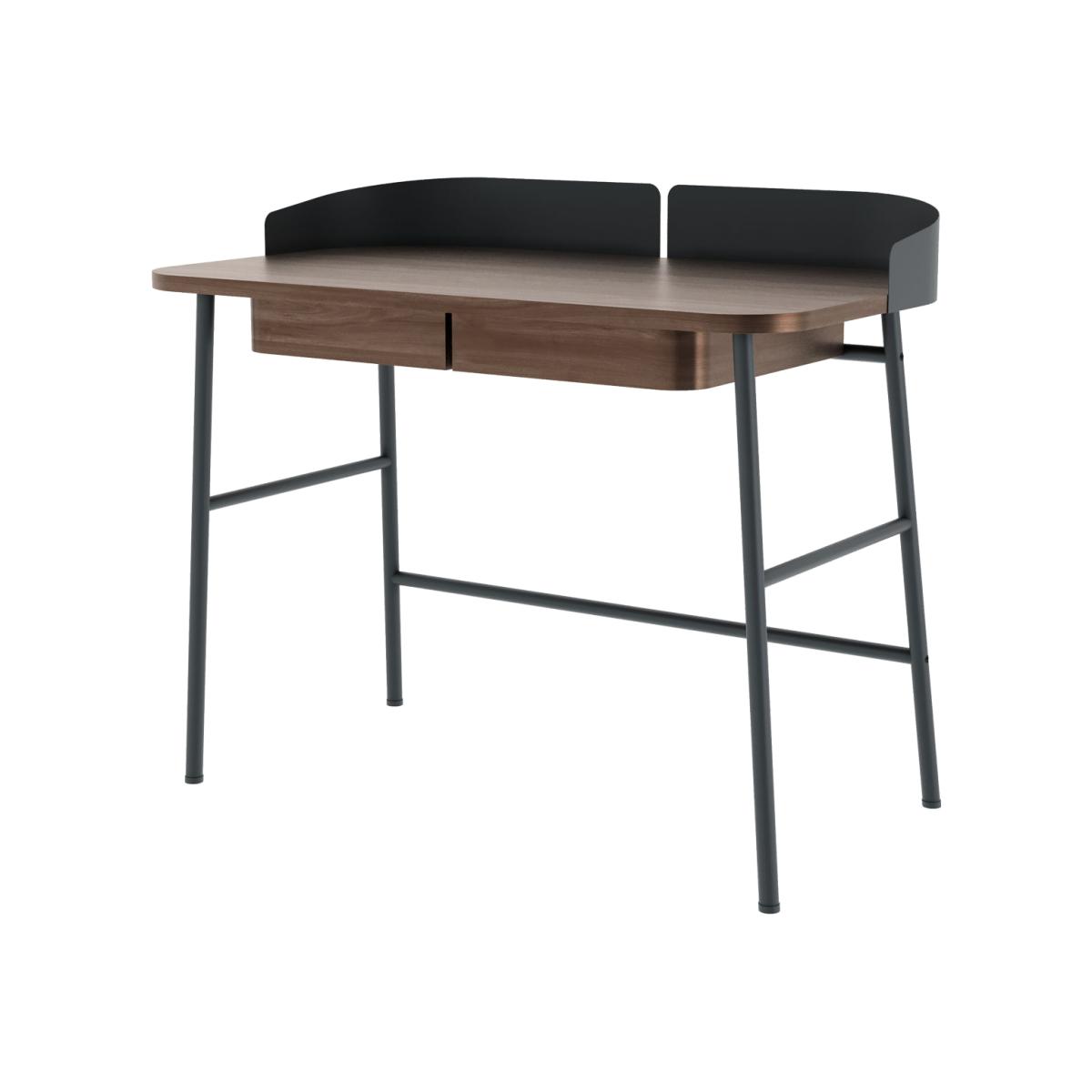 A nice mix of walnut and coloured metal for this compact, practical desk. Victor lets you create a comfortable, space-saving workspace, perfect in a living room, a bedroom. It imposes a very contemporary presence thanks to its clean lines and metal rim that runs around the top. Its two large compartmentalised drawers can hold your documents and all your accessories, so you can keep a clear work surface. The space between the two parts of the metal perimeter allows the cables to pass through.