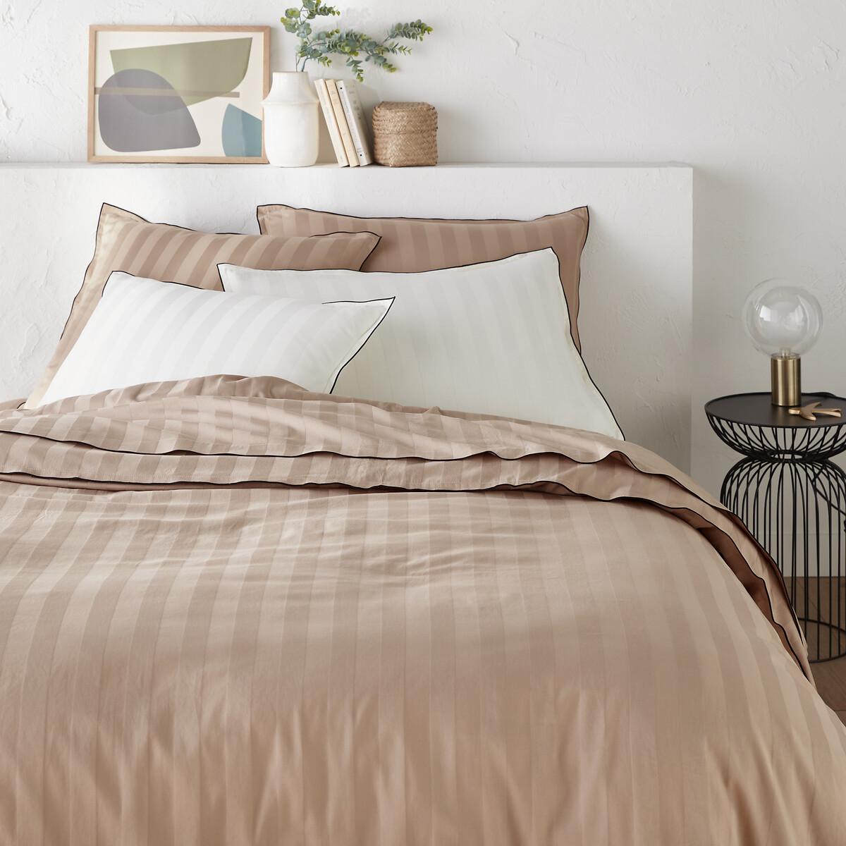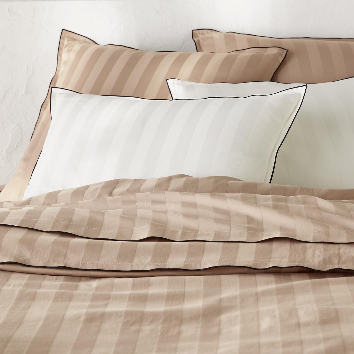 This washed cotton satin bed linen comes in a palette of neutral colours. It adopts a tone-on-tone striped pattern, chic and timeless. It is underlined with a satin stitch finish for a small additional refinement,. Cotton with an ultra-tight weave, washed cotton satin has a silky feel. It is washed for a more matte look than classic satin. Product Details • 100% cotton • Washed cotton satin • 300 Thread Count: The higher the thread count, the higher the quality of the weave • Tonal striped pattern • Satin stitch finish • Straight buttoned hem Care Advice • Machine washable at 60°C • By washing your laundry at 40°C instead of 60°C, you limit energy consumption. Dimensions • 140 x 200cm: Single • 200 x 200cm: Double • 240 x 220cm: King • 260 x 240cm: King • OEKO-TEX® Standard 100. Standard 100 certification by OEKO-TEX® tests textile products for harmful substances via an independent, international label.