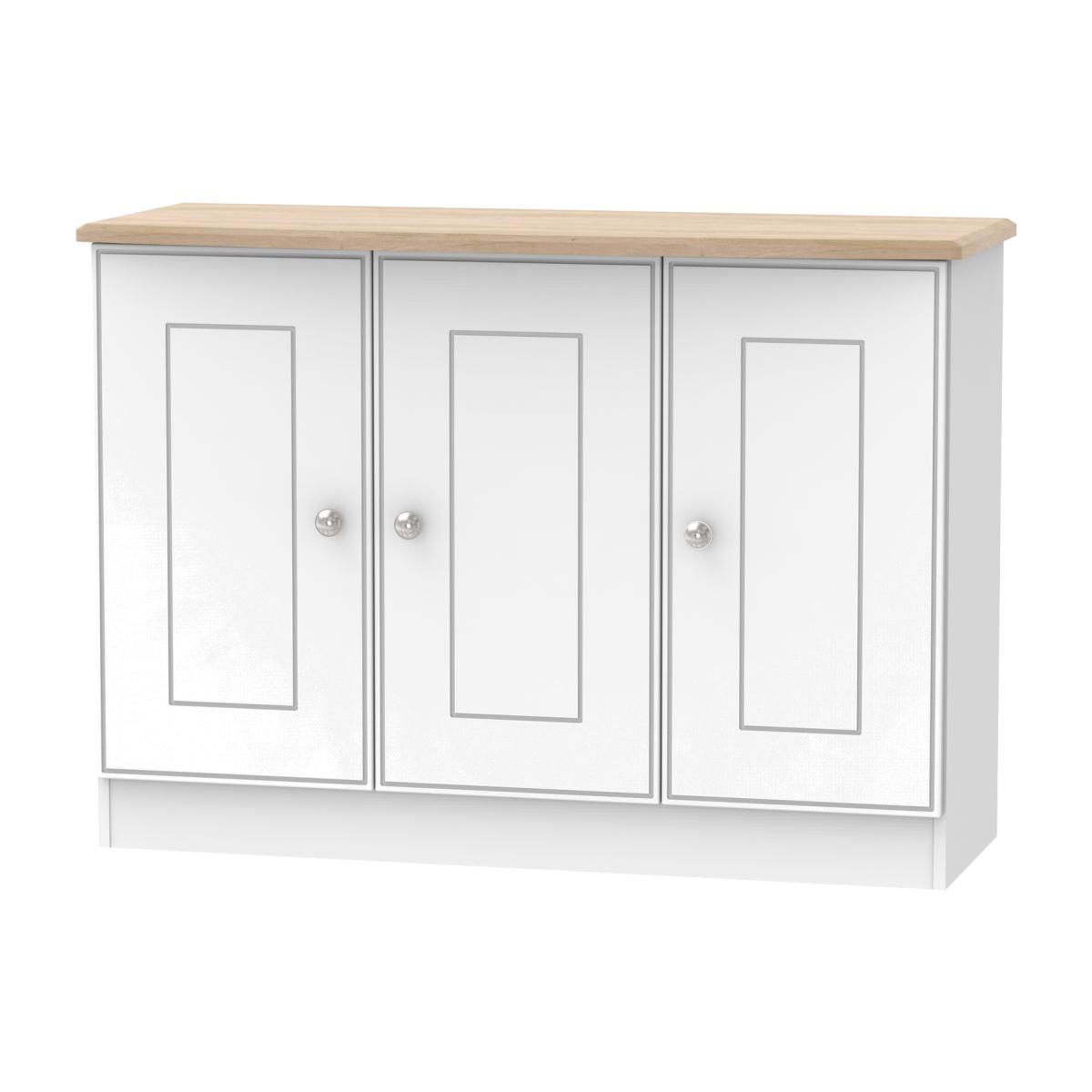 This 3 door wide storage cupboard has internal shelves and is perfect for any living room, dinning room or louge. Could also be used as a TVMedia stand or side board. It easy to create a bedroom that showcases effortless chic, with this stylish range. The shaker-inspired design exudes understated luxury, each piece is finished in a number of colours with brushed steel handles and the option of a contrasting oak effect top. A well-thought-out mix of hanging and flat storage that suitable for any room. All our furniture is made in the United Kingdom, to the highest quality. It is delivered direct to your location of choice by one of our two man delivery teams, and come full assembled (although legs may be removed to prevent damage in transit).