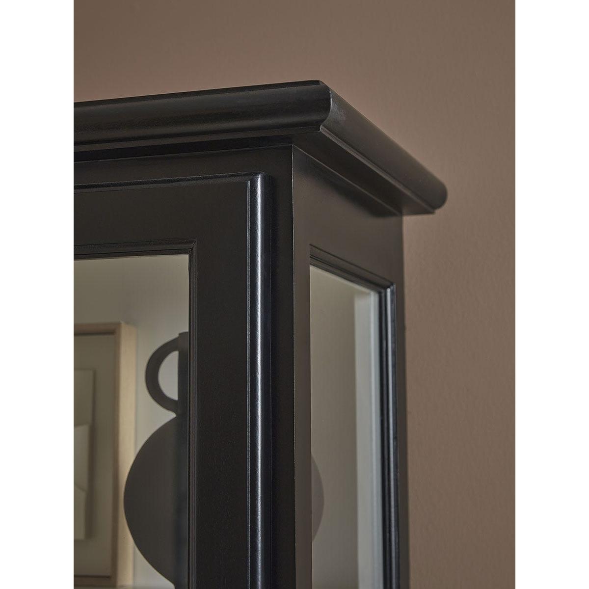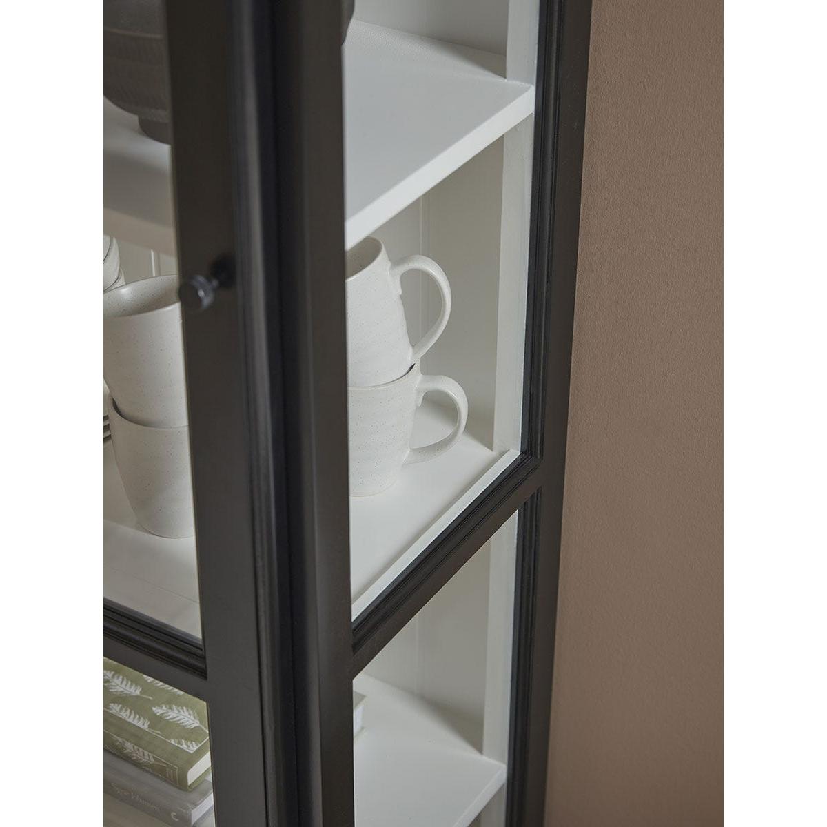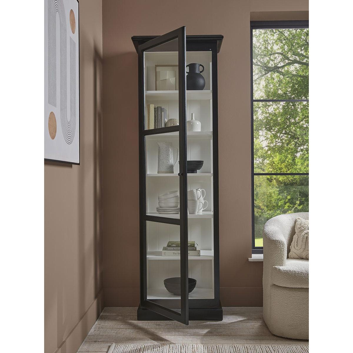 Simple and sleek in design, our Victoria Display Cabinet has plenty of timeless appeal to work in a variety of interior styles. A striking black painted wooden frame is contrasted by a white interior, allowing items to stand out against the bright background. A petite black handle blends into the door which is finished with glass panels for you to display and enjoy your most loved accessories.