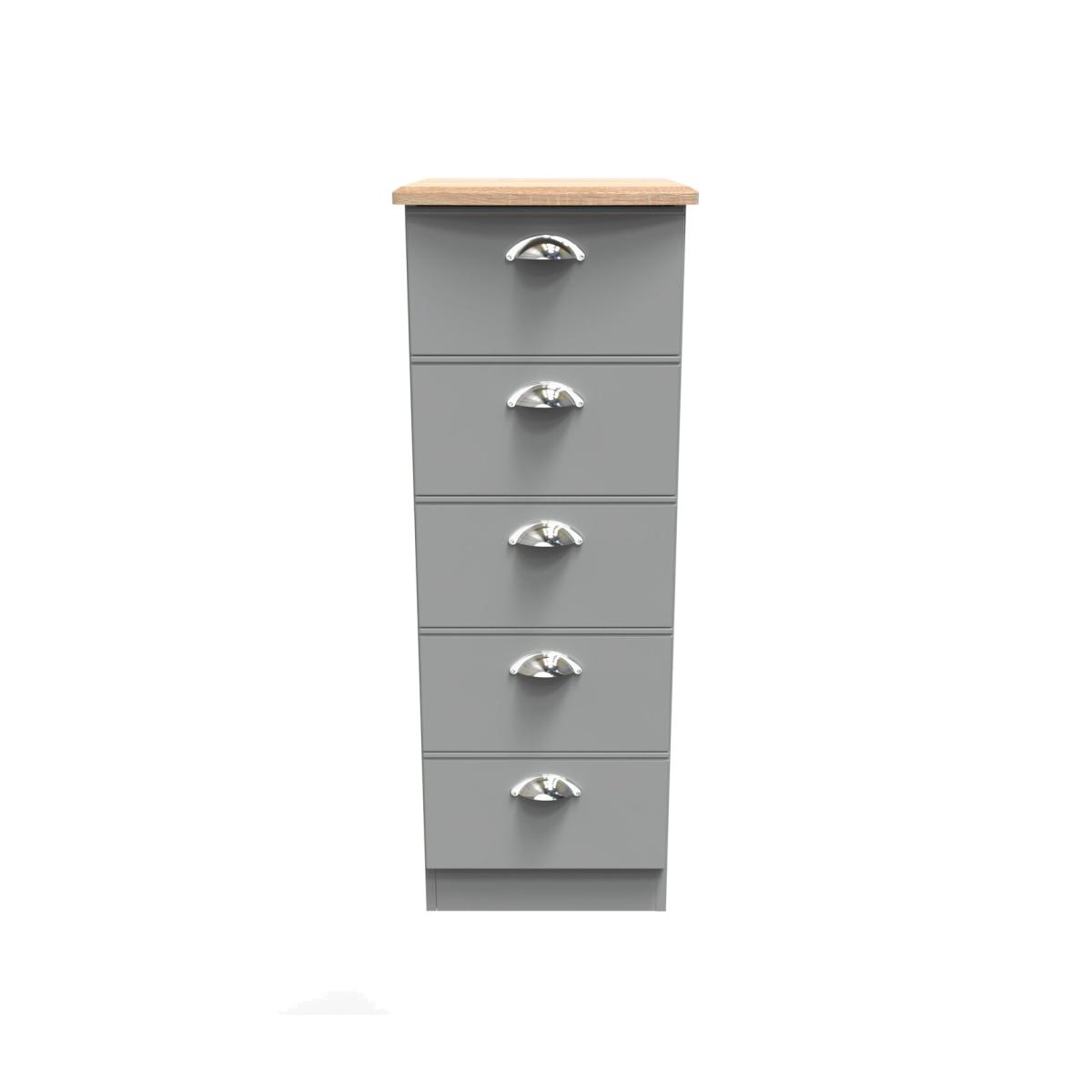This 5 drawer chest of drawers is practical and stylish. Perfect for any home as a free standing storage unit. Its easy to create a bedroom that showcases effortless chic, with this stylish range. The shaker-inspired design exudes understated luxury, each piece is finished in a number of colours with brushed steel handles and the option of a contrasting oak effect top. A well-thought-out mix of hanging and flat storage thats suitable for any room. All our furniture is made in the United Kingdom, to the highest quality. It is delivered direct to your location of choice by one of our two man delivery teams, and come full assembled (although legs may be removed to prevent damage in transit).