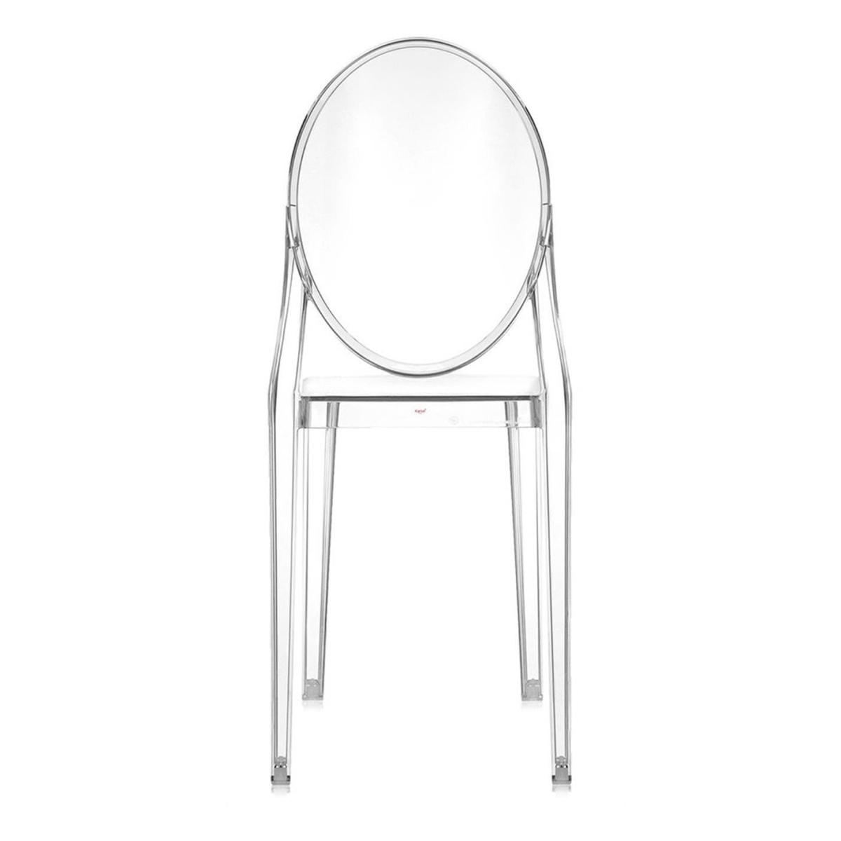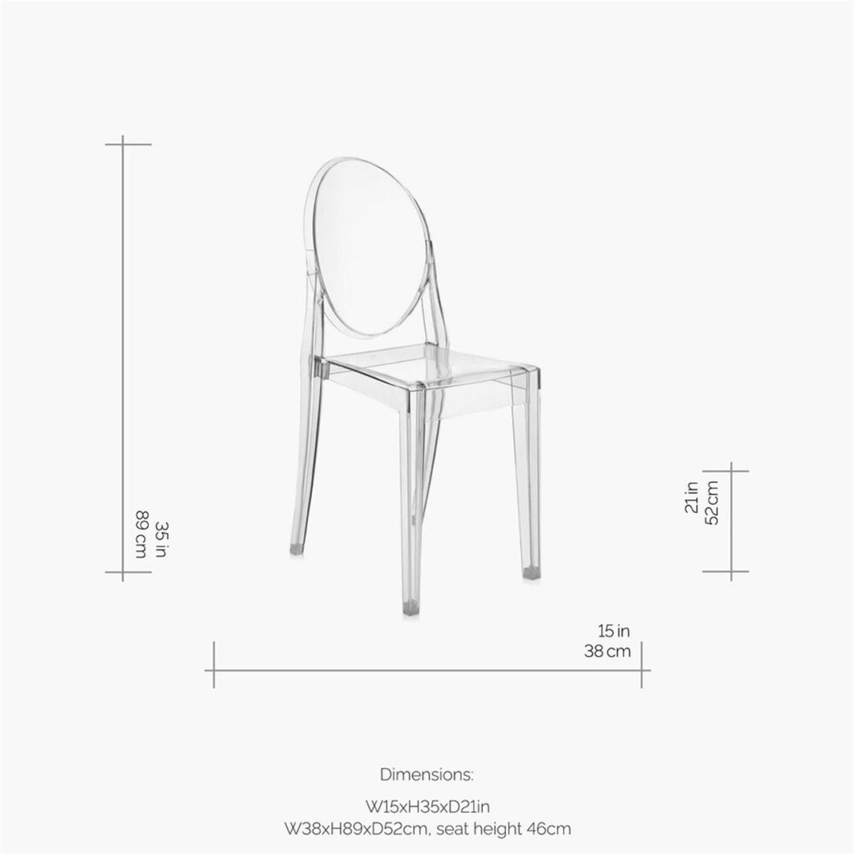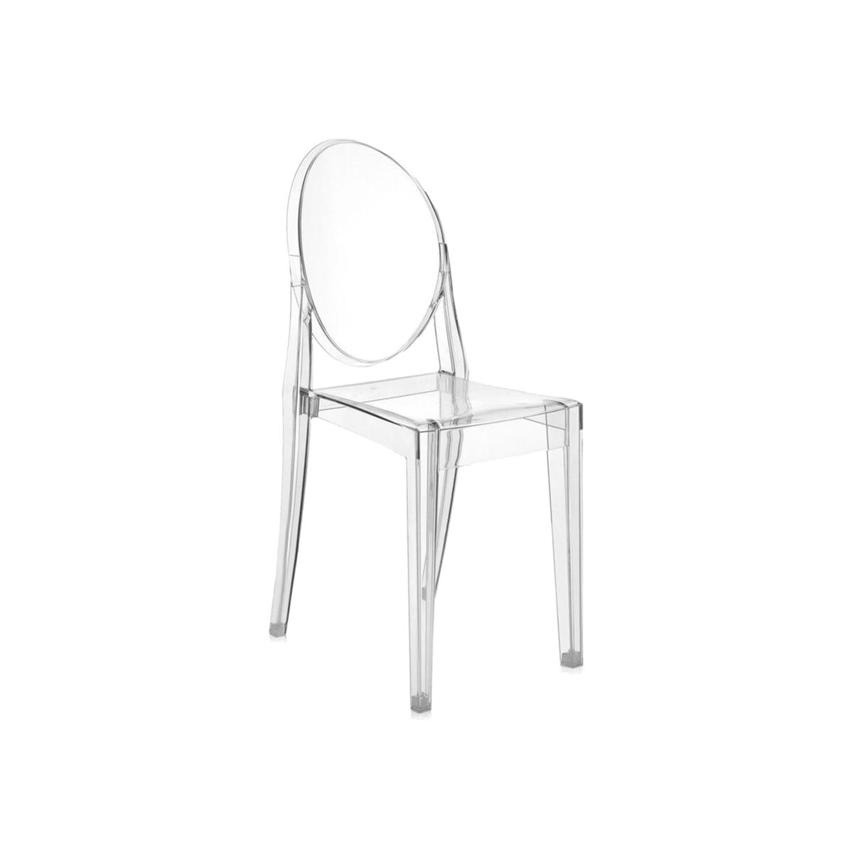 Bring contemporary comfort to any space with this Victoria Ghost Chair from Kartell. Designed by Philippe Starck it features classic lines with a geometric style seat and juxtaposing rounded backrest reminiscent of antique medallions. Robust and even weather-resistant this chair can be enjoyed inside or out and is also stackable up to seven high for practical storage. Now crafted from polycarbonate 2.0, a recycled material partly obtained from ISCC certified industrial cellulose and paper waste, this innovative material reduces carbon dioxide emissions by 60% compared to fossil-based polycarbonates.