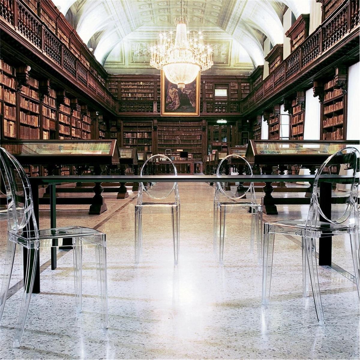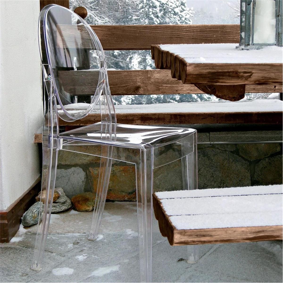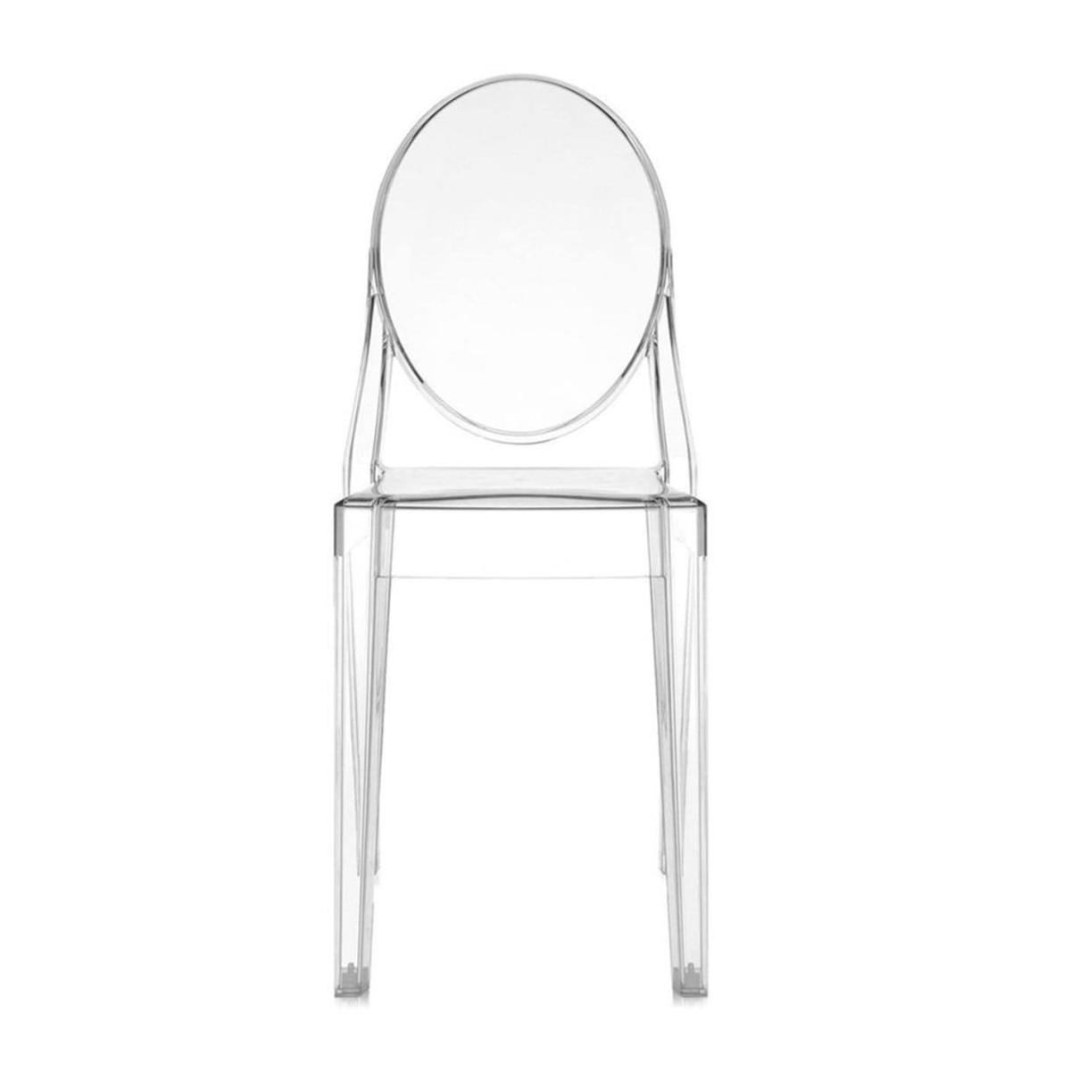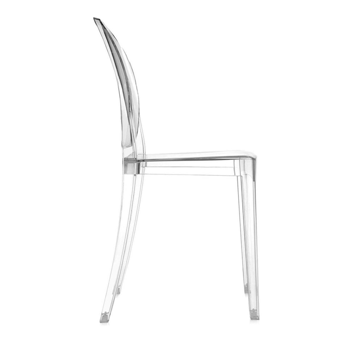 Bring contemporary comfort to any space with this Victoria Ghost Chair from Kartell. Designed by Philippe Starck it features classic lines with a geometric style seat and juxtaposing rounded backrest reminiscent of antique medallions. Robust and even weather-resistant this chair can be enjoyed inside or out and is also stackable up to seven high for practical storage. Now crafted from polycarbonate 2.0, a recycled material partly obtained from ISCC certified industrial cellulose and paper waste, this innovative material reduces carbon dioxide emissions by 60% compared to fossil-based polycarbonates.