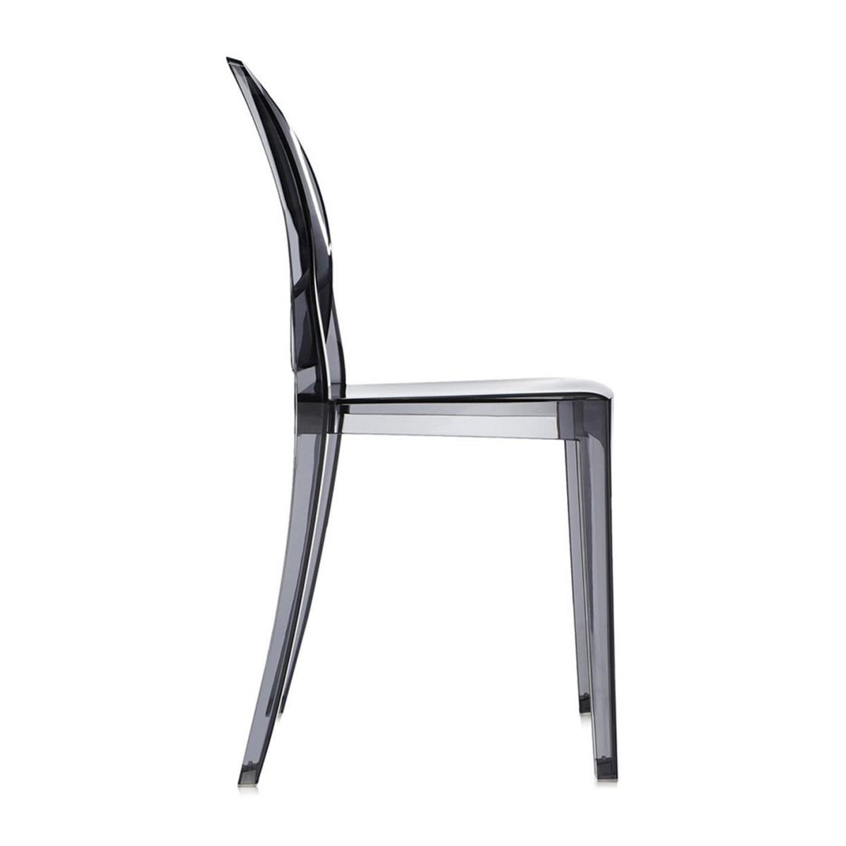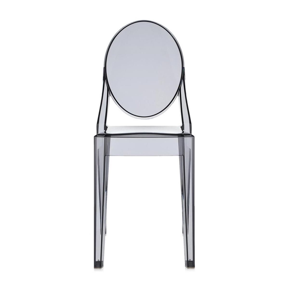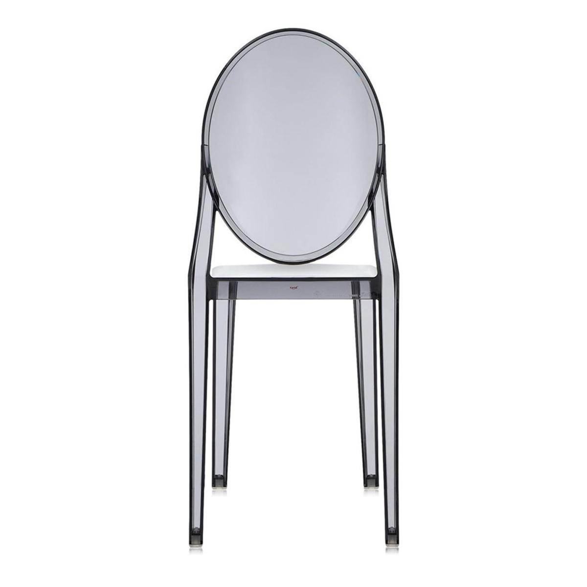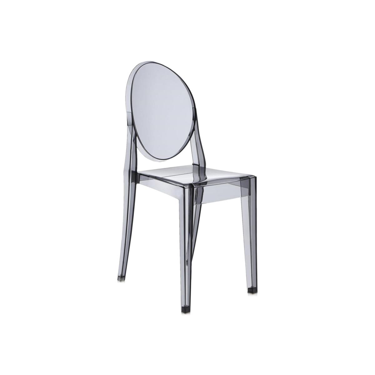Bring contemporary comfort to any space with this Victoria Ghost Chair from Kartell. Designed by Philippe Starck it features classic lines with a geometric style seat and juxtaposing rounded backrest reminiscent of antique medallions. Robust and even weather-resistant this chair can be enjoyed inside or out and is also stackable up to seven high for practical storage. Now crafted from polycarbonate 2.0, a recycled material partly obtained from ISCC certified industrial cellulose and paper waste, this innovative material reduces carbon dioxide emissions by 60% compared to fossil-based polycarbonates.