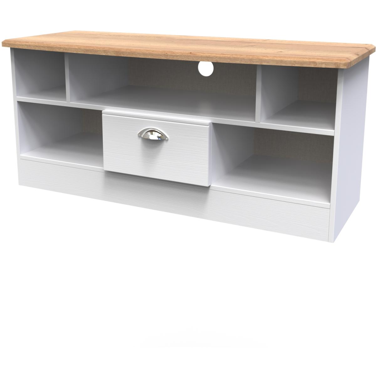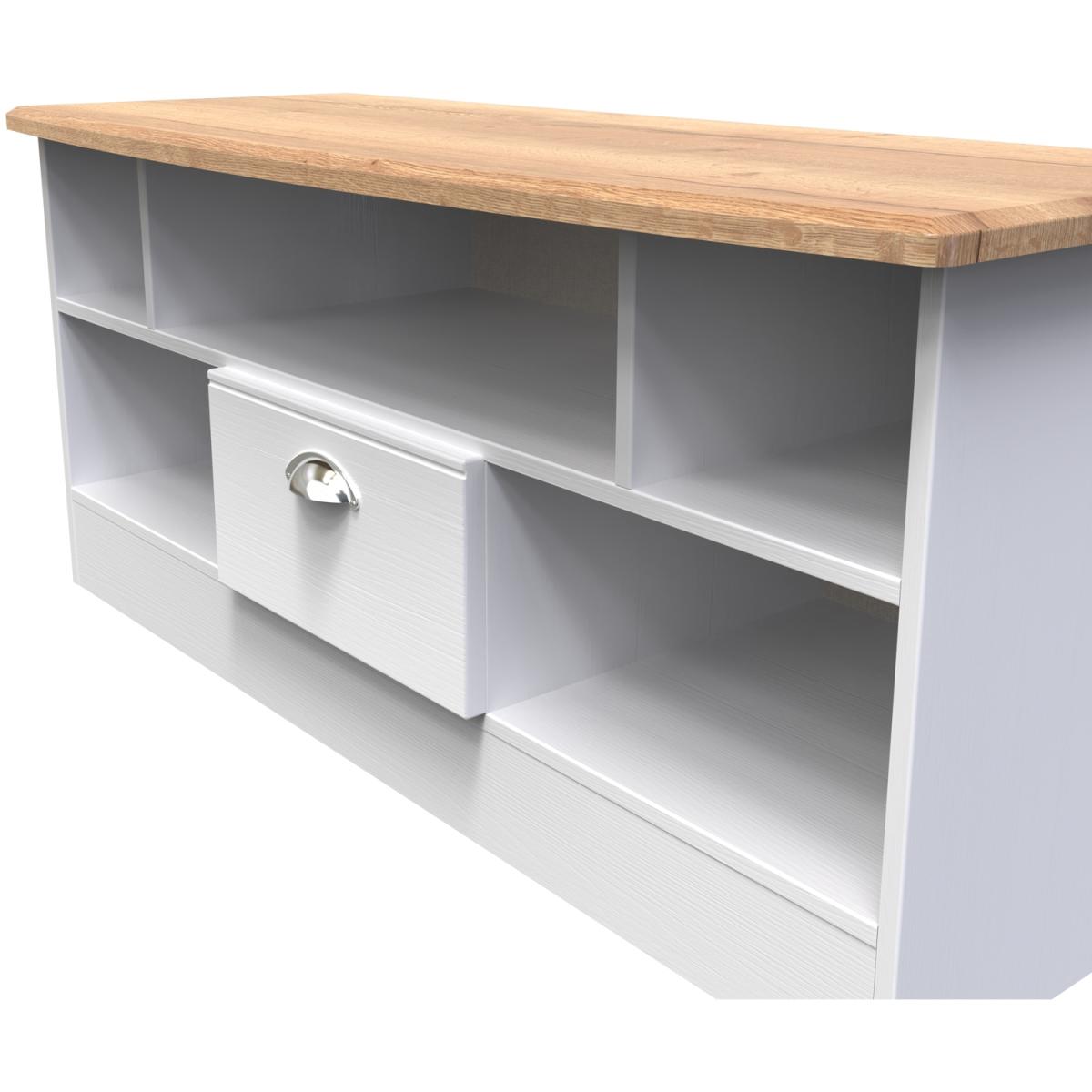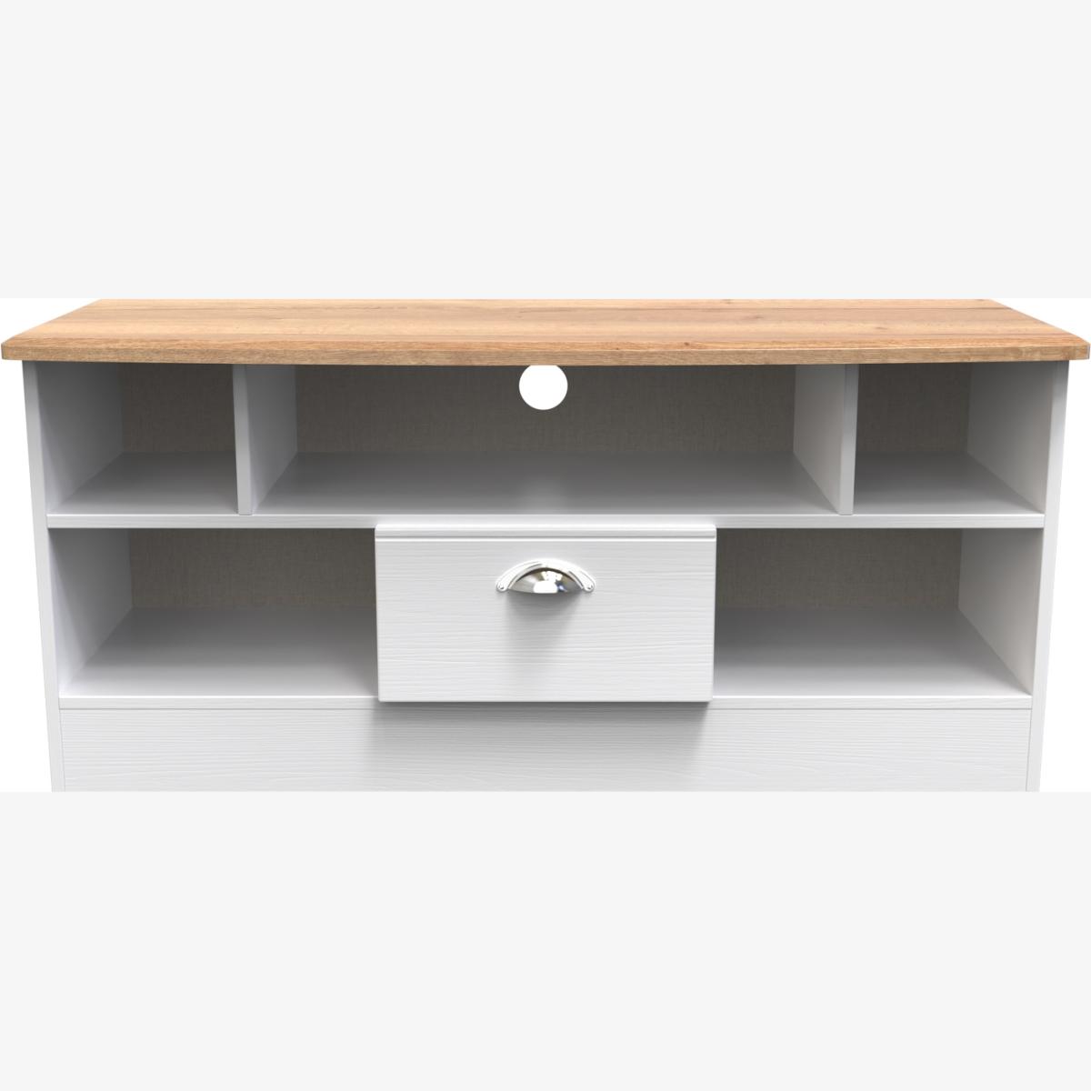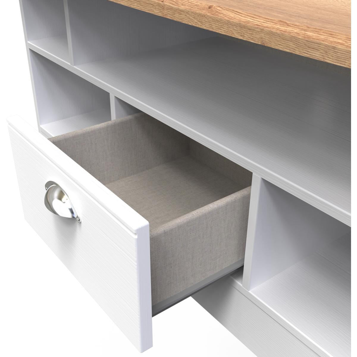 This low level TV Corner unit features plenty of open shelving and a central storage drawer and will support a flat screen TV of up to 50". It easy to create a bedroom that showcases effortless chic, with this stylish range. The shaker-inspired design exudes understated luxury, each piece is finished in a number of colours with brushed steel handles and the option of a contrasting oak effect top. A well-thought-out mix of hanging and flat storage that suitable for any room. All our furniture is made in the United Kingdom, to the highest quality. It is delivered direct to your location of choice by one of our two man delivery teams, and come full assembled (although legs may be removed to prevent damage in transit).