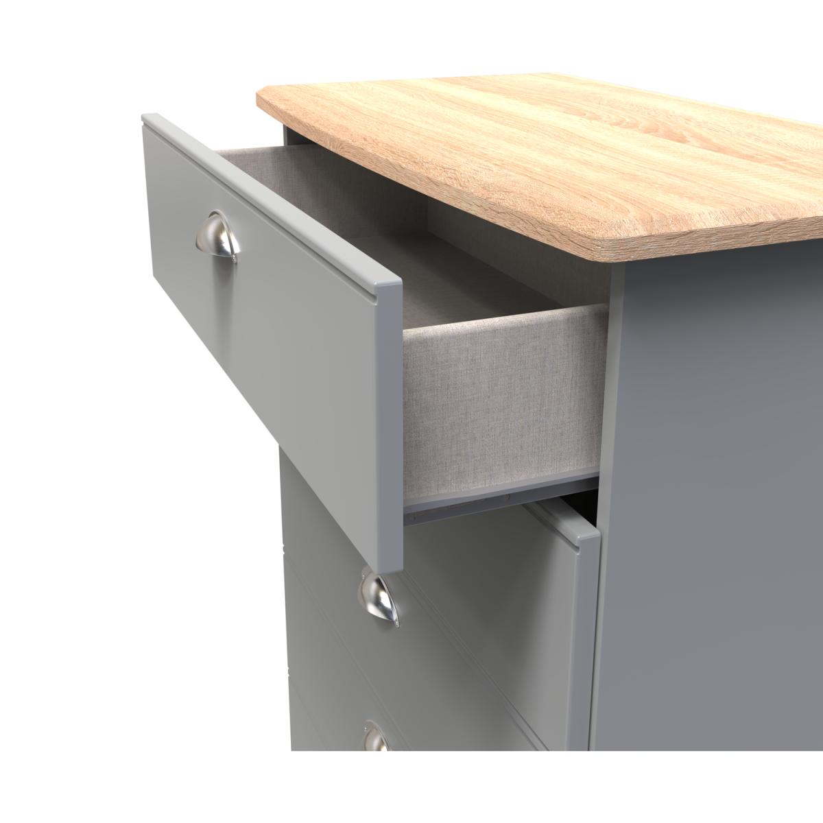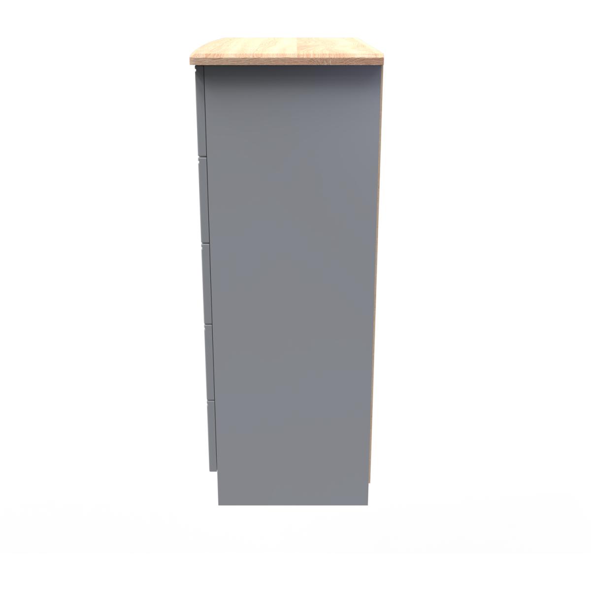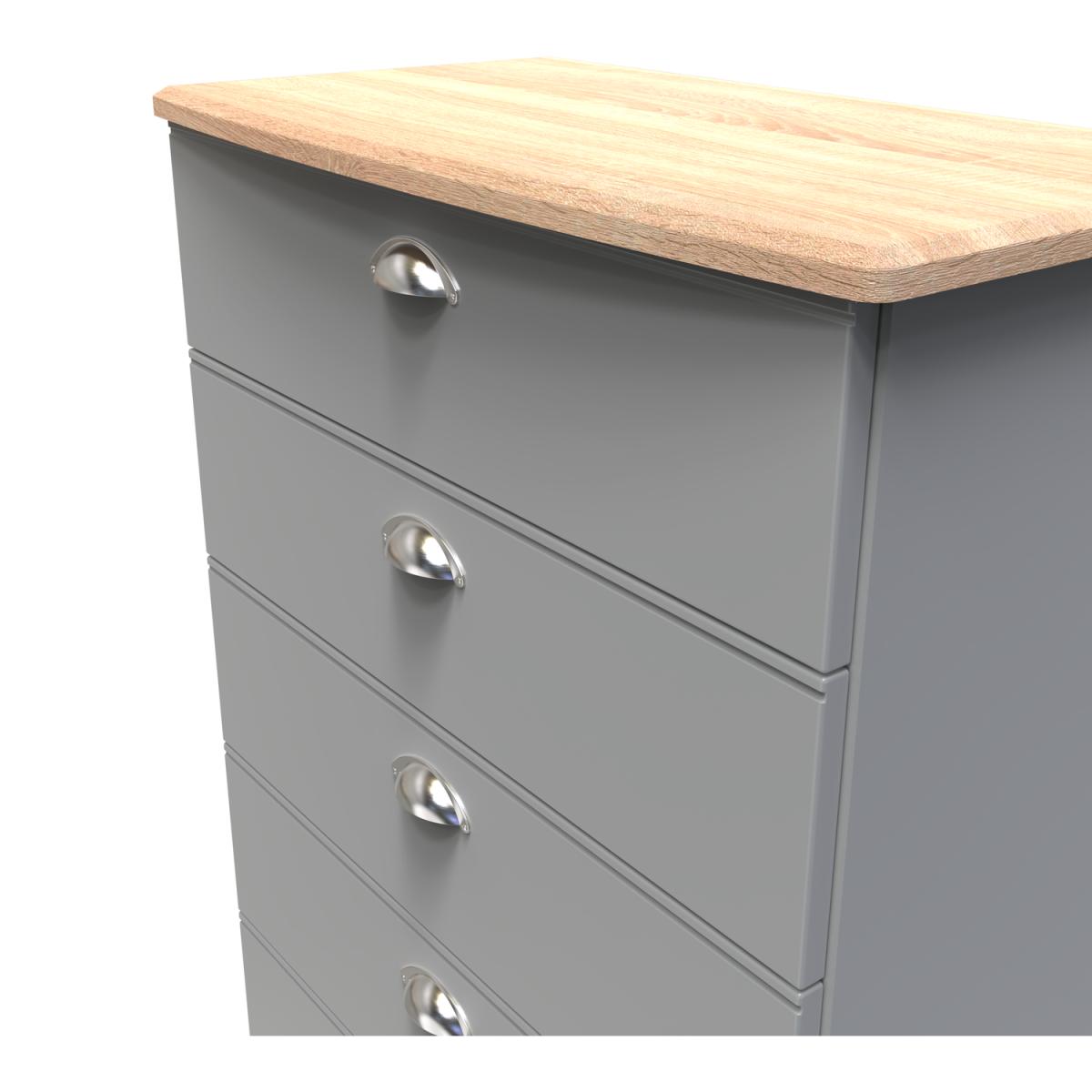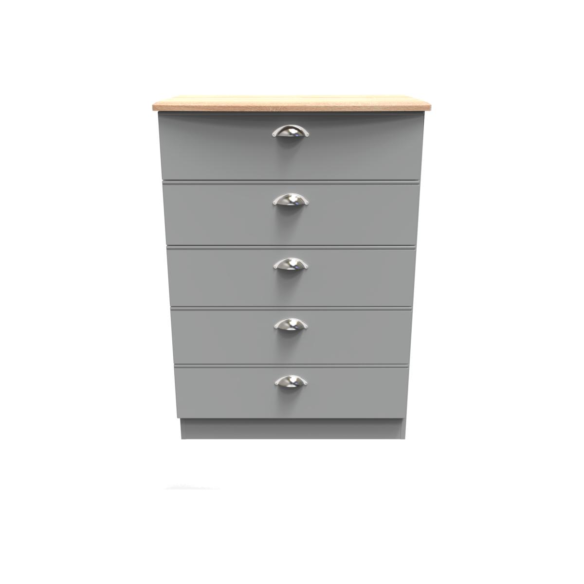 This wide 5 drawer chest of drawers is practical and stylish. Perfect for any home as a free standing storage unit. It easy to create a bedroom that showcases effortless chic, with this stylish range. The shaker-inspired design exudes understated luxury, each piece is finished in a number of colours with brushed steel handles and the option of a contrasting oak effect top. A well-thought-out mix of hanging and flat storage that suitable for any room. All our furniture is made in the United Kingdom, to the highest quality. It is delivered direct to your location of choice by one of our two man delivery teams, and come full assembled (although legs may be removed to prevent damage in transit).