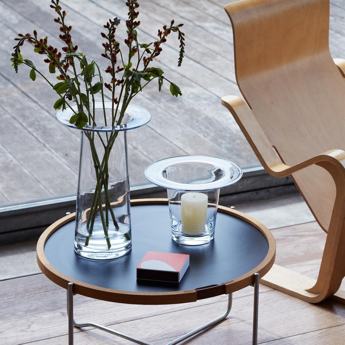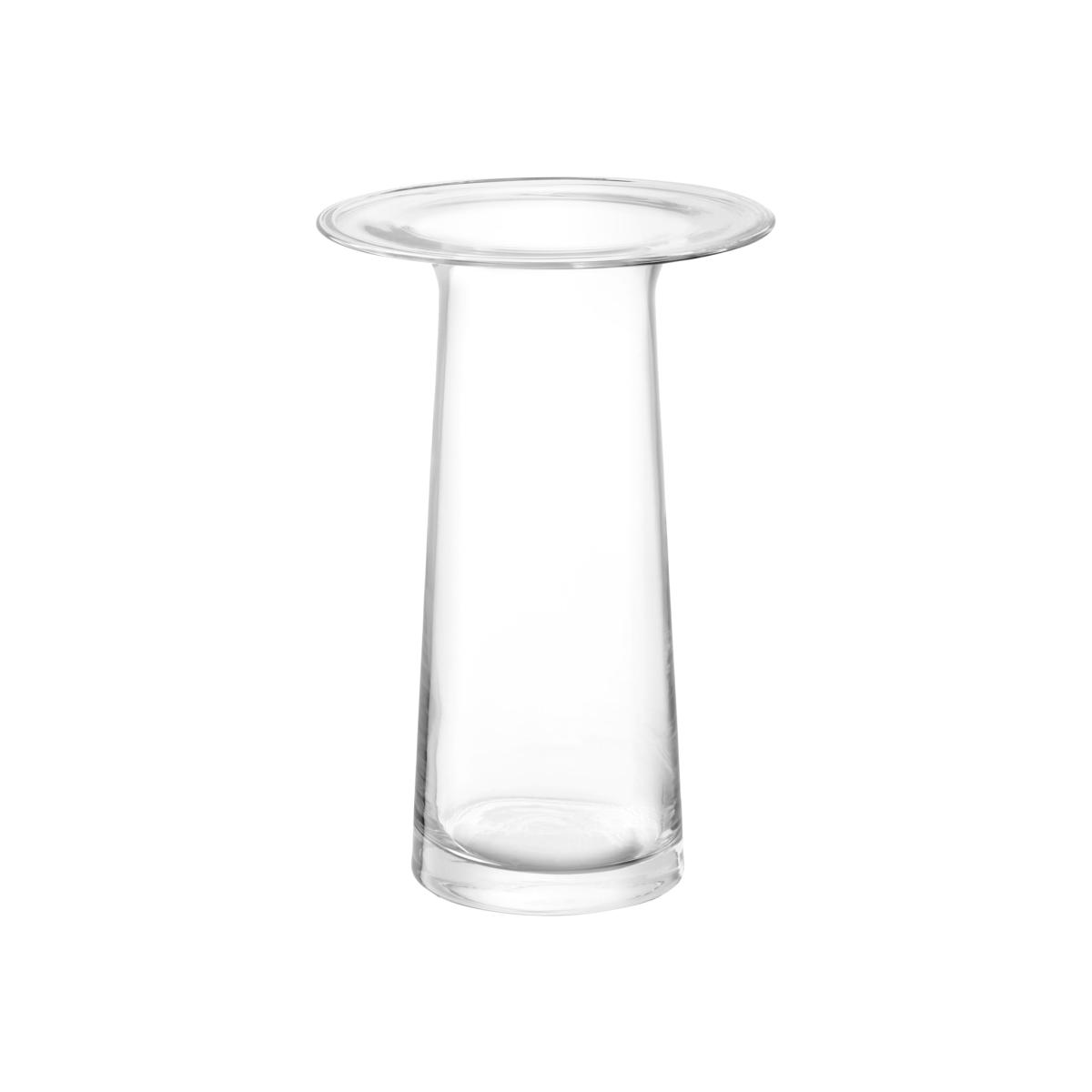 A mouth-blown vase with thick walls that fold outwards at the top into a wide and flat brim. Designed for leafy foliage or generous floral bouquets.