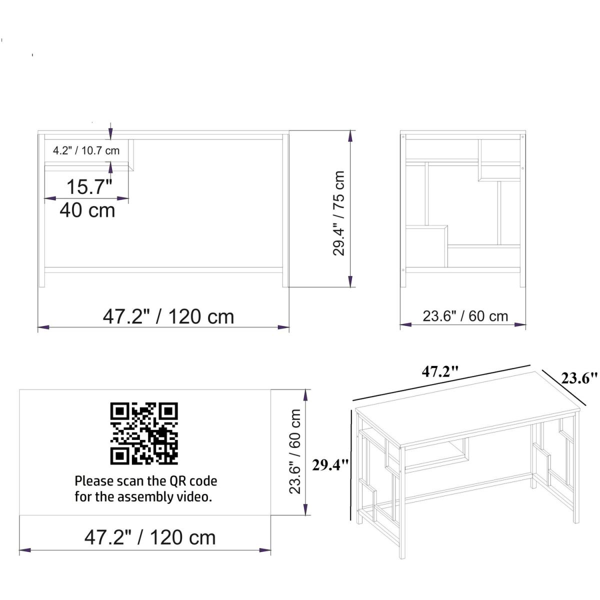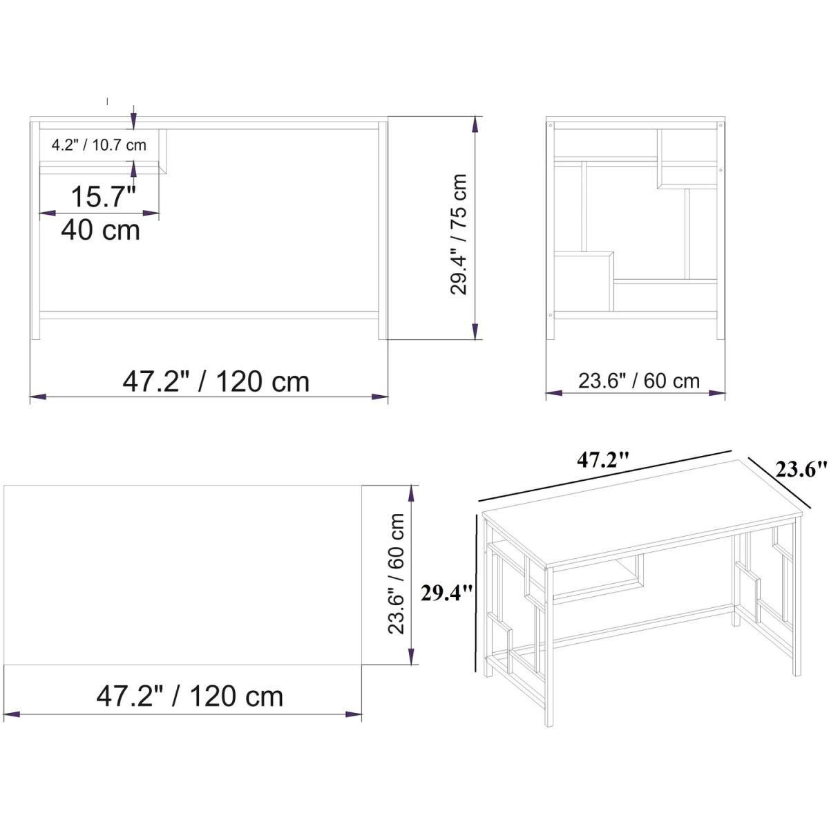 Victory 47" wide metal wood computer desk with a shelf provides ample work/storage space as well as an attractive look that will fit various home/office decorations. The desktop and the shelf are made of 18 mm thick melamine coated particle board and banded with PVC edge band, while the frame/legs are constructed from iron metal. Metal parts are coated with scratch and impact-resistant industrial static paint. It is manufactured using health-friendly materials.