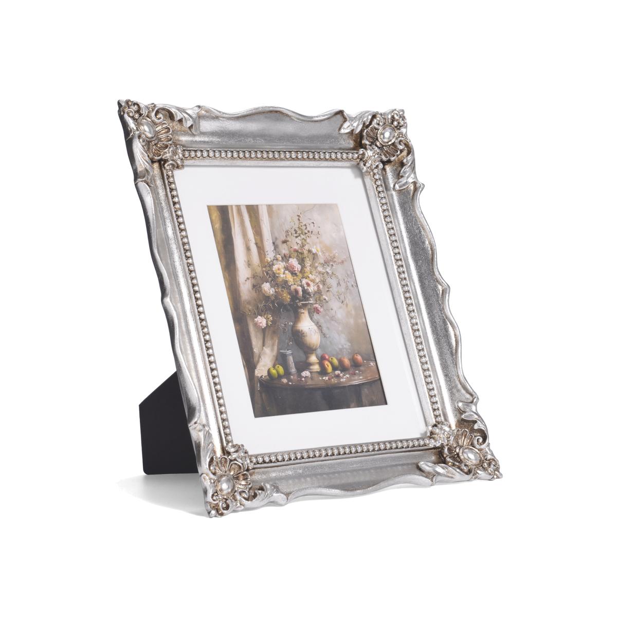 Empower your home with elegance with this Victorian Style Embossed Floral Picture Frame, featuring intricate floral detailing crafted with delicate care and a hand-finished silver-coloured finish. Perfect for displaying your cherished 8x10 inch photographs, the removable white mat also allows you to showcase 5x7 inch photos with a professional border. The luxurious velvet backplate includes an integrated easel stand for tabletop or mantelpiece display, whilst convenient hooks on the reverse enable versatile wall mounting in either portrait or landscape orientation. A sturdy glass front protects your precious memories from dust and damage, making this ornate frame ideal for vintage-inspired interiors, traditional decor schemes, or as a thoughtful gift for weddings, anniversaries, and special occasions.