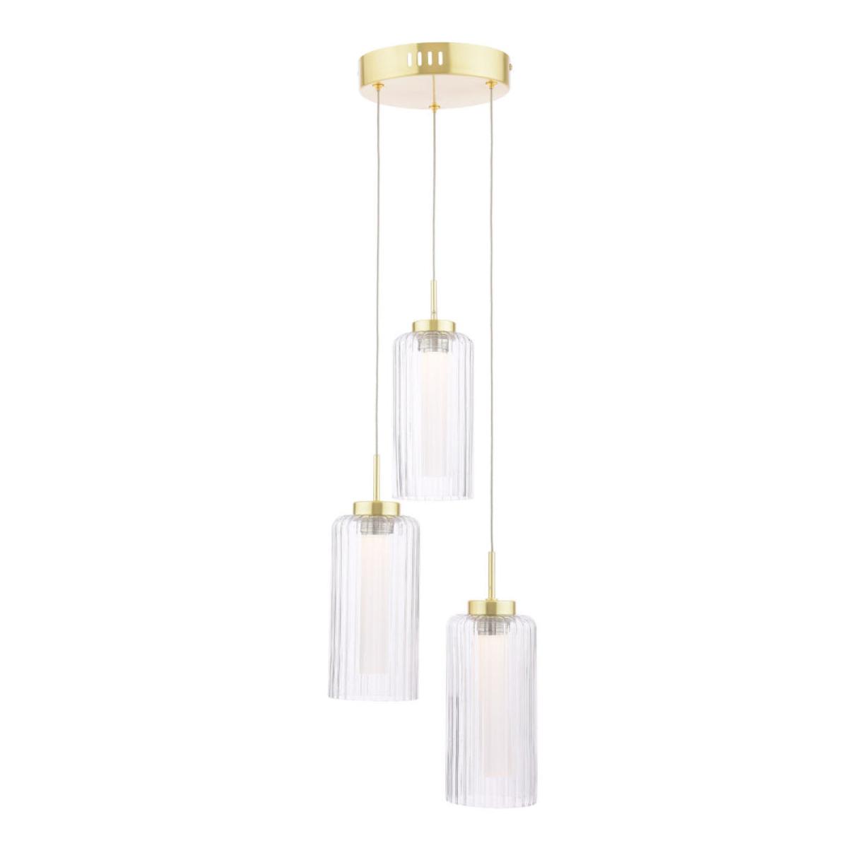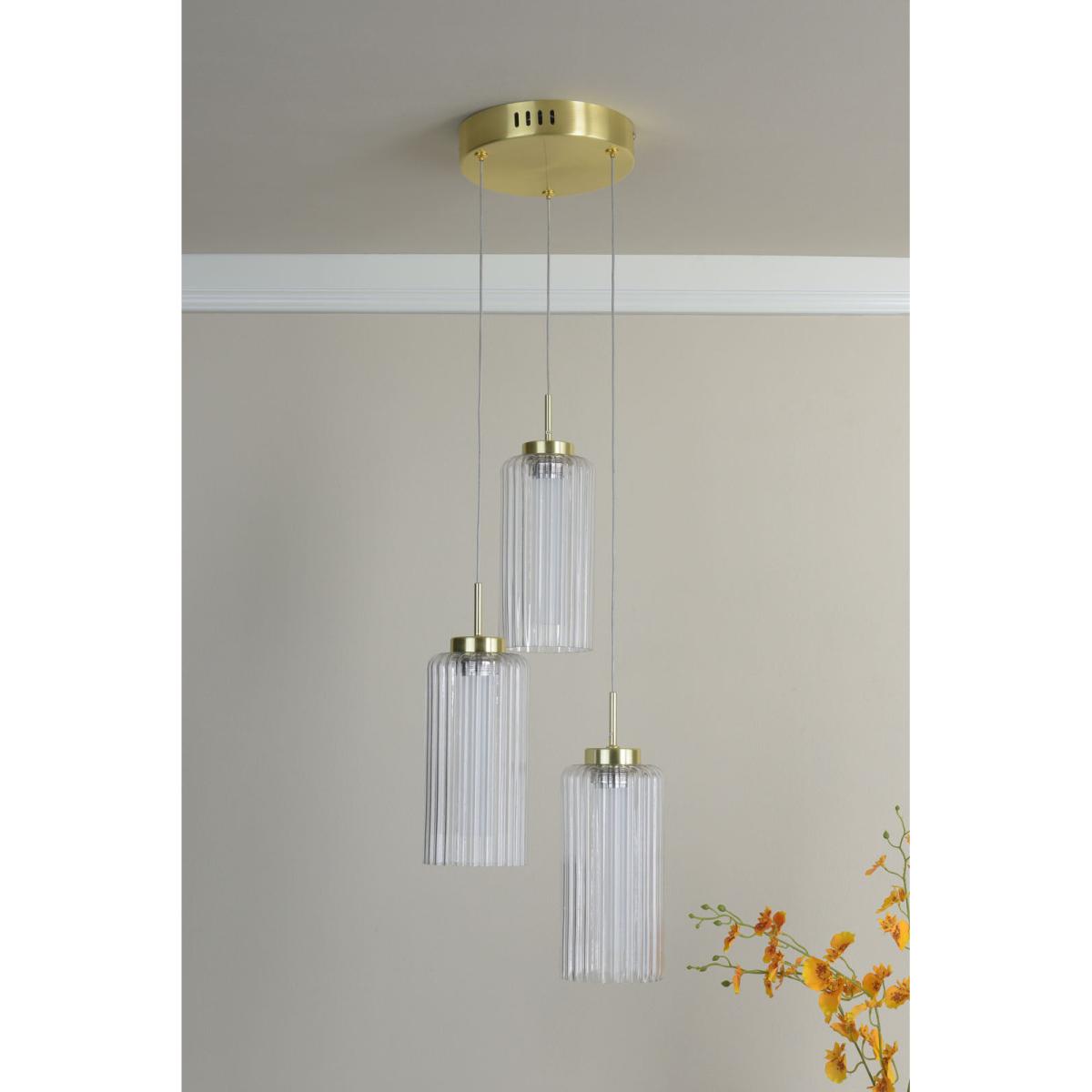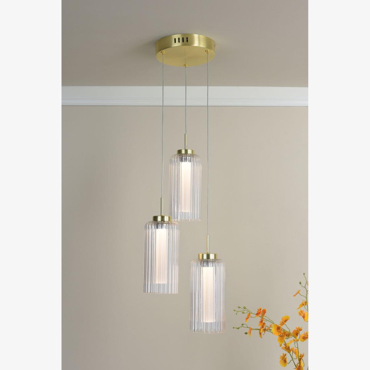 Combines modern elegance with timeless charm. Featuring a satin brass finish and clear ribbed glass shades, this pendant creates a soft, radiant glow while adding sophistication to any space. Perfect for installation above kitchen islands, dining tables, or stairwells, the cascading design brings height and visual interest to contemporary interiors.