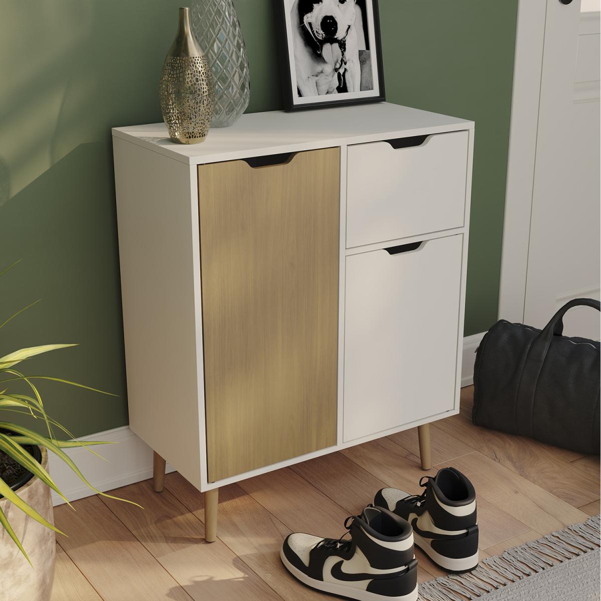 I like this Vida sideboard for its clean lines and mix of oak-effect and white finishes, which instantly lift a hallway or living room without overwhelming the space. Its compact footprint suits smaller flats or narrow corridors, while the internal shelves and drawer keep keys, shoes or paperwork neatly hidden. To style it, place a low-profile plant and slim-frame artwork on top, then add a woven basket inside or underneath for extra storage. Pair with soft greys, muted greens or black-and-white photography to reinforce its Scandi-modern look and ensure the form stays front and centre.
