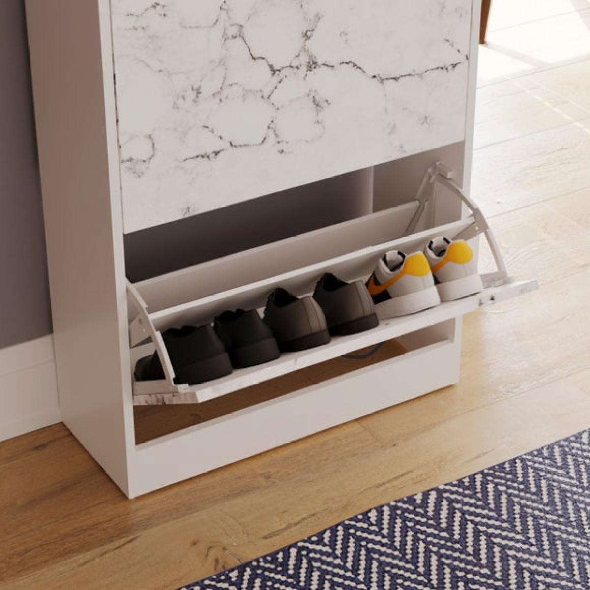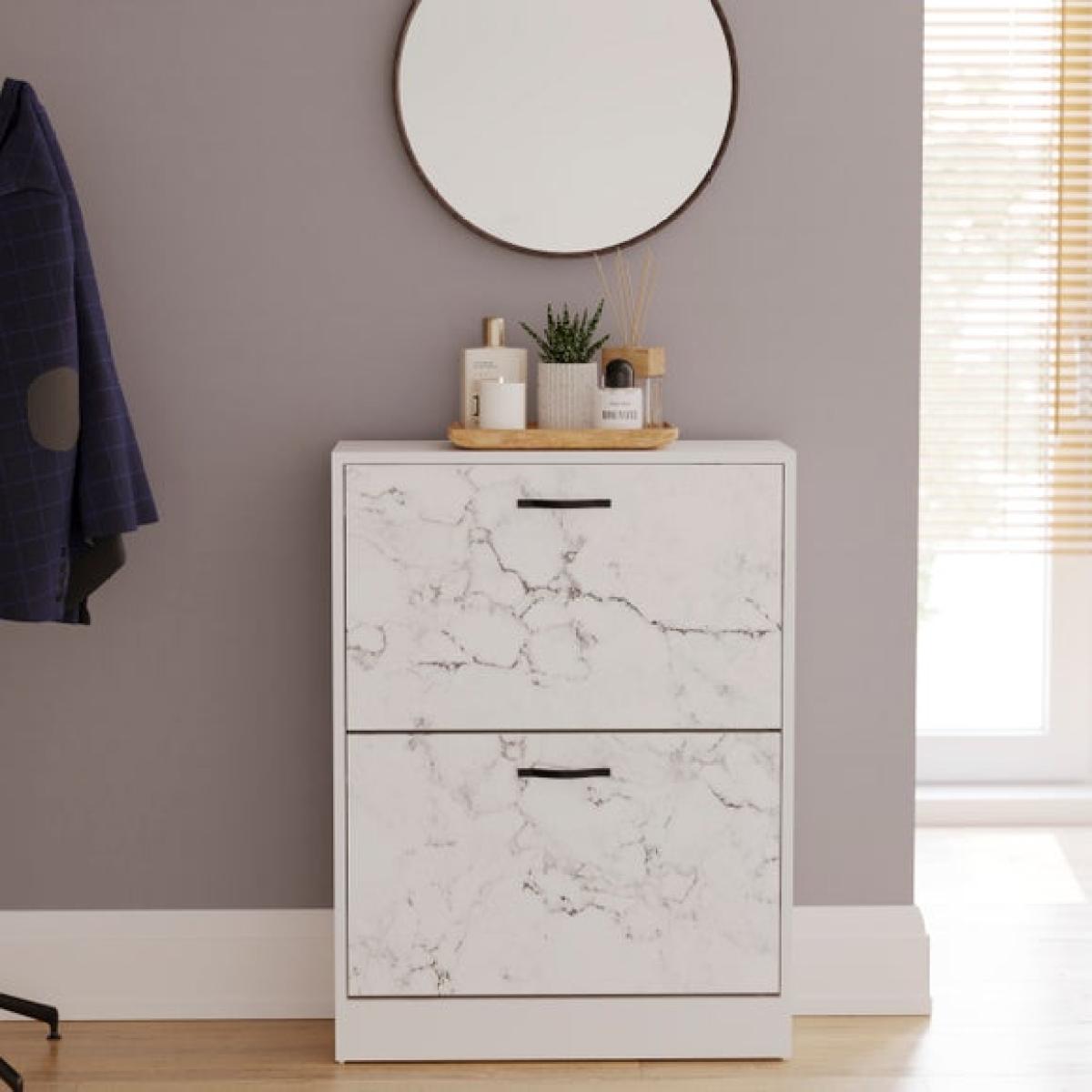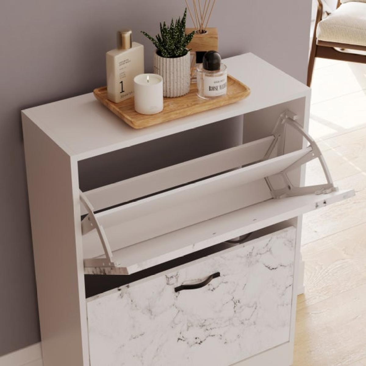 * Contemporary design with a marble effect finish * Stainless steel handles for a clean, modern look * Two drawers hold up to eight pairs of shoes Designed to keep your space neat without taking over the room. This cabinet pairs a sleek marble effect finish with a modern silhouette that works well in any setting. Stainless steel handles add a polished touch while making each drawer easy to open. With space for up to eight pairs of shoes, it’s a tidy solution for busy households. The compact shape fits neatly into hallways, bedrooms or anywhere short on storage. Built from durable materials and available in a range of colours.