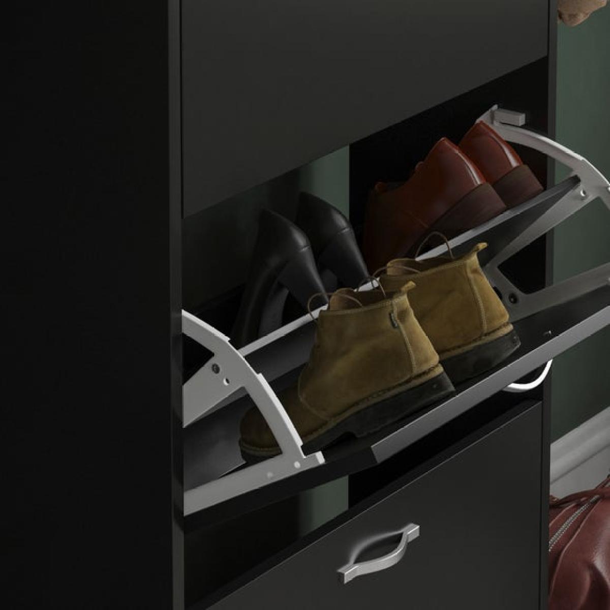 I love this shoe cabinet for its sleek, minimalist design, making it a versatile addition to many interiors, from modern flats to more contemporary hallways. Its discreet, streamlined look helps keep clutter out of sight, while the three-tier storage offers practical organisation for shoes of various sizes. Styling tips include pairing it with a matching console or sideboard to create a cohesive look, or placing decorative baskets on top for additional storage. It works particularly well in neutral or monochrome schemes, as it can seamlessly blend into both small and spacious entryways. Just remember to keep the area around it clear to optimise its functionality and maintain a tidy entrance.