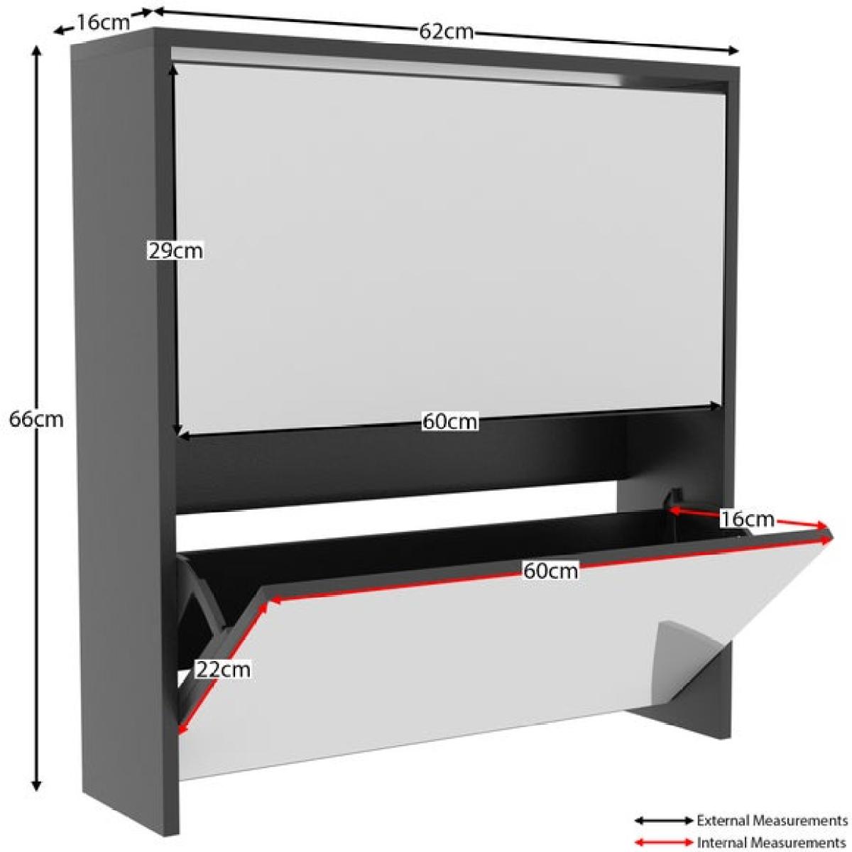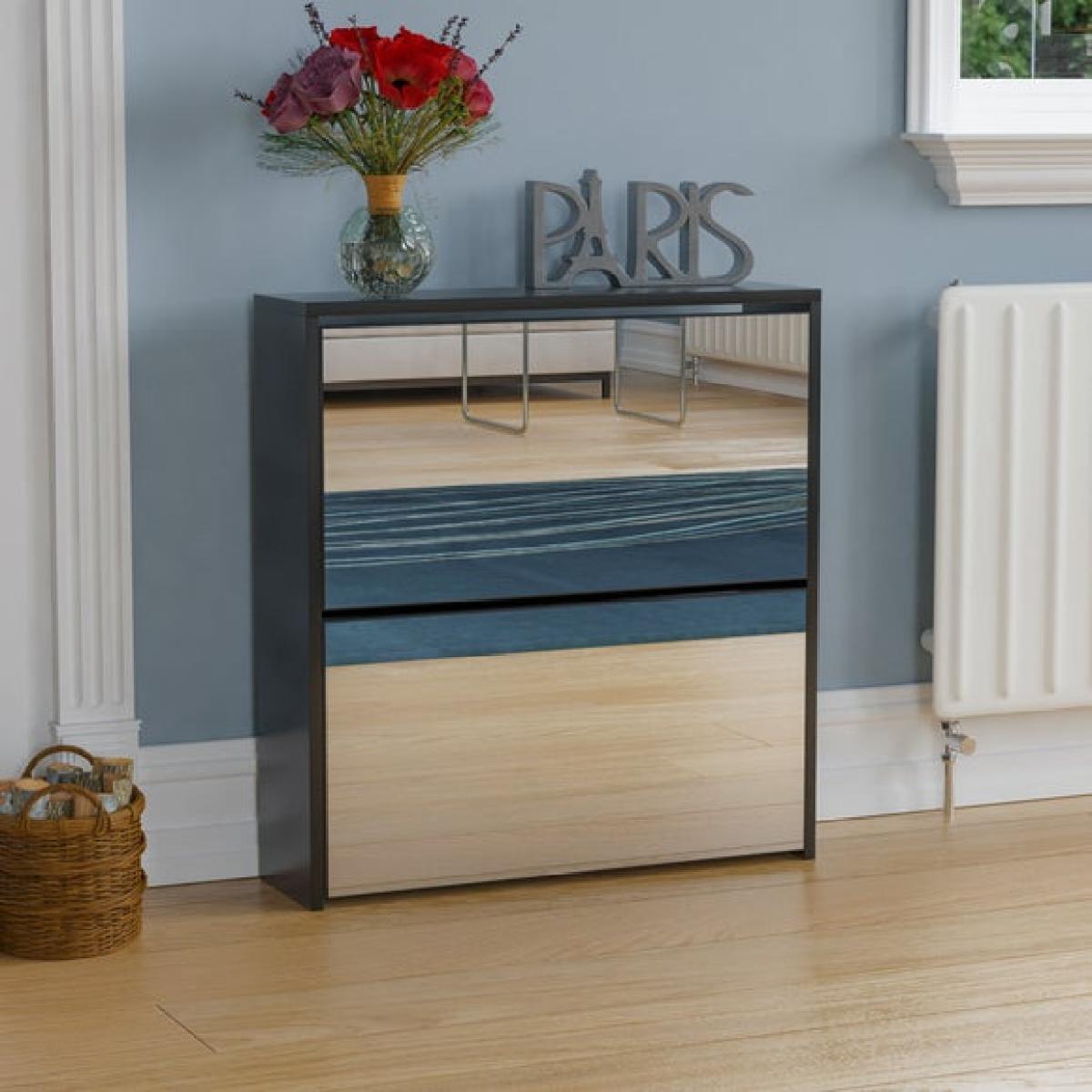 * Mirrored fronts reflect light and add depth * Sleek design works well in modern spaces * Two drawers store up to eight pairs of shoes A neat way to keep shoes tucked away and your space looking brighter. This cabinet features mirrored drawer fronts that reflect light and help smaller rooms feel more open. Its modern design blends easily with a range of interiors, and the handle-free drawers keep the look clean and uncluttered. Two drawers offer space for up to eight pairs of shoes, keeping everyday clutter out of sight. The compact shape makes it a smart fit for hallways, bedrooms or anywhere short on storage. Built from durable materials and available in a range of colours.
