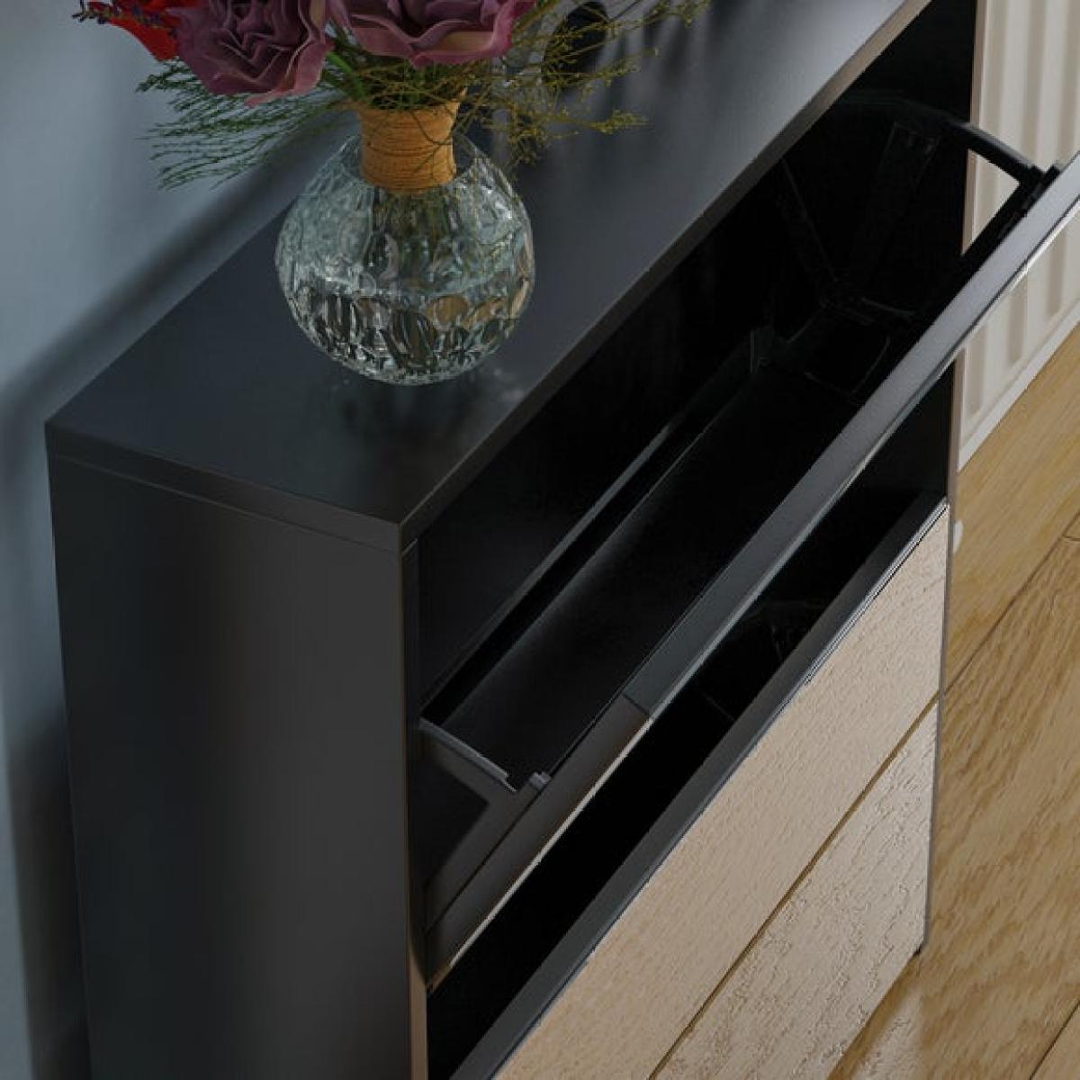 I love this shoe cabinet for its sleek, modern design that combines practicality with style. The mirrored front not only helps to save space visually but also adds a touch of contemporary elegance, making it a versatile piece for hallways or bedrooms. It works well in minimalist, Scandinavian, or modern interiors where clean lines and functional furnishings are key. Practical styling tips include pairing it with matching accessories like a simple coat stand or decorative baskets to keep shoes organised, or placing it near a statement mirror or artwork for a balanced, cohesive look. Its compact footprint makes it ideal for smaller spaces, and the two-tier design ensures ample storage without feeling bulky.