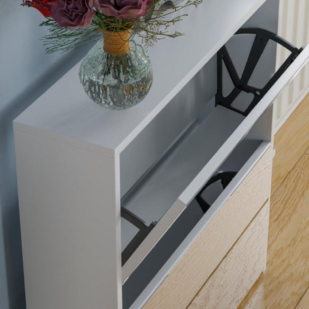 I love this shoe cupboard for its sleek, modern look and clever use of mirrors that help make even small hallways feel more spacious. Its two-tier design keeps footwear neatly organised, while the mirrored front adds a practical touch for quick outfit checks. It works particularly well in contemporary or minimalist interiors, balancing function with clean aesthetics. To style around it, consider keeping the top surface clear with a few decorative pieces like a vase or some artwork to soften the utilitarian look. Placing it near a bench or mirror can create a practical entryway station, making it both stylish and functional.
