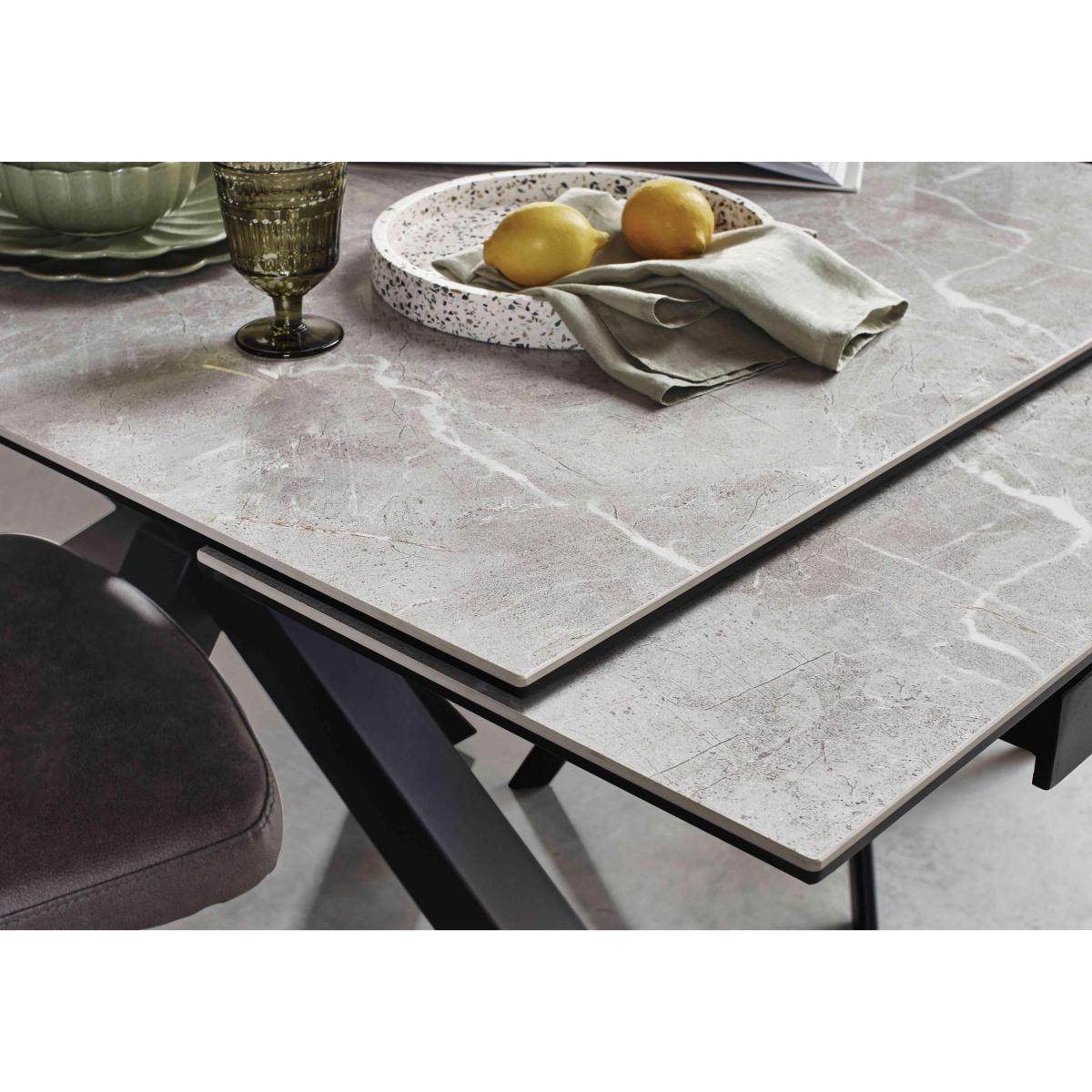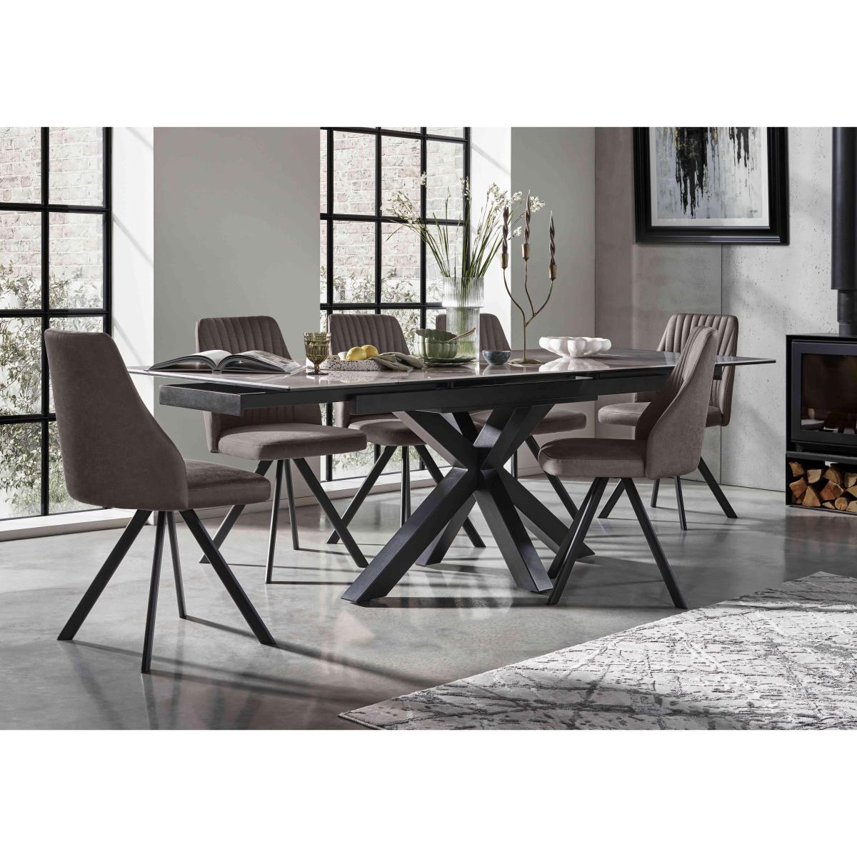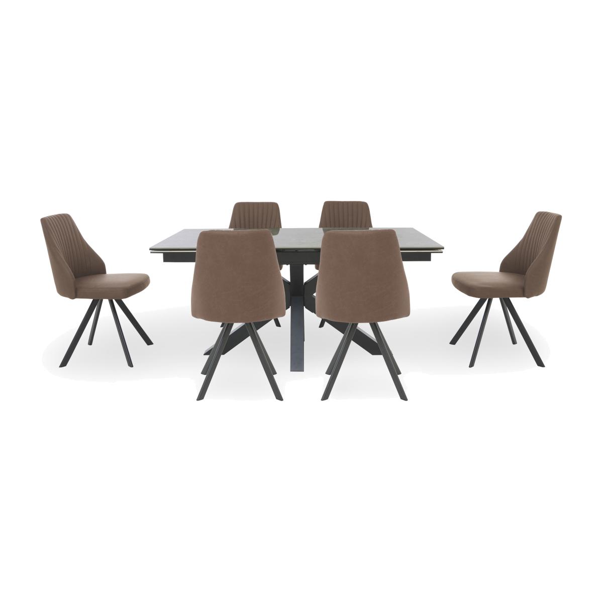 Glamour with a distinctive modern edge? You’ll find precisely that in our Vida collection of dining tables, dining sets and sideboards. Offered in a choice of two marble-effect ceramic finishes – sophisticated grey and traditional Carrara – the range’s extending dining tables and bar tables combine high-gloss surfaces with angled powder-coated metal bases. Sumptuously cushioned and upholstered, Vida swivel dining chairs and bar stools add more than a touch of luxury to any dining space. With its sleek style and seamless functionality in the form of effortless table extension mechanisms and self-returning swivel chair bases, our Vida range redefines glam style for the modern home. This dining set is everything we love about modern glam style. It has a sleek ceramic table top with an even sleeker extension mechanism plus superbly comfortable seating. Why you'll love it The essence of modern glam style with a distinctly urban edge. Statement-making dining set with fabulous extending dining table. Glossy grey marble-effect ceramic table top is super-durable and very stylish. Ceramic is scratch-resistant, chip-resistant, heat-resistant and so easy to clean. Black powder-coated steel base has a textured finish. Extension leaves seamlessly slide out from the table ends. Set includes 6 dining chairs with self-returning swivel bases. Soft faux leather upholstery in a choice of colours. Also available with a high-gloss, white Carrara marble-effect ceramic dining table. This dining set is part of the Vida range. What you need to know Dining chairs are cushioned with foam and have black powder-coated steel legs. Dining table seats 6 closed and 10 when extended. Please note that the ceramic table top is not 100% heatproof. We recommend using coasters and placemats at all times. Part of our modern glam Vida collection of dining room furniture.