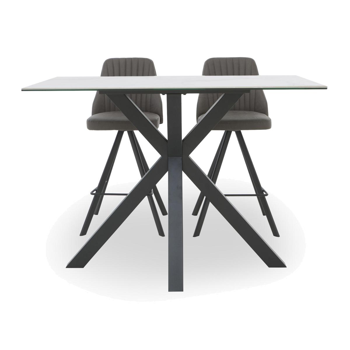 Glamour with a distinctive modern edge? You’ll find precisely that in our Vida collection of dining tables, dining sets and sideboards. Offered in a choice of two marble-effect ceramic finishes – sophisticated grey and traditional Carrara – the range’s extending dining tables and bar tables combine high-gloss surfaces with angled powder-coated metal bases. Sumptuously cushioned and upholstered, Vida swivel dining chairs and bar stools add more than a touch of luxury to any dining space. With its sleek style and seamless functionality in the form of effortless table extension mechanisms and self-returning swivel chair bases, our Vida range redefines glam style for the modern home. Bring opulence and elegance to a compact dining space with the Vida Carrara marble-effect ceramic bar table and pair of swivel bar stools. Why you'll love it The essence of modern glam style with a distinctly opulent finish. Statement-making bar table seats six. High-gloss white Carrara marble-effect ceramic top is super-durable and very stylish. Ceramic is scratch-resistant, chip-resistant, heat-resistant and so easy to clean. Black powder-coated steel base has a textured finish. Set includes 2 bar stools with self-returning swivel bases. Soft faux leather upholstery in a choice of colours. Also available with a glossy grey marble-effect ceramic bar table. This bar table dining set is part of the Vida range. What you need to know Bar stools are cushioned with foam and have black powder-coated steel legs. Bar table seats 6. Please note that the ceramic table top is not 100% heatproof. We recommend using coasters and placemats at all times. Part of our modern glam Vida collection of dining room furniture.