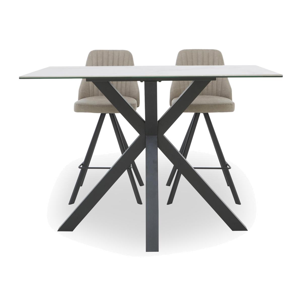 Glamour with a distinctive modern edge? You’ll find precisely that in our Vida collection of dining tables, dining sets and sideboards. Offered in a choice of two marble-effect ceramic finishes – sophisticated grey and traditional Carrara – the range’s extending dining tables and bar tables combine high-gloss surfaces with angled powder-coated metal bases. Sumptuously cushioned and upholstered, Vida swivel dining chairs and bar stools add more than a touch of luxury to any dining space. With its sleek style and seamless functionality in the form of effortless table extension mechanisms and self-returning swivel chair bases, our Vida range redefines glam style for the modern home. Bring opulence and elegance to a compact dining space with the Vida Carrara marble-effect ceramic bar table and pair of swivel bar stools. Why you'll love it The essence of modern glam style with a distinctly opulent finish. Statement-making bar table seats six. High-gloss white Carrara marble-effect ceramic top is super-durable and very stylish. Ceramic is scratch-resistant, chip-resistant, heat-resistant and so easy to clean. Black powder-coated steel base has a textured finish. Set includes 2 bar stools with self-returning swivel bases. Soft faux leather upholstery in a choice of colours. Also available with a glossy grey marble-effect ceramic bar table. This bar table dining set is part of the Vida range. What you need to know Bar stools are cushioned with foam and have black powder-coated steel legs. Bar table seats 6. Please note that the ceramic table top is not 100% heatproof. We recommend using coasters and placemats at all times. Part of our modern glam Vida collection of dining room furniture.