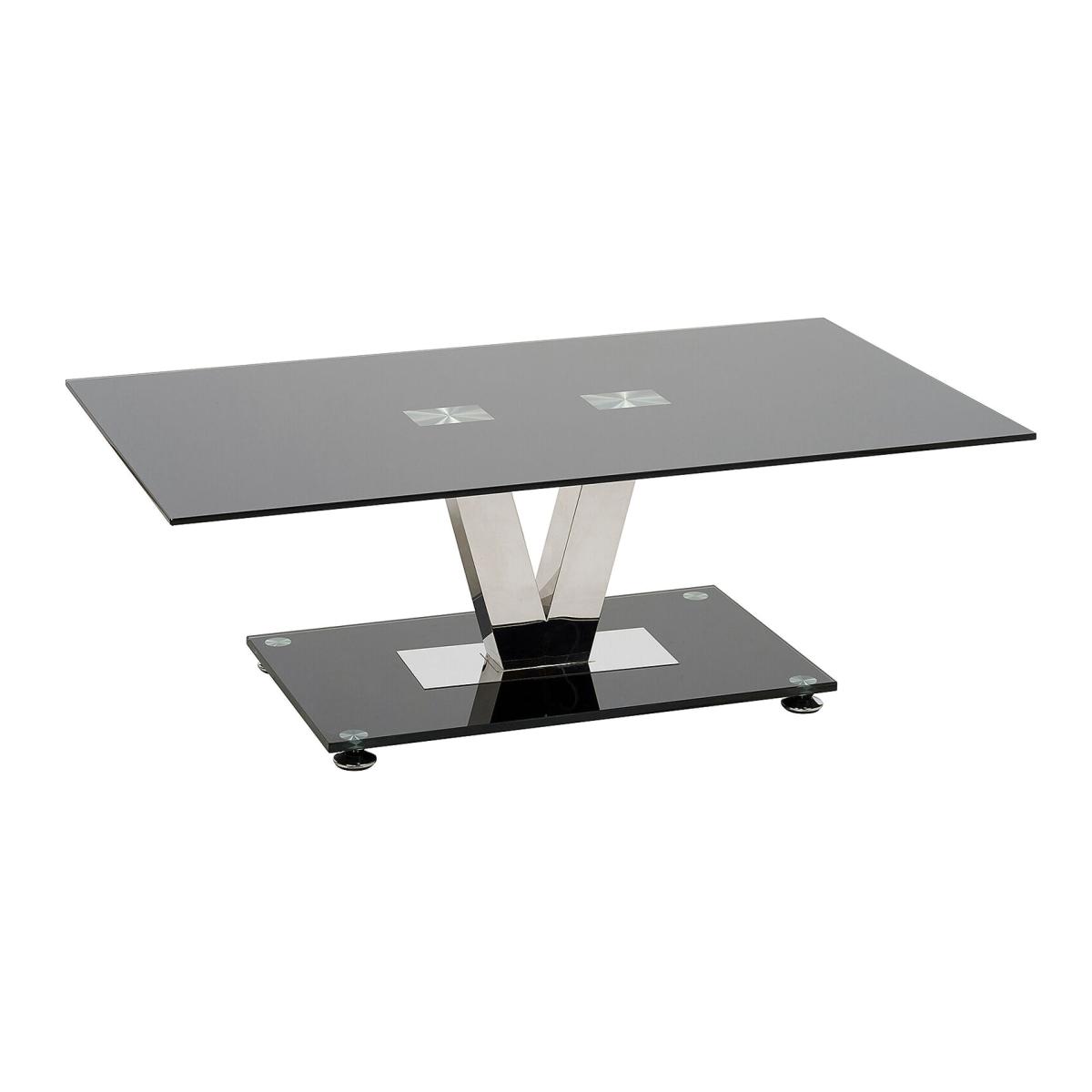 pIdeal for residential or commercial environments, the Vidal designer black living room table is designed to be the focal point of any seating arrangement, with its jet black glass top and stunning V shaped frame it exudes style and confidence.pp. The 10mm thick black glass top is supported by a polished stainless steel V shaped frame which sits on top of a 10mm thick toughened black glass base. The black glass top measures 120 x 70 cm, large enough to eat and drink at or casually display a classic coffee table book or designer magazines to create a sophisticated look.pp. The glass top and base are both made of 10mm thick toughened and tempered glass and tested for strength and durability. Attention to detail can be seen in the bevelled edges and subtly rounded corners on each piece of glass for a quality look and feel. The V shaped frame is made from stainless steel specifically for its durability and ease of maintenance over cheaper chrome plated metal.pp. All our black glass coffee tables living room come with a 12 month manufacturers warranty and no quibble 30 day money back guarantee, so you can buy with confidence.p