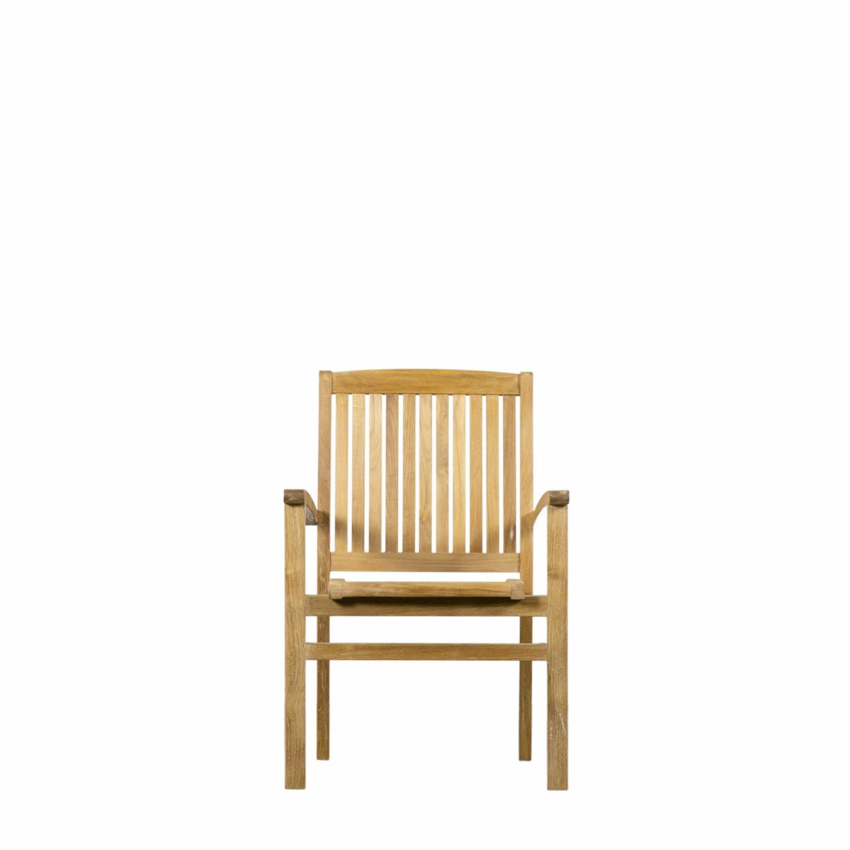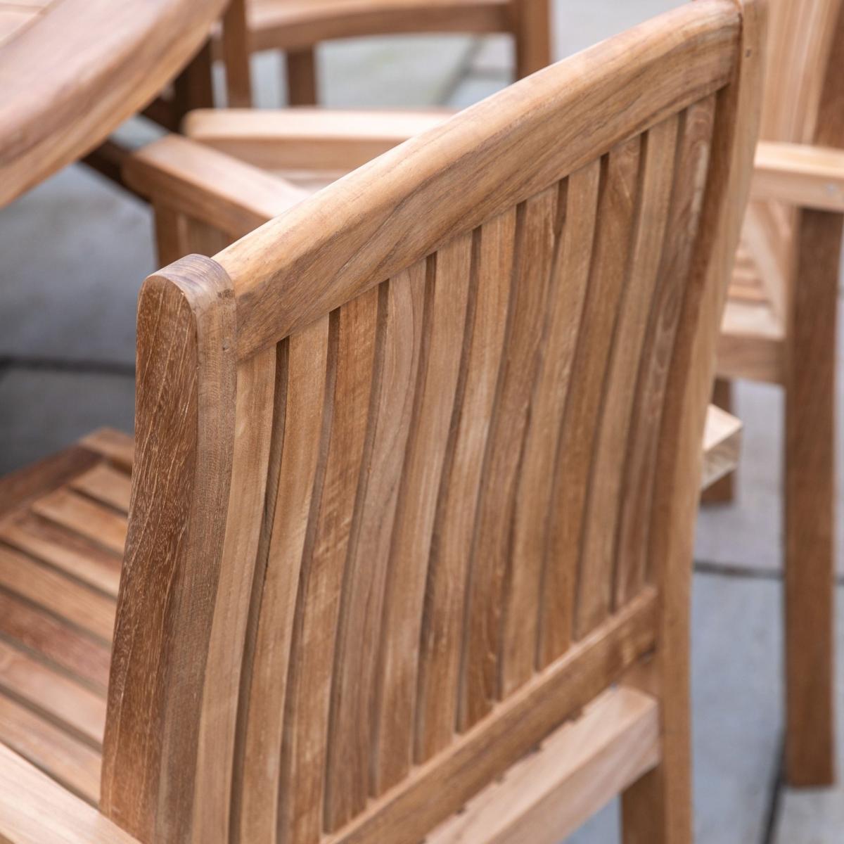 This Stackable Dining Chair is crafted from teak, which is an ideal material for outdoor furniture because of its incredible durability and water resistance. The stylish but practical design allows the chairs to be stacked for storage. It is traditionally built with dowels. There is a matching table.