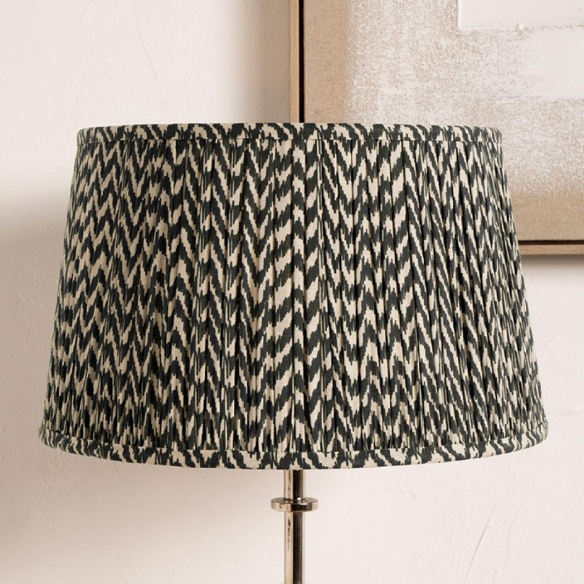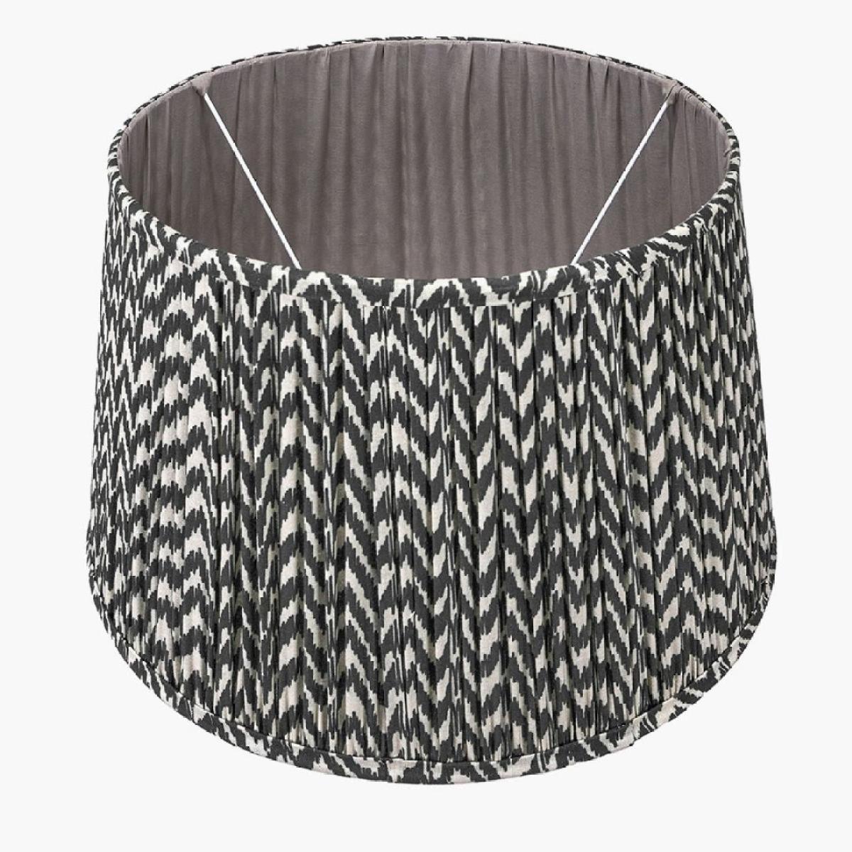 Vienna 50cm cotton tapered shade, featuring a black and white chevron zig zag pattern and mushroom pleating. A striking blend of contemporary design and classic craftsmanship, this eye-catching shade features a bold black and white chevron zigzag pattern, adding a dynamic and modern touch to any room. The intricate mushroom pleating enhances the overall aesthetic, providing texture and depth to the design. With a diameter of 50cm, this Vienna shade is ideal for a variety of fixtures, from larger table lamps to stylish floor lamps and ceiling pendants. Its tapered shape ensures excellent light diffusion, creating a warm and inviting ambiance. The bold chevron pattern, combined with the elegant pleating, makes this shade a standout piece that effortlessly complements both modern and traditional decor styles. Vienna 50cm cotton tapered shade, featuring a black and white chevron zig zag pattern and mushroom pleating. A striking blend of contemporary design and classic craftsmanship, this eye-catching shade features a bold black and white chevron zigzag pattern, adding a dynamic and modern touch to any room. The intricate mushroom pleating enhances the overall aesthetic, providing texture and depth to the design. With a diameter of 50cm, this Vienna shade is ideal for a variety of fixtures, from larger table lamps to stylish floor lamps and ceiling pendants. Its tapered shape ensures excellent light diffusion, creating a warm and inviting ambiance. The bold chevron pattern, combined with the elegant pleating, makes this shade a standout piece that effortlessly complements both modern and traditional decor styles.