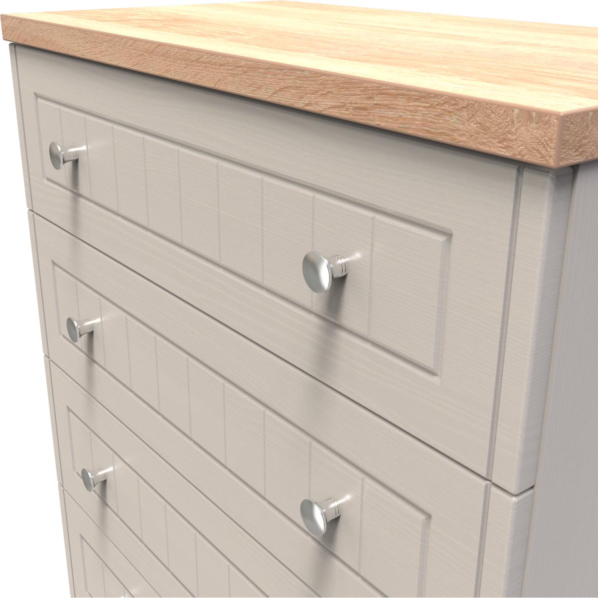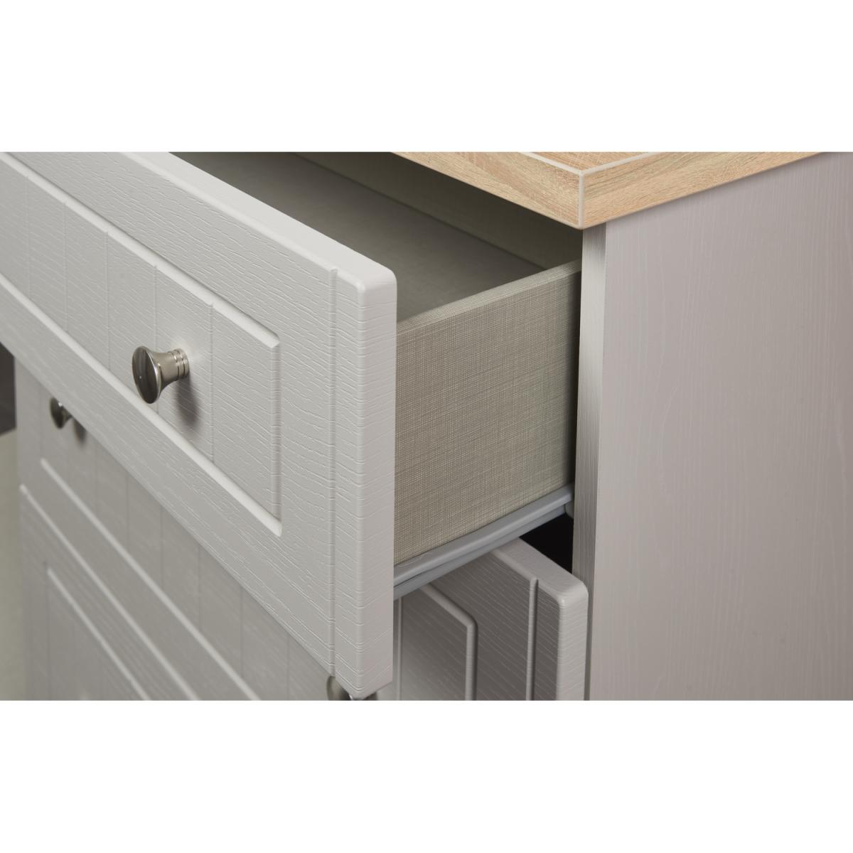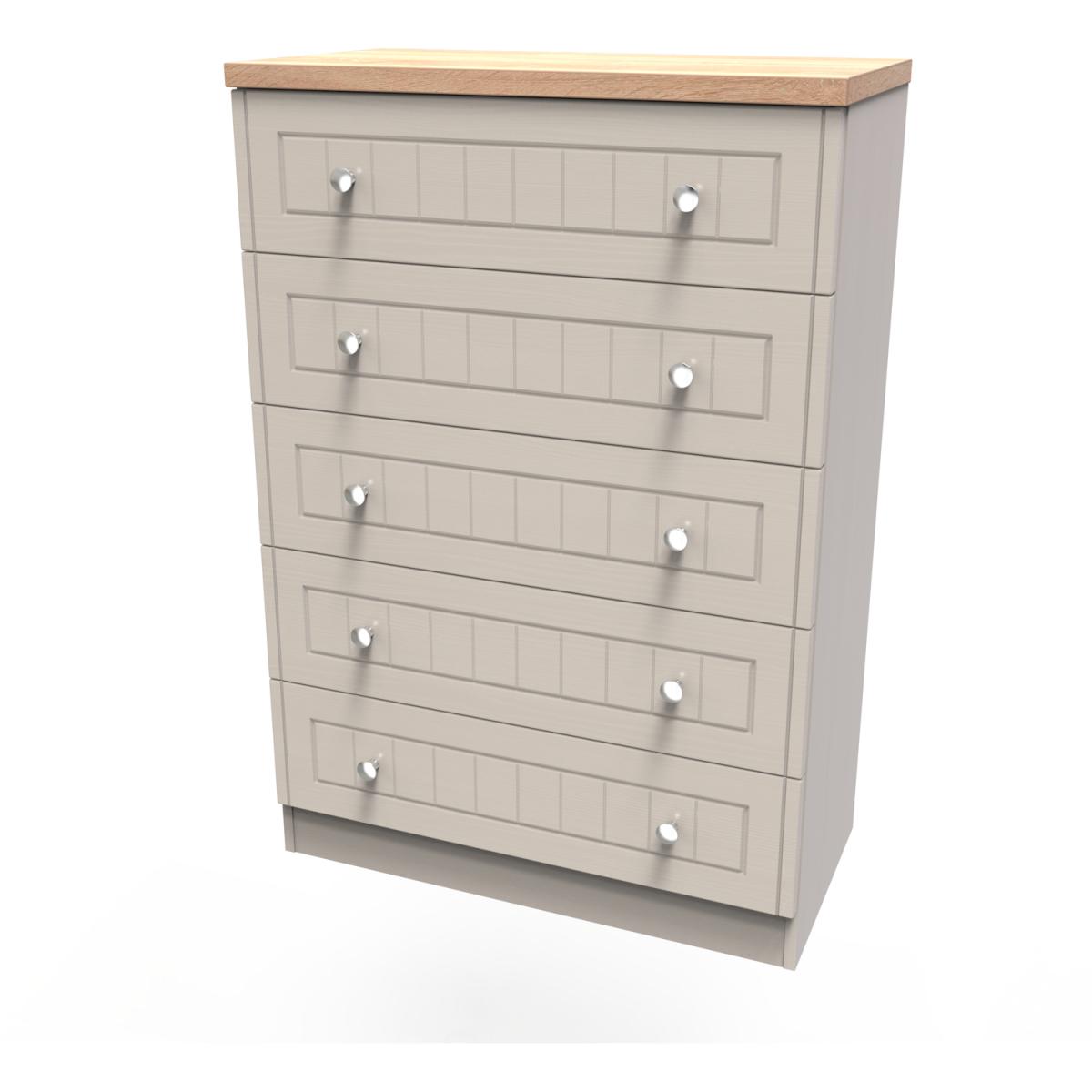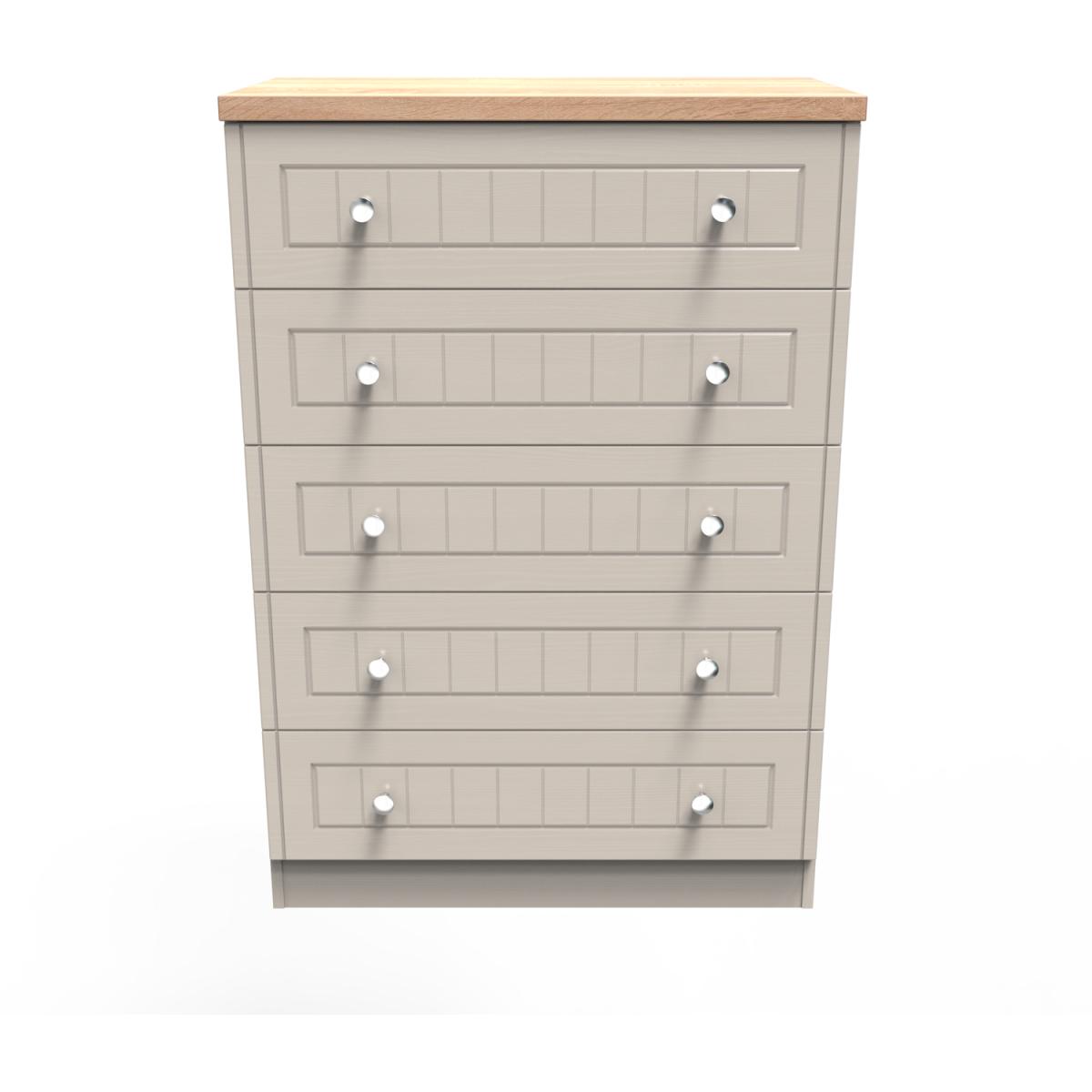 This wide 5 drawer chest of drawers is practical and stylish. Perfect for any home as a free standing storage unit. The classic, elegant Vienna range is available in a variety of painted wood finishes with natural wood effect tops and stylish chrome handles on all doors and drawers. This range boasts a classic and traditional design which will compliment a variety of traditional home dors.. All our furniture is made in the United Kingdom, to the highest quality. It is delivered direct to your location of choice by one of our two man delivery teams, and come full assembled (although legs may be removed to prevent damage in transit).