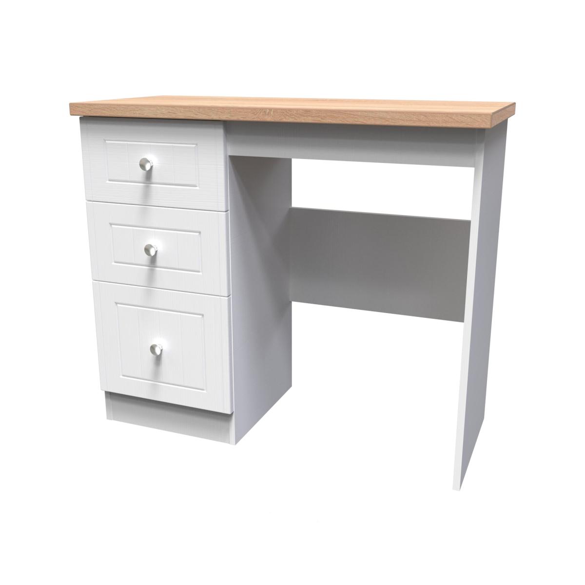 This practical 3 drawer narrow deskvanity is perfect for any bedroom or office. A matching stool and mirror (in 2 sizes) are also available. The classic, elegant Vienna range is available in a variety of painted wood finishes with natural wood effect tops and stylish chrome handles on all doors and drawers. This range boasts a classic and traditional design which will compliment a variety of traditional home dcors.. All our furniture is made in the United Kingdom, to the highest quality. It is delivered direct to your location of choice by one of our two man delivery teams, and comes fully assembled (although legs may be removed to prevent damage in transit).