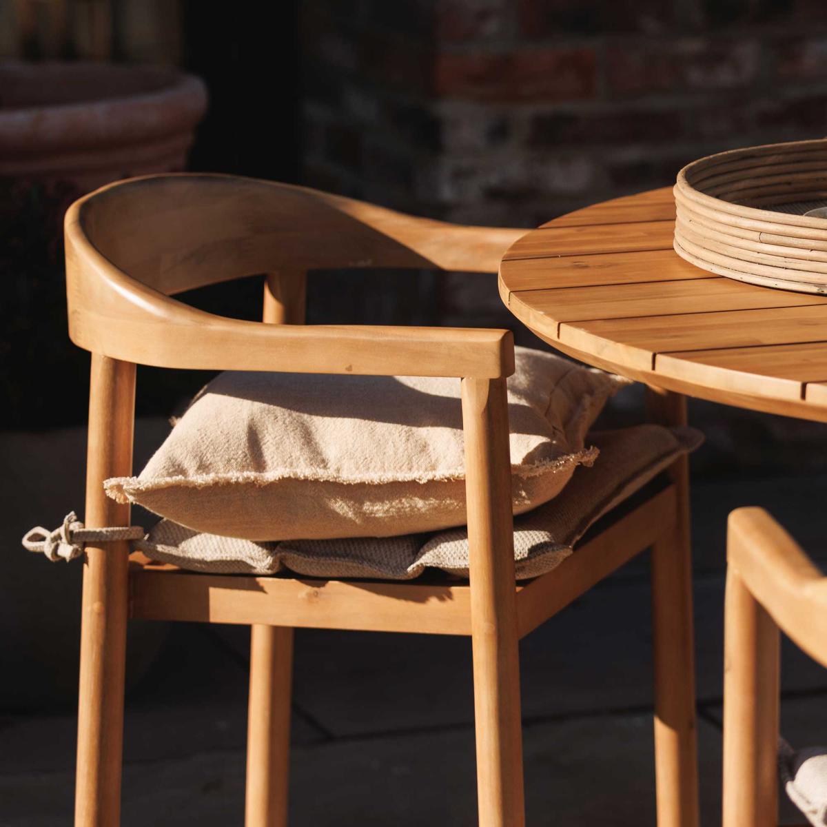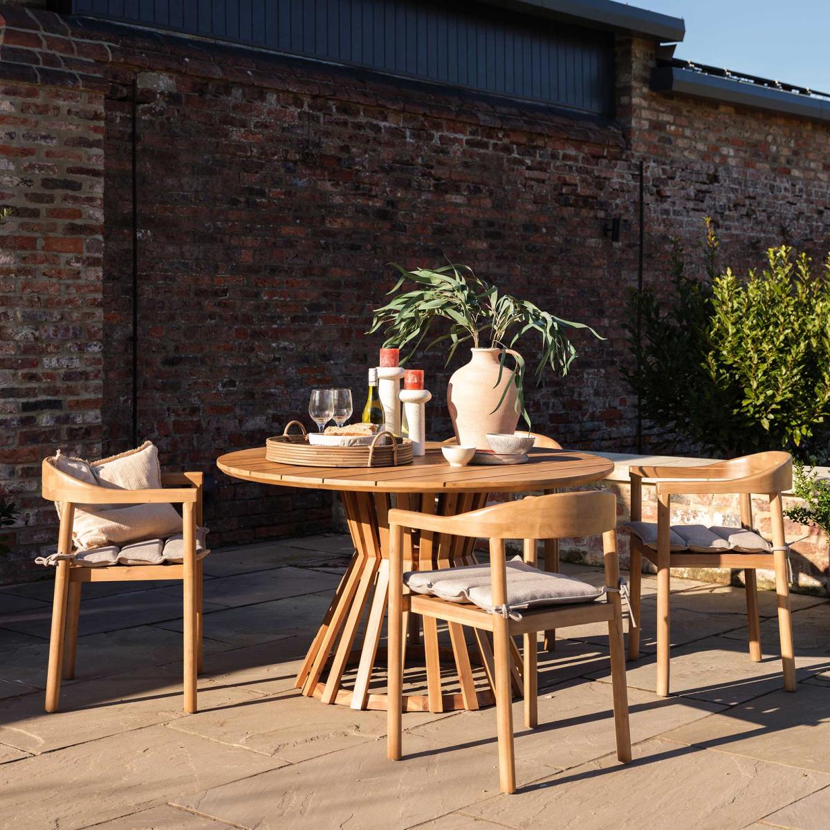 This dining set is a versatile choice that works well in both modern and rustic outdoor spaces. I love its natural wood finish and clean lines, which give it a timeless appeal, while the neutral palette ensures it blends seamlessly into various garden or patio styles. When styling, consider pairing it with understated cushions for added comfort and a pop of colour or pattern to soften the look. It’s perfect for casual family gatherings or outdoor brunches, and because it’s a sturdy yet elegant piece, it can also work indoors in a conservatory or sunroom. Keep the surroundings light and minimal to highlight the quality of the wood, and you’ll have a versatile set that suits any alfresco setting or transitional interior space.
