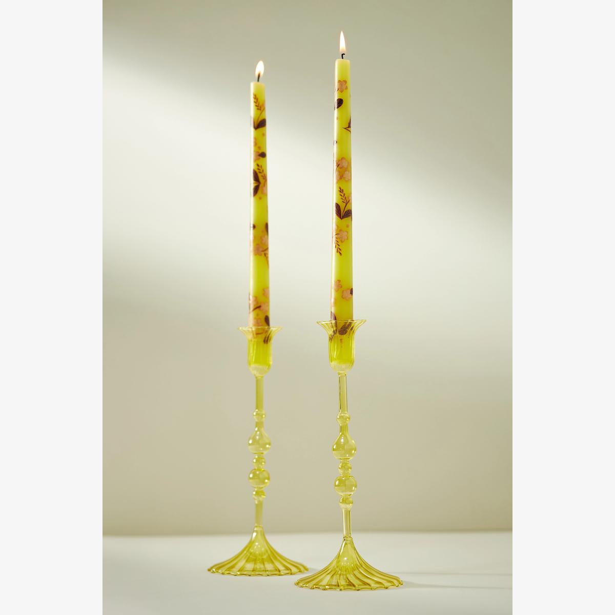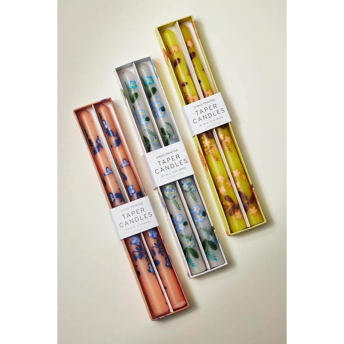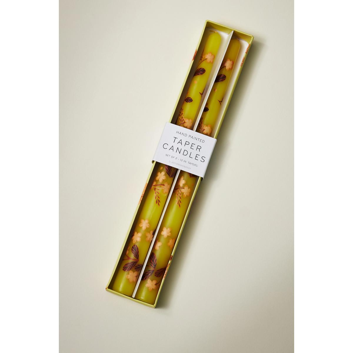 Handpainted detailing makes these tapers the perfect dining table accent or mantel display. *For the best burn experience, keep the following in mind:* * The first time you light your candle, allow it to burn until the wax pool melts all the way to the edge; for a larger candle, this may take several hours. Wax has "memory," so if it is extinguished with a partial pool, that will prevent a full, even pool from forming in the future. * Trim your wick each time you light the candle, removing any "bloom" from the previous burn. We recommend lighting a wick that is 1/4-1/2" in length. * Ensure that your candle is placed on a heat-safe surface. * Do not allow wick trimmings, dust, or other materials to accumulate in the wax pool. * To ensure safety and longevity, be sure to check the bottom of your candle for additional instructions, including details on when to discontinue use. * Set of two * 10-hour burn time * Handpainted sasol wax blend; cotton candle wick * Due to the handpainted nature of this item, expect slight variation in the appearance of each unique piece * Imported